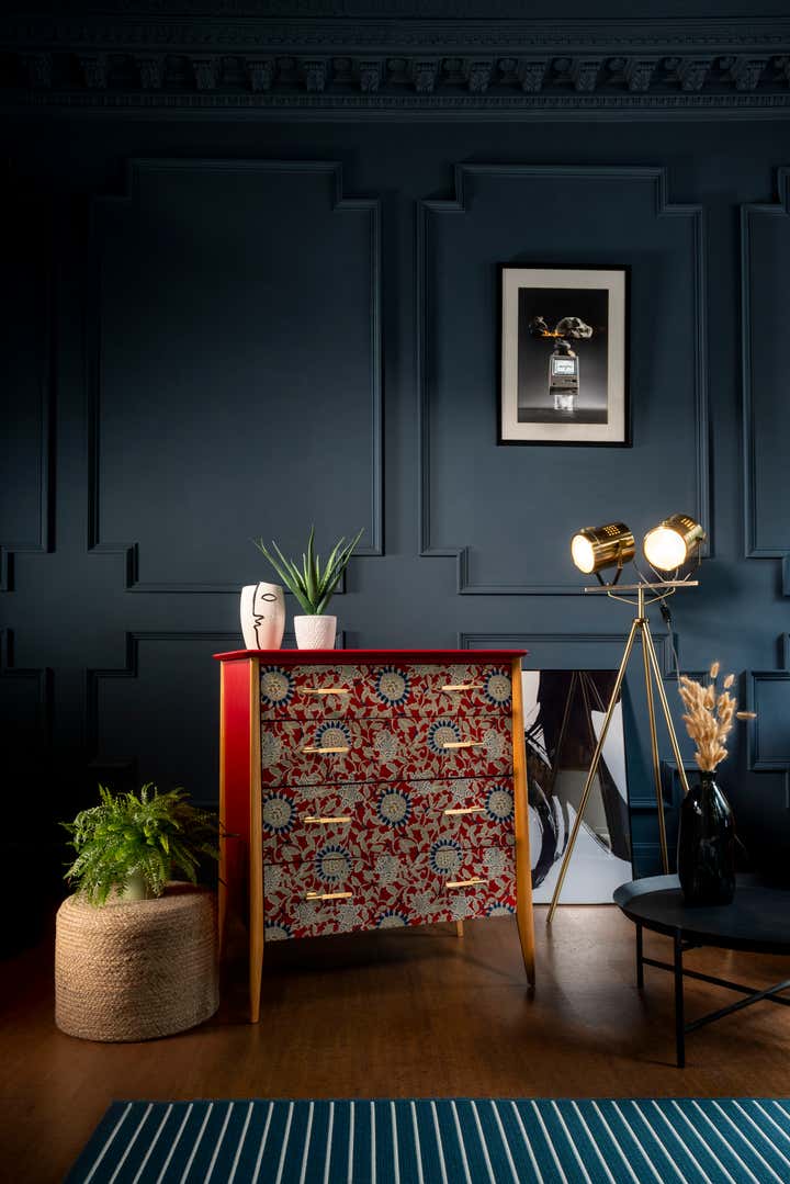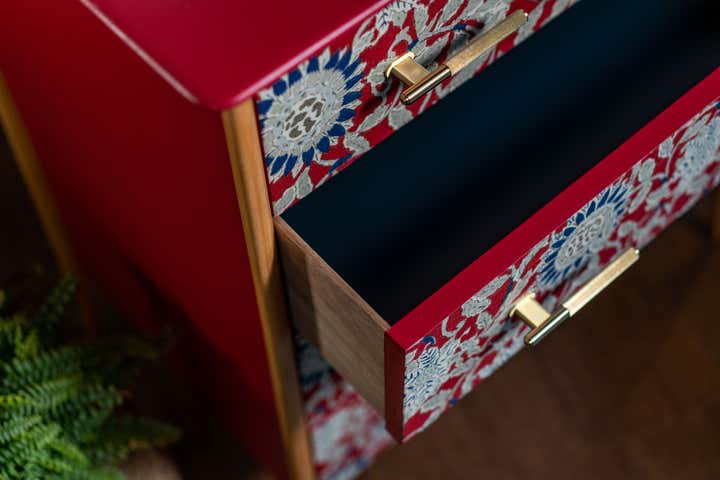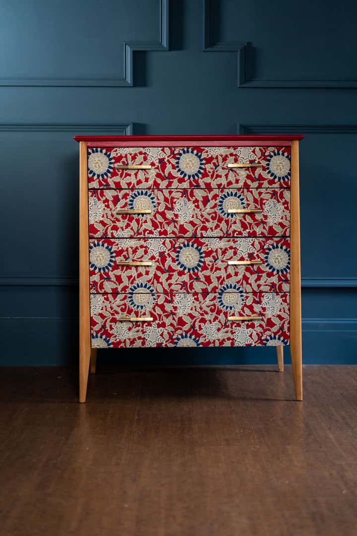 We have mixed the perfect red! Not too bright, not too dark, the ideal red to pop against a dark wall or liven up a plain room. It is softened with the use of natural ash wooden legs. The star of the show is the Ralph Lauren botanical fabric, bringing a Mediterranian feel with highlights of blue in the floral design. Finally, we finished this piece with 8 striking Buster Punch, milled brass handles.