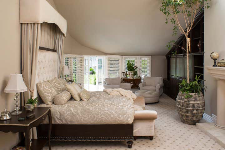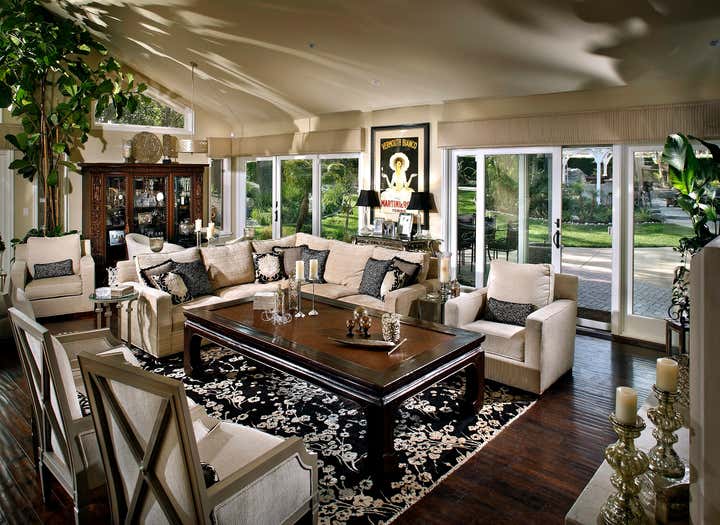 An extensive remodel for this equestrian ranch-style home created a true Great Room from the cramped 90 s styled family room. Adding the space from an unused outdoor patio allowed us to create a large, open space. Changing the colors from burgundy, green, and gold to a lovely monochromatic palette of soothing creamy neutrals accented with black, helped to create the feeling of spaciousness and luxury. The chunky upholstery pieces were replaced with sleek, clean-lined pieces to help open up the space. An antique Chinese bed platform used as a coffee table provides a bit of whimsy.