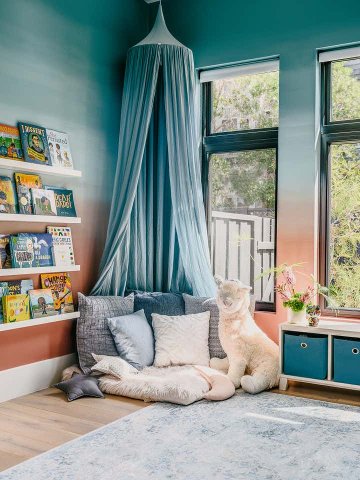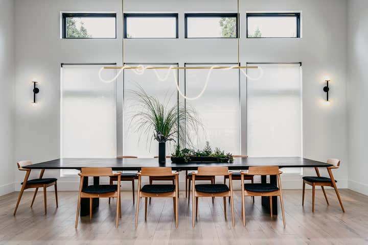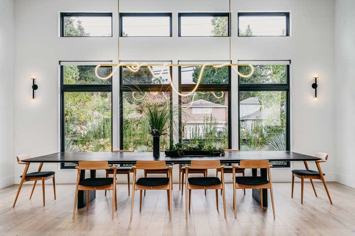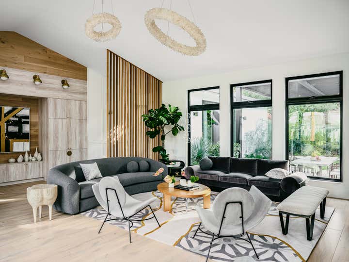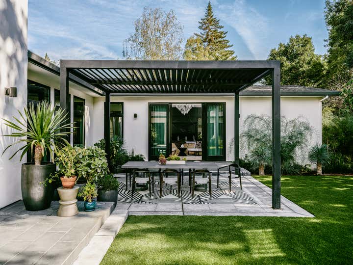 A young and active family of four, found their dream house in Menlo Park, and then found us to transform its spaces into their Home. A modern ranch house all on one level, we created a versatile aesthetic language in which the lofty indoor + outdoor hosting spaces take on a monochromatic sculptural style – while the private bedroom and office spaces on the perimeter of the house each have their own dramatic, eclectic signature.