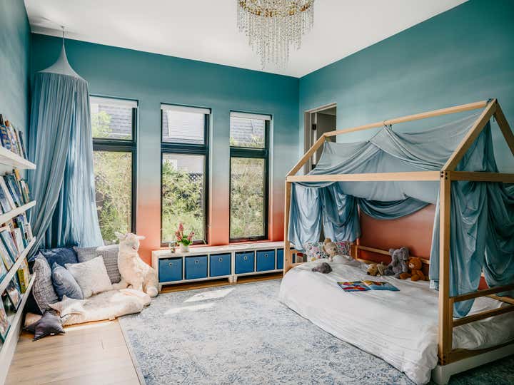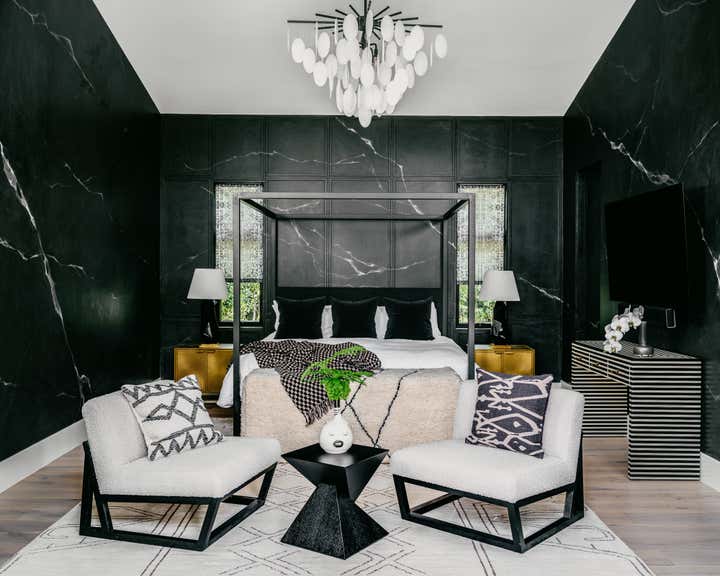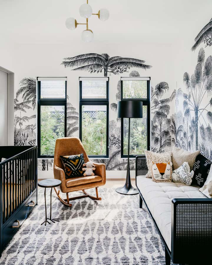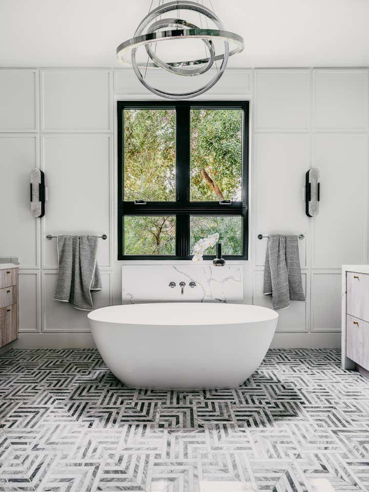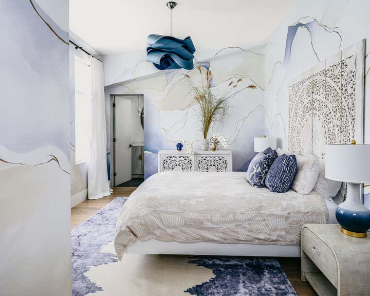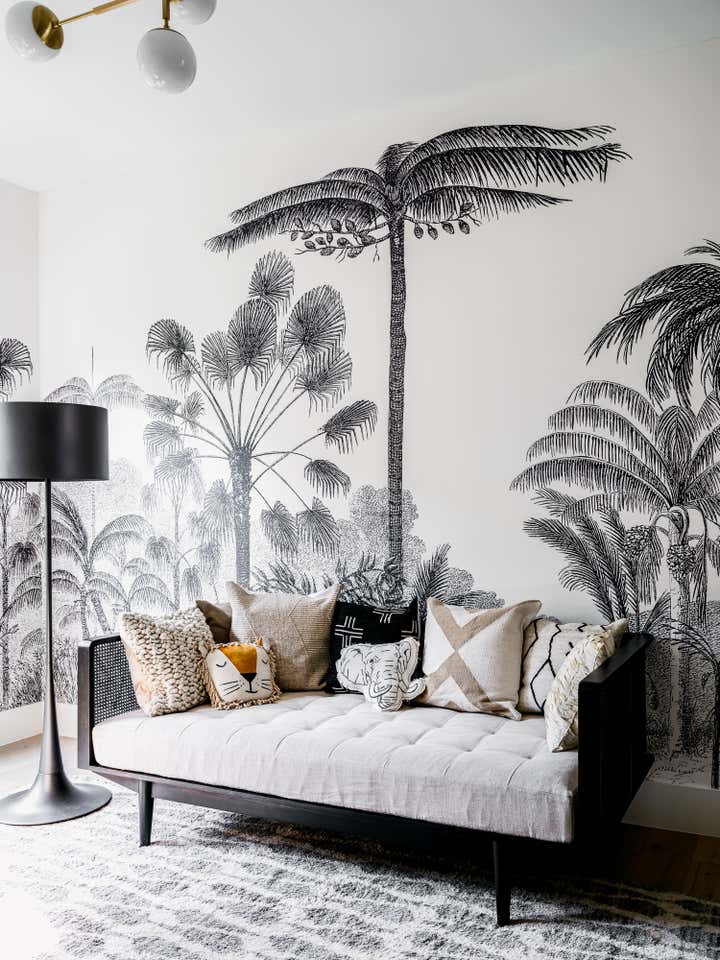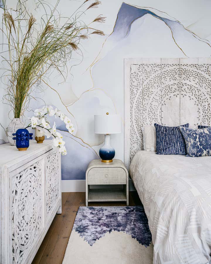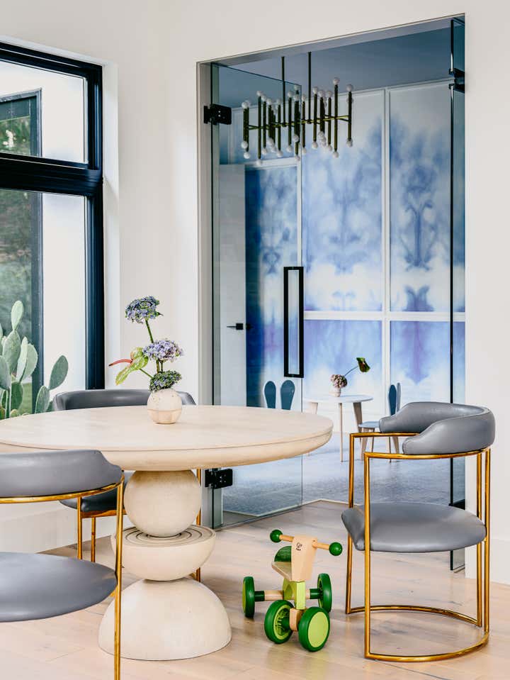 In several of our bedroom spaces, our vision could not have come to life without the partnership of decorative artist Caroline Lizarraga. Custom furnishings, rugs (even one painted on the patio!), and wall finishes allowed us to bring to life both the rich story of this beautiful family, and also their vision for how they wanted to live at home. Practically speaking, we ensured that all items, however fabulous, would be safe and durable for a household with young kids – and we also renovated the primary bathroom, replacing the slippery floors with a marble mosaic tile, and finding a much lovelier bathtub.