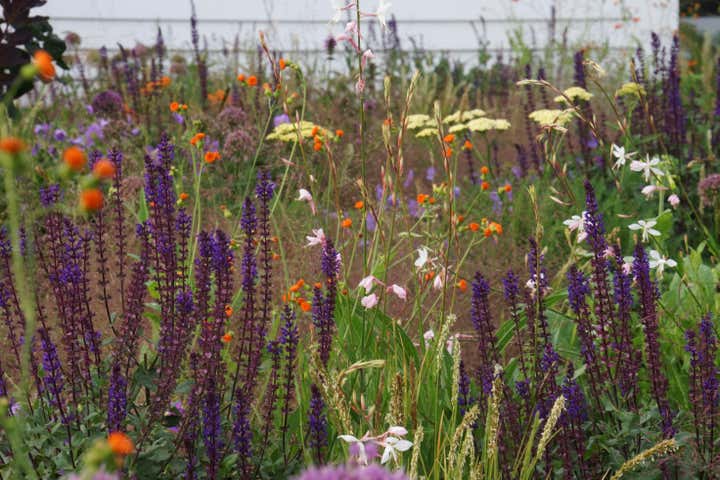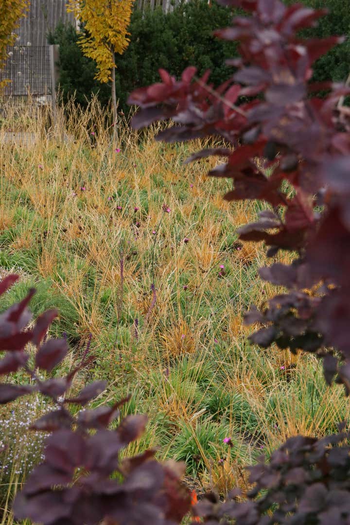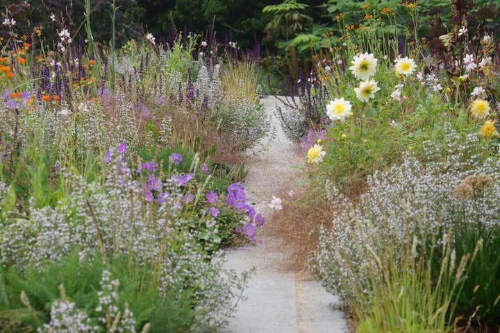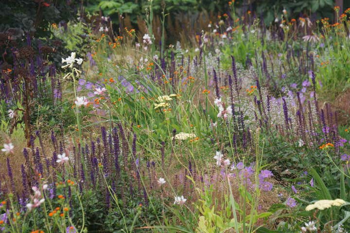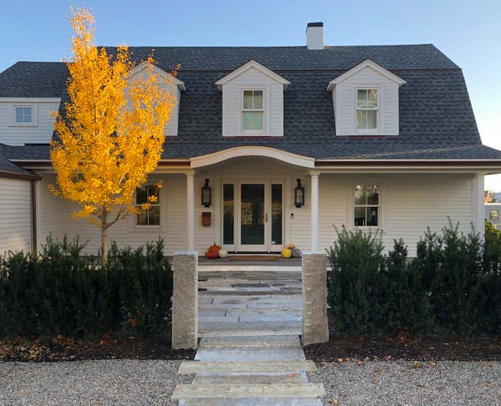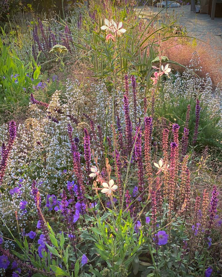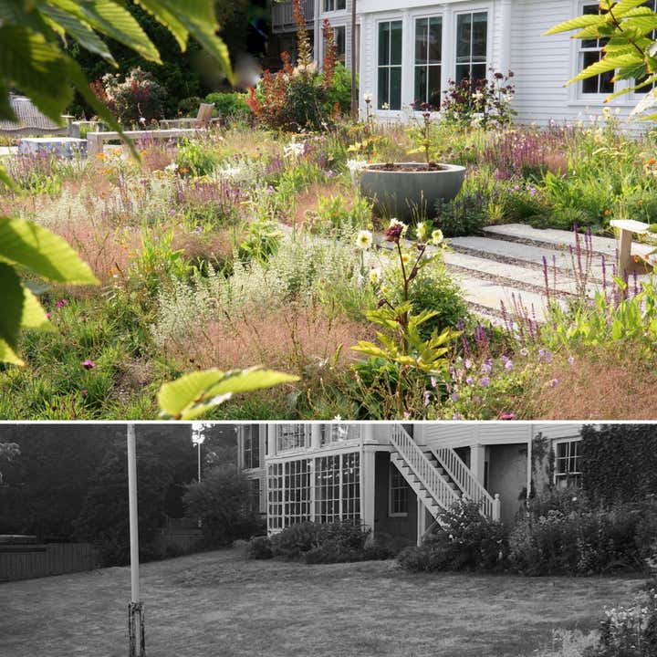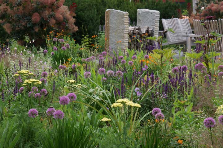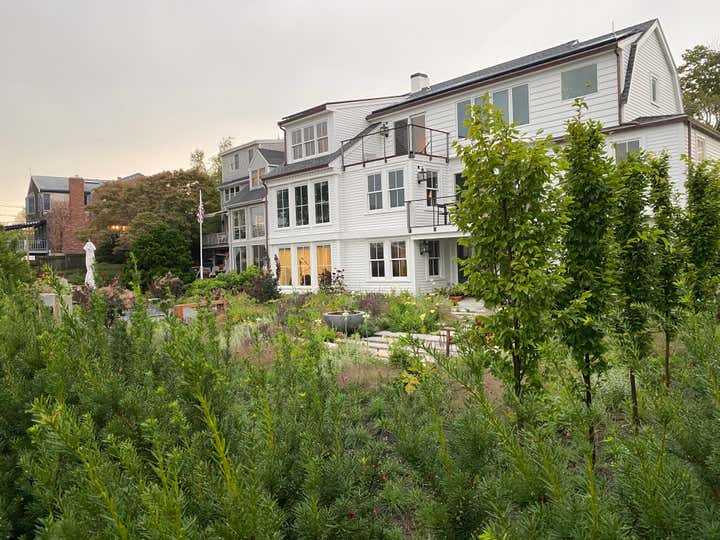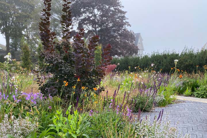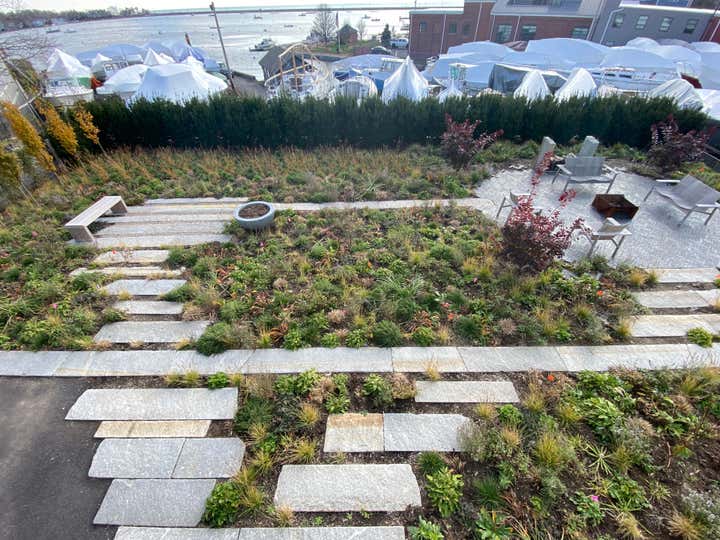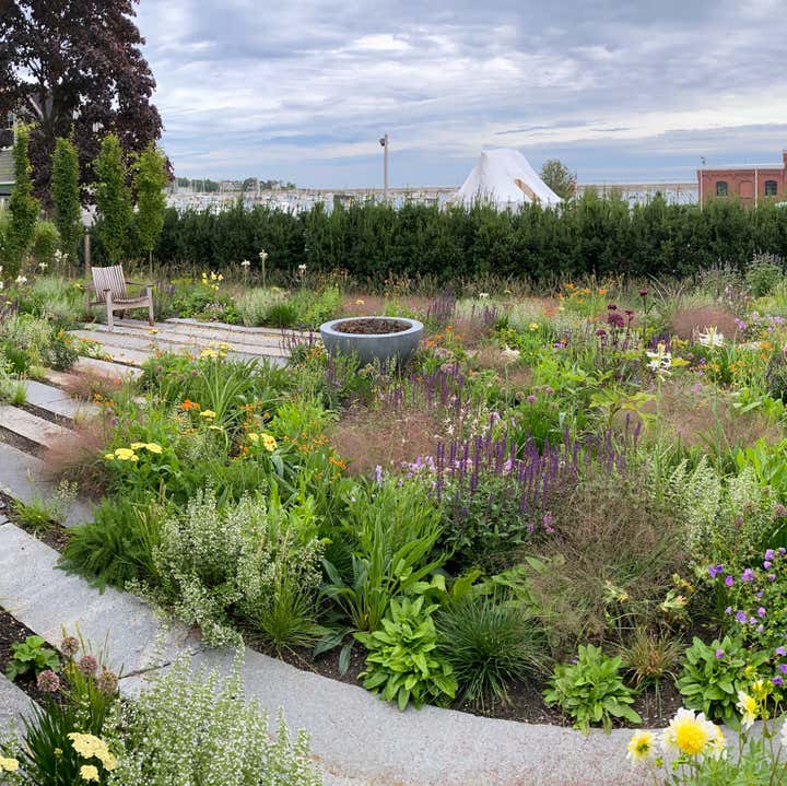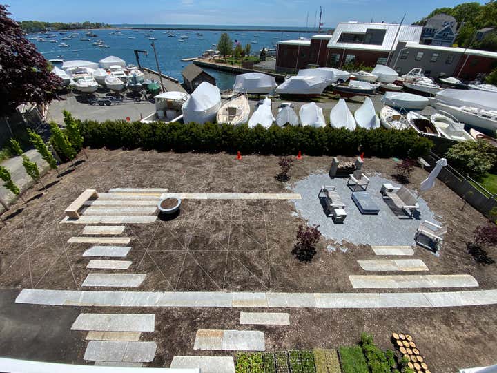 Adam Woodruff s personal garden was designed in collaboration with noted landscape architect, Matthew Cunningham and built by Robert Hanss Inc. The property sits behind Parker s Boatyard in historic, Marblehead, Massachusetts. Public access to the harbor is via a right-of-way using the homeowner s drive. A retaining wall was built to level the new garden. Bands of reclaimed granite curbing were laid horizontally to serve as pathways linking two new seating areas. Hedges were installed for privacy and to create a sense of intimacy when in the garden. In addition, off-street parking was added near the southeast corner of the house. A complex main planting (installed in May 20) flows between the two seating areas. It is an experimental matrix of about 30 low growing perennials, grasses, bulbs and annuals, organized in diagonal bands. The planting design and layout considerations included: ability to thrive in a seaside environment, length of bloom and seasonal interest, aesthetic value (flower, foliage, seed-head, fragrance), views of the garden from higher floors in the house as well as one s experience when in the garden. Between the main planting and the yew hedge is neutral strip of two grasses, one spring blooming, the other fall blooming. The grasses act a a foil for the more complex planting in the foreground. The yew hedge will be maintained at 6 and clipped into a subtle wave pattern.