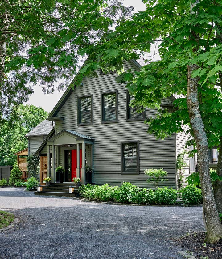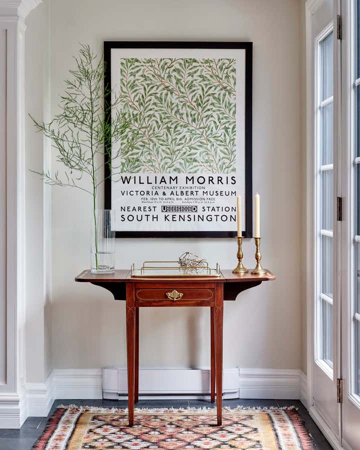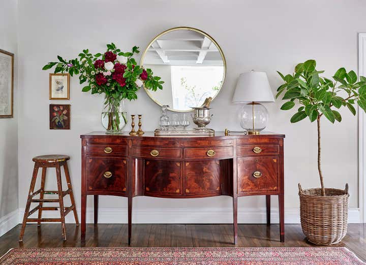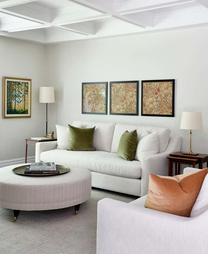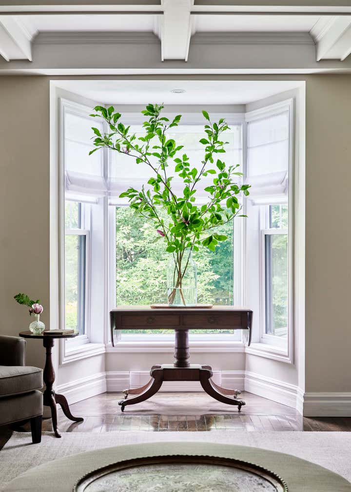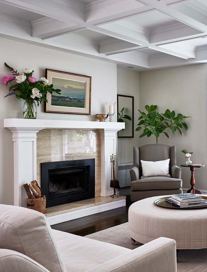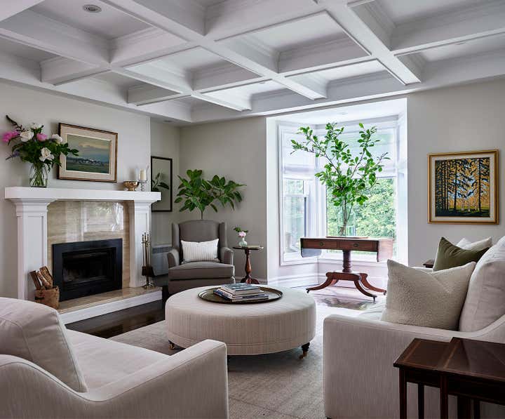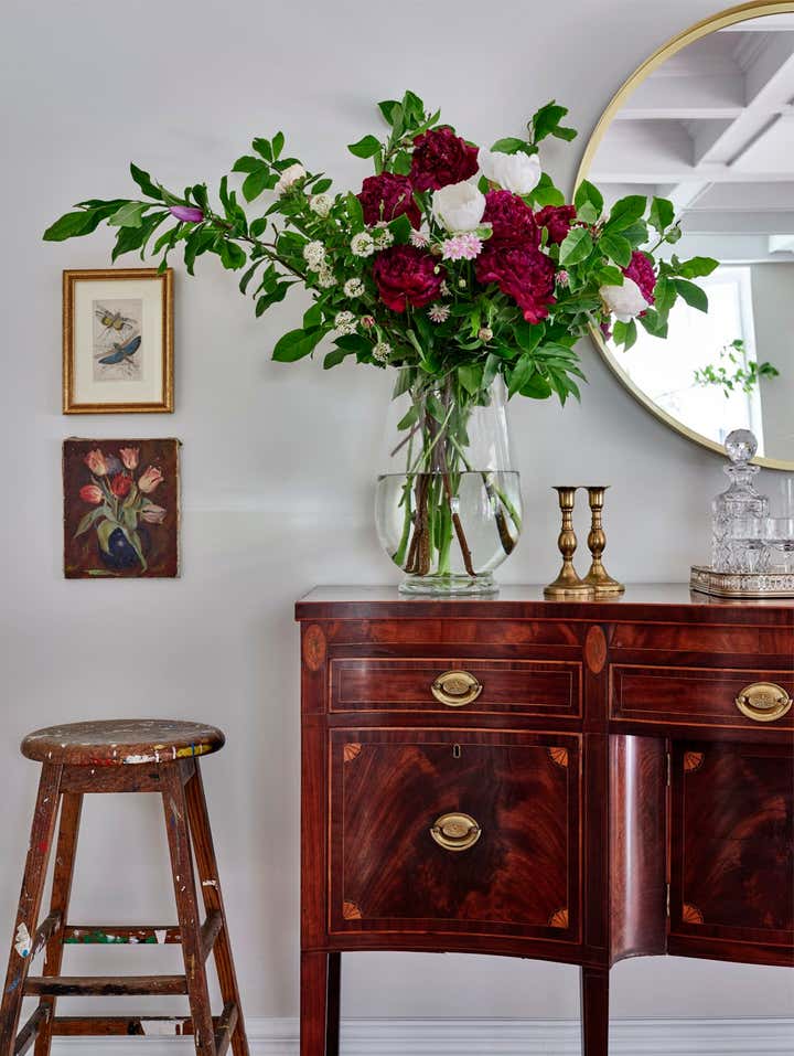 Romina and her team thoroughly enjoyed reimagining the great room in this Knowlton country house. To make the main floor feel effortlessly liveable, and contemporary enough for the busy family, they balanced refined locally sourced antiques with understated custom upholstered pieces in low-key neutrals, which give the stunning collectibles plenty of breathing space. They finished the look with distinctive accents including timeworn wicker, leggy florals, a vintage Turkish tea tray, and a rugged, splattered sign-painter’s stool.