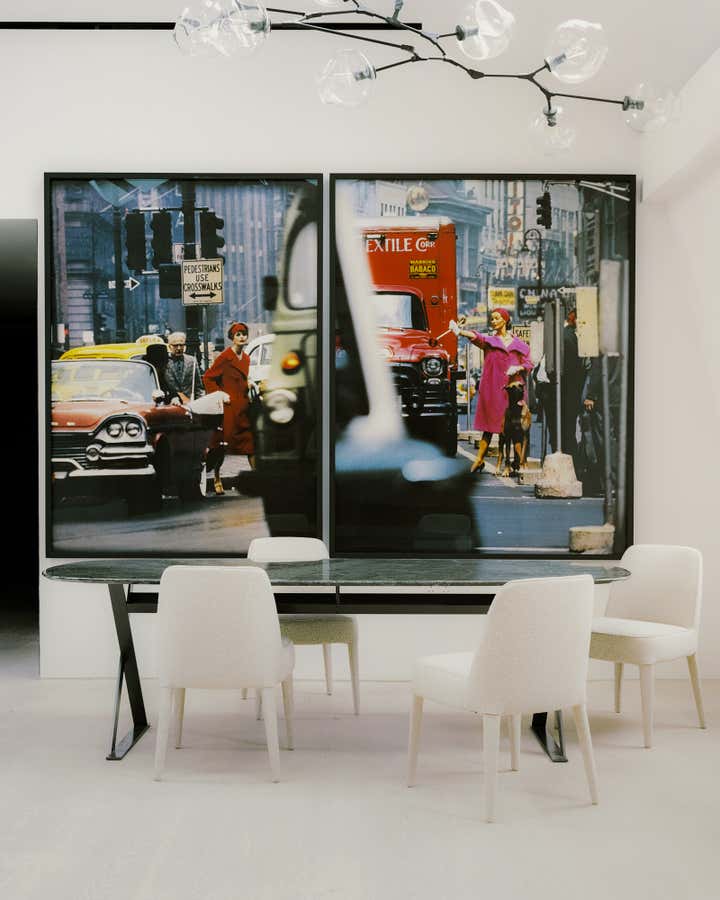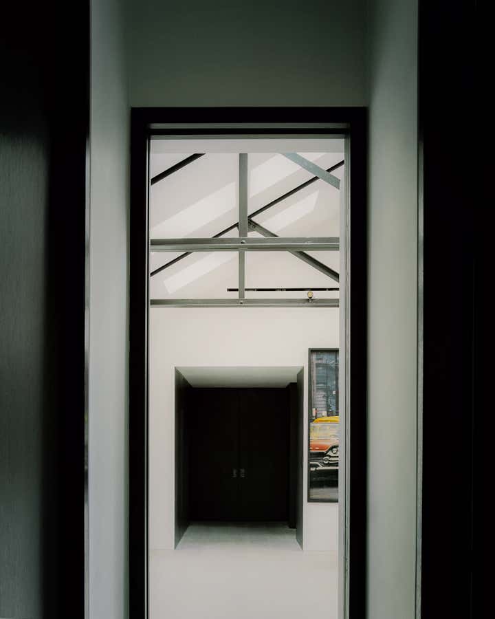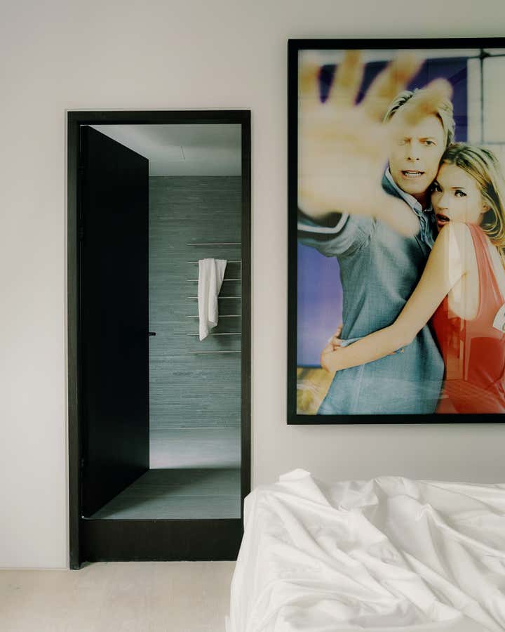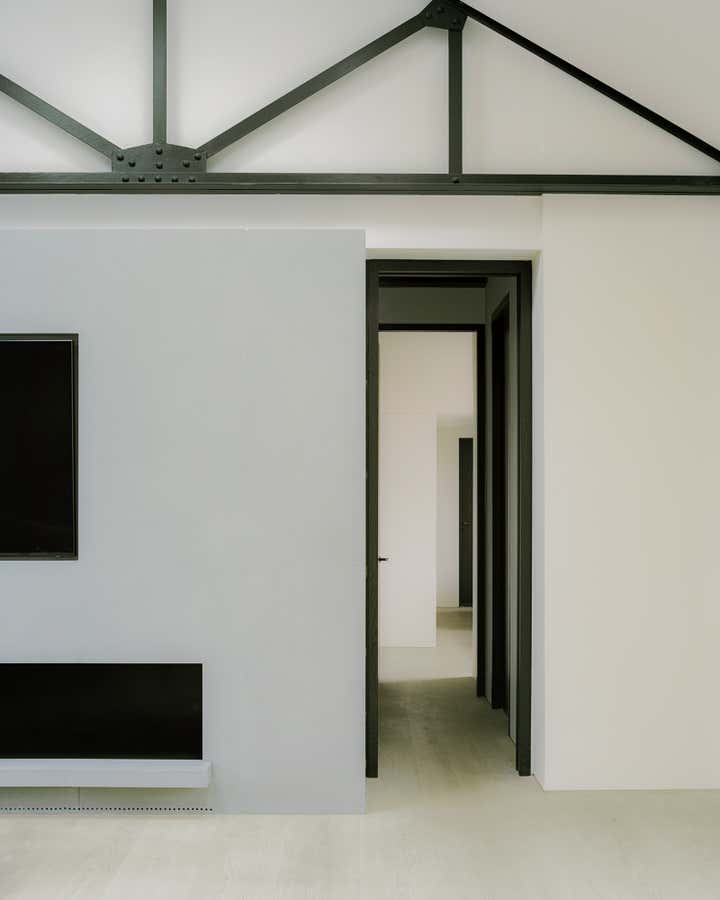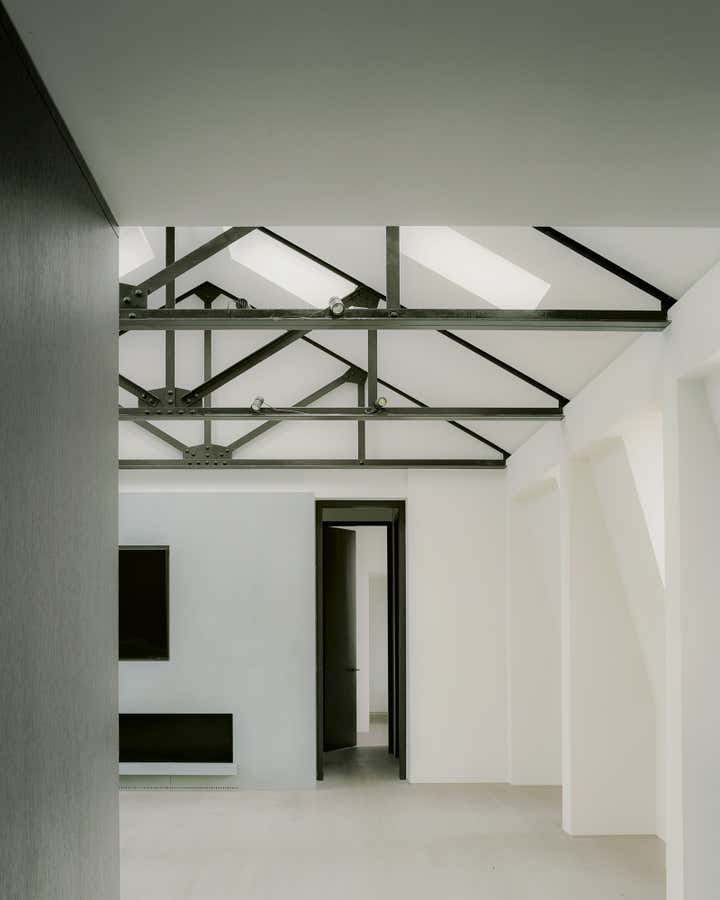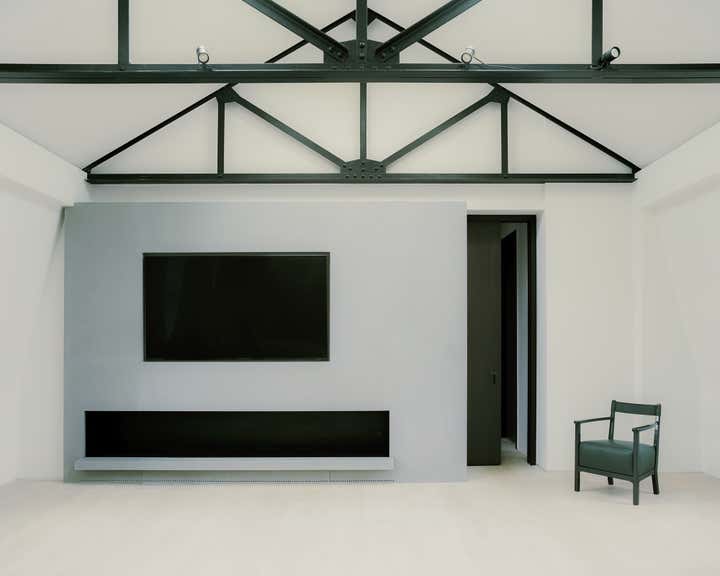 A new gas fireplace was installed and the chimney clad in Grigio Veronese sandstone. A large inset monitor displays a Bill Viola video, when not being used as a television. Other artworks in the loft include two William Klein prints of a 1960s New York fashion shoot plus an Ellen von Unwerth print of David Bowie and Kate Moss. The lighting in the apartment is all concealed, save for some spotlights installed along the bottom chord of the trusses to illuminate the artwork.