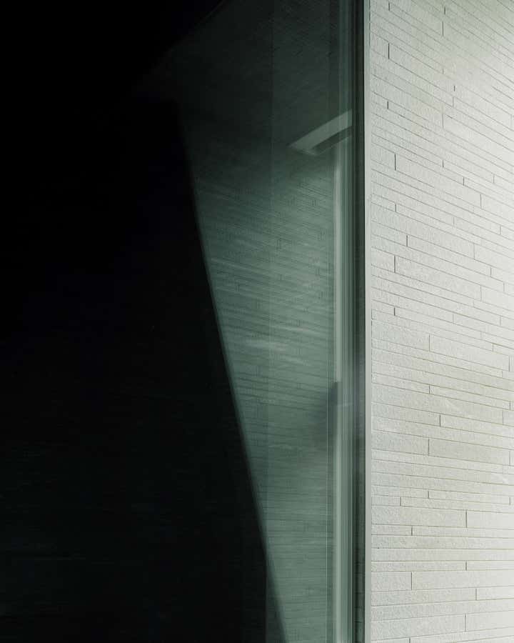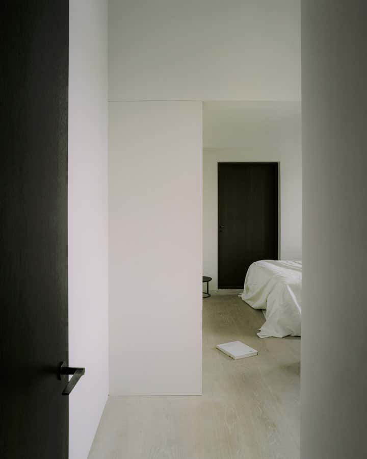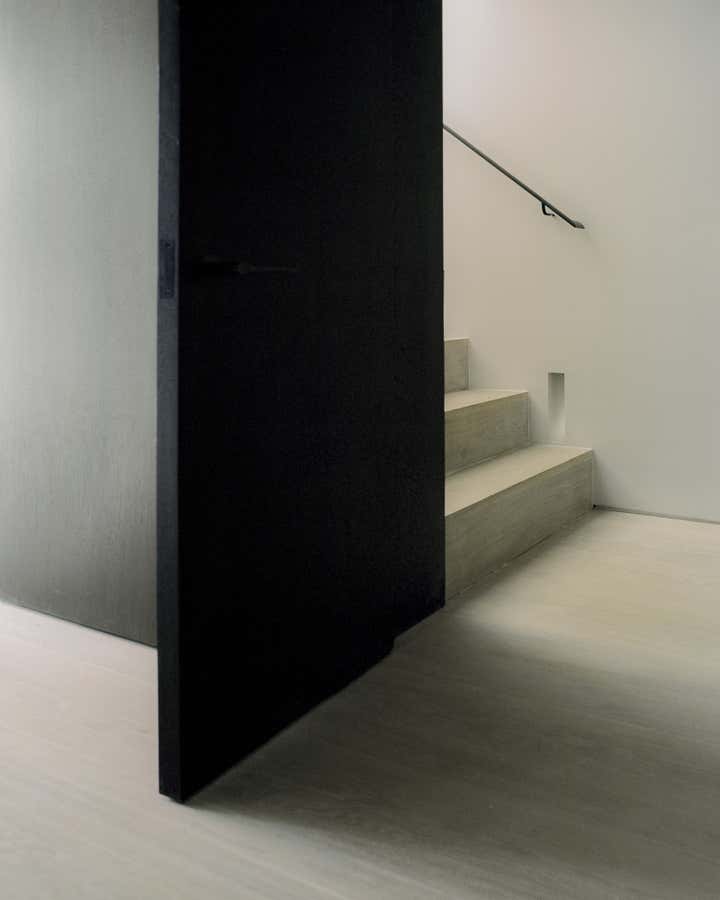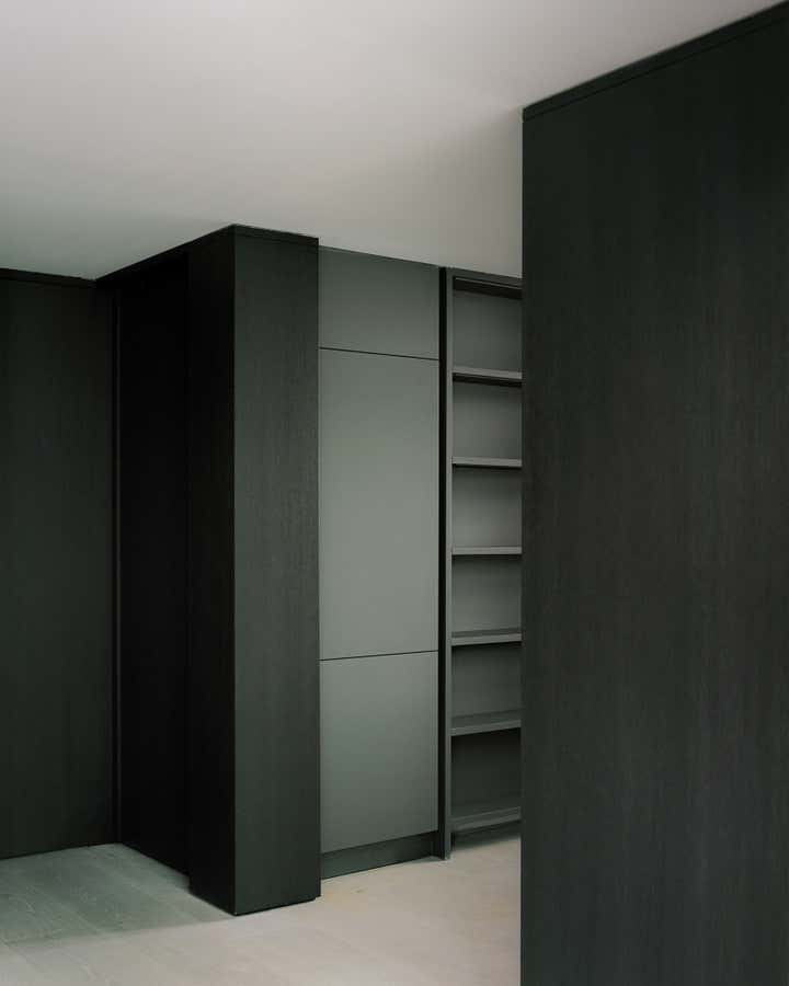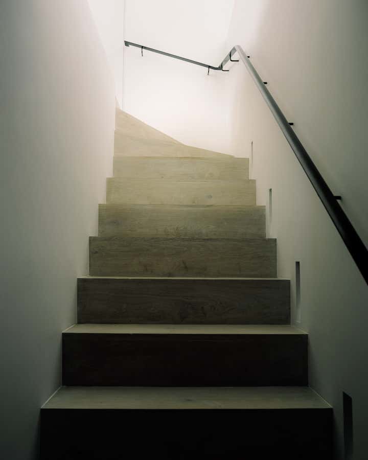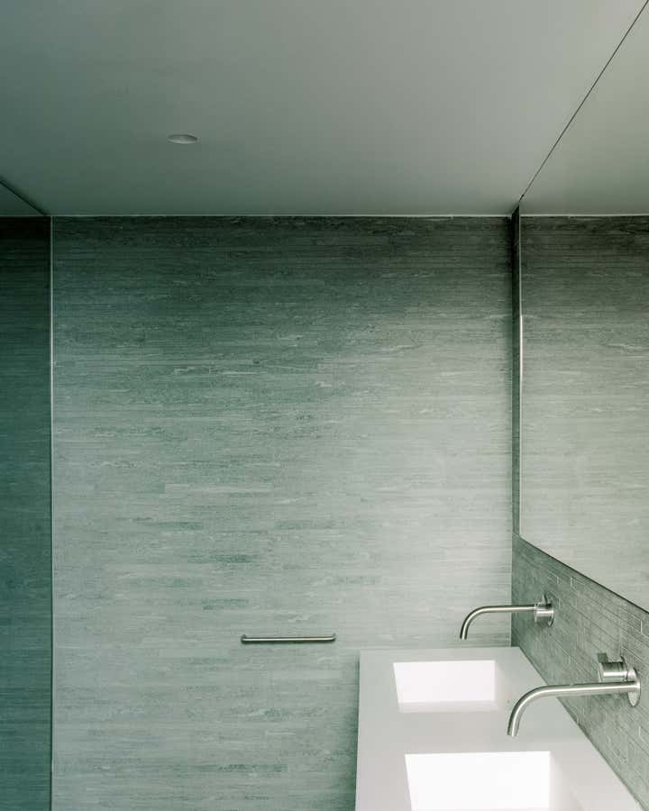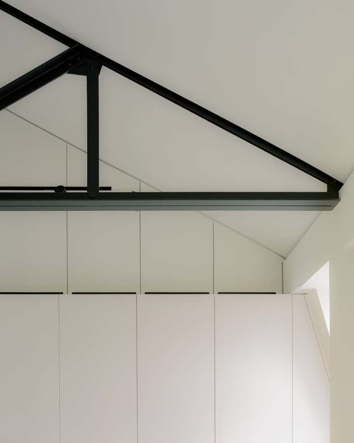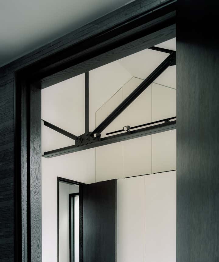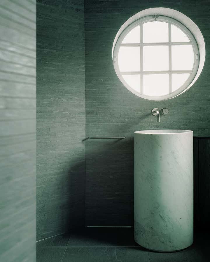 The palette of materials was kept to a minimum. The wide natural oak planks concealed integrated underfloor heating to avoid the need for radiators cluttering the space. The loft is fully air-conditioned with the diffusers disguised as long, thin black slots at high level. Apart from the dark panelling in the foyer, the walls and wardrobes are all white. All the WCs are clad in narrow porcelain stone tiles which unified the sloping walls and odd angles of the existing roof structure into a more coherent whole. The same tiles in a larger format were used for the WC floors and joinery. The vanity unit sinks were cast in a single piece of white Corian, except for the turret, where a cylindrical marble basin was placed as a sculptural element against the restored round metal window.
