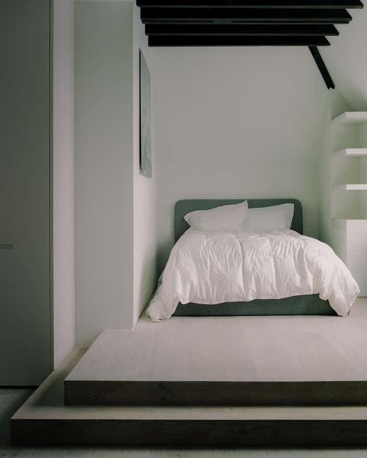 The loft was created out of the attic of an Edwardian mansion block built in 1907 and located just off Regent’s Park in Central London. The original steel trusses were restored and a new mezzanine floor created by building a new dormer window and combining it with the unused turret to get enough head height. This mezzanine became a separate bedroom suite comprising a living room, raised sleeping area and the turret was repurposed into a wet room, all accessed by a hidden staircase behind the foyer wall panelling.