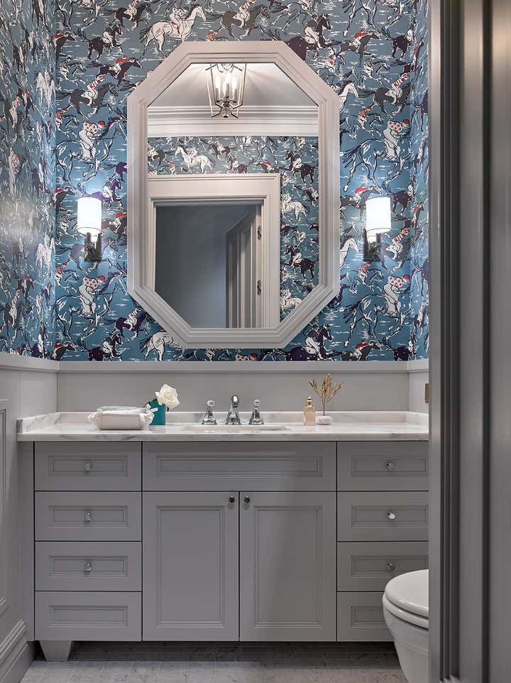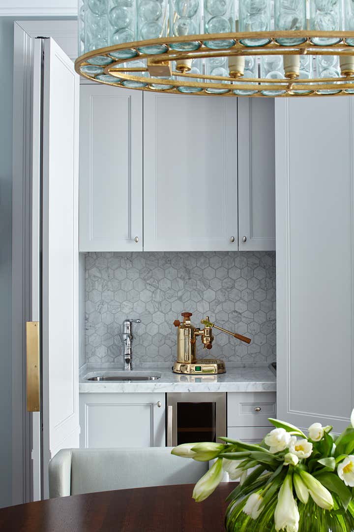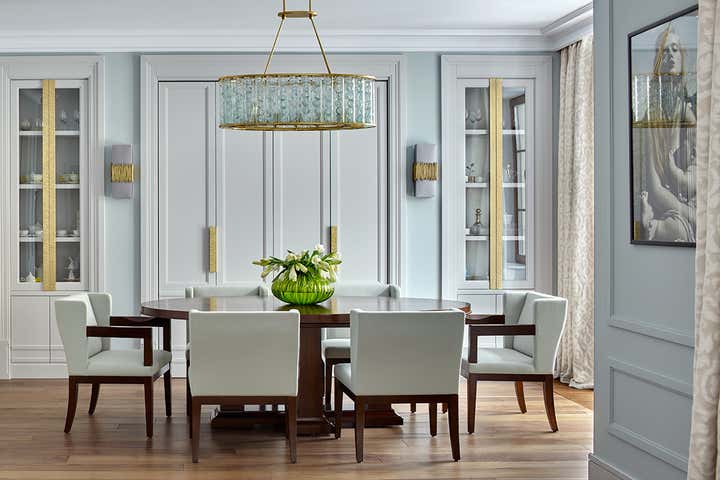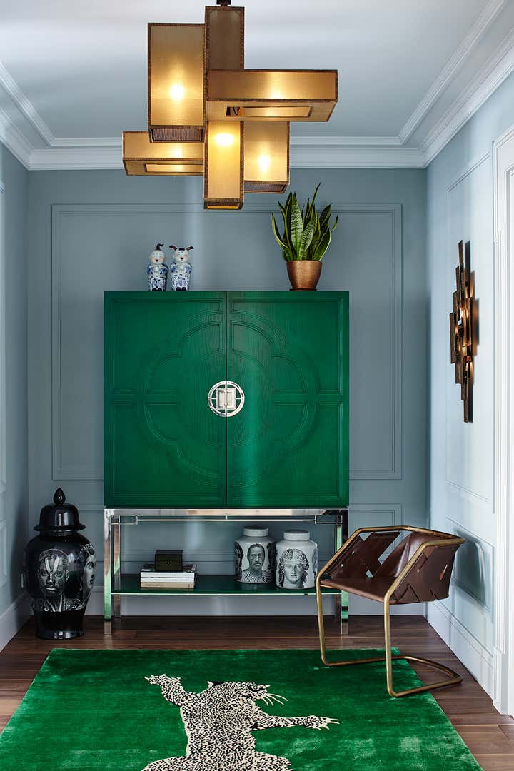 Bright emerald blue bar destroys the stereotype of a traditional style. It becomes clear that interior