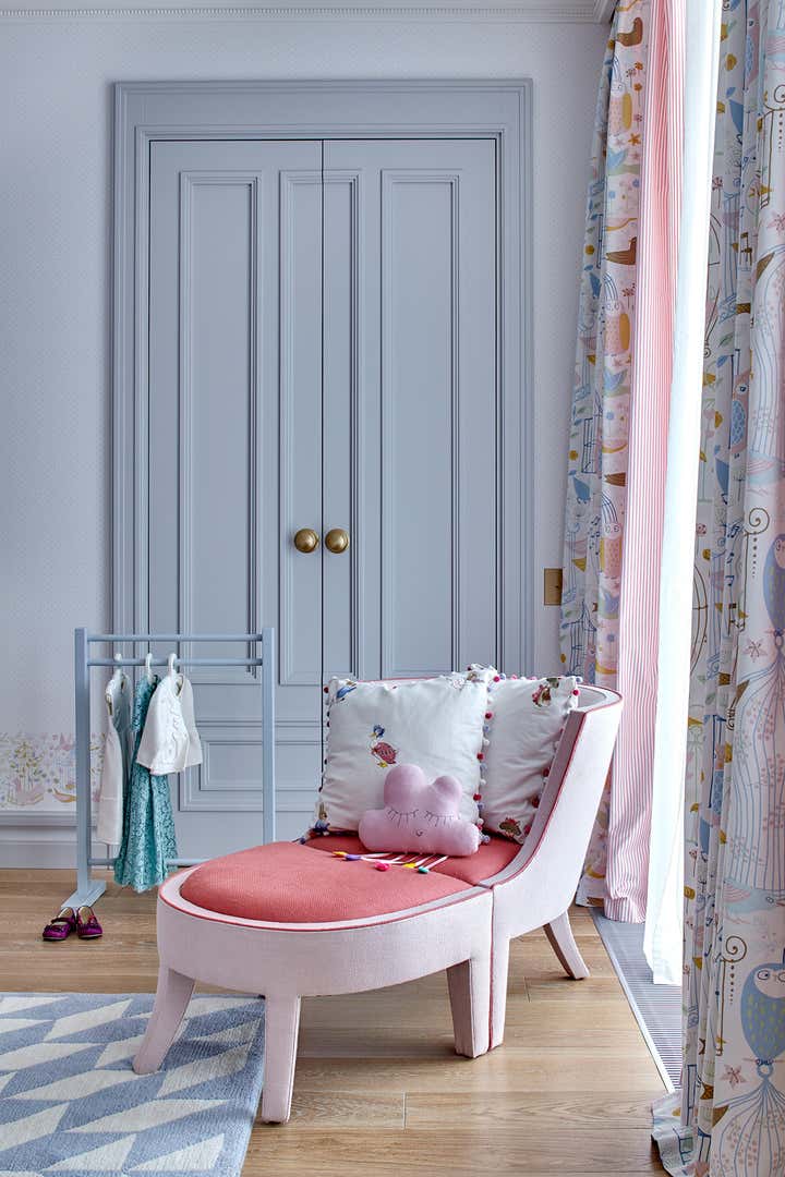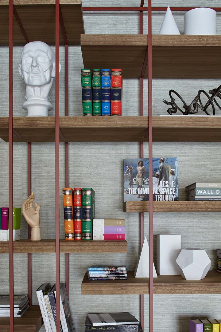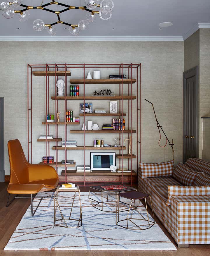 floor underlines the shape of a retro daybed. The bookshelf with a red line reflexes the impeccable
