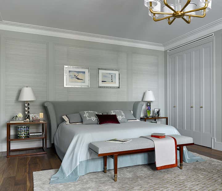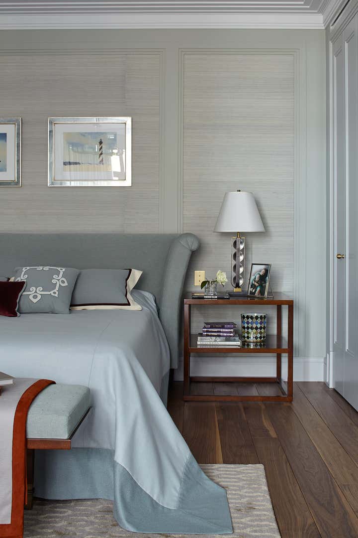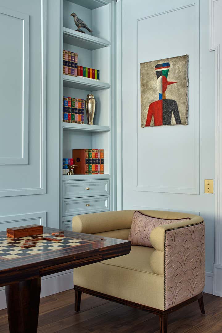 works of famous contemporary artists look like flash on the silver blue walls. Finish dark red wood gives