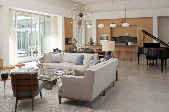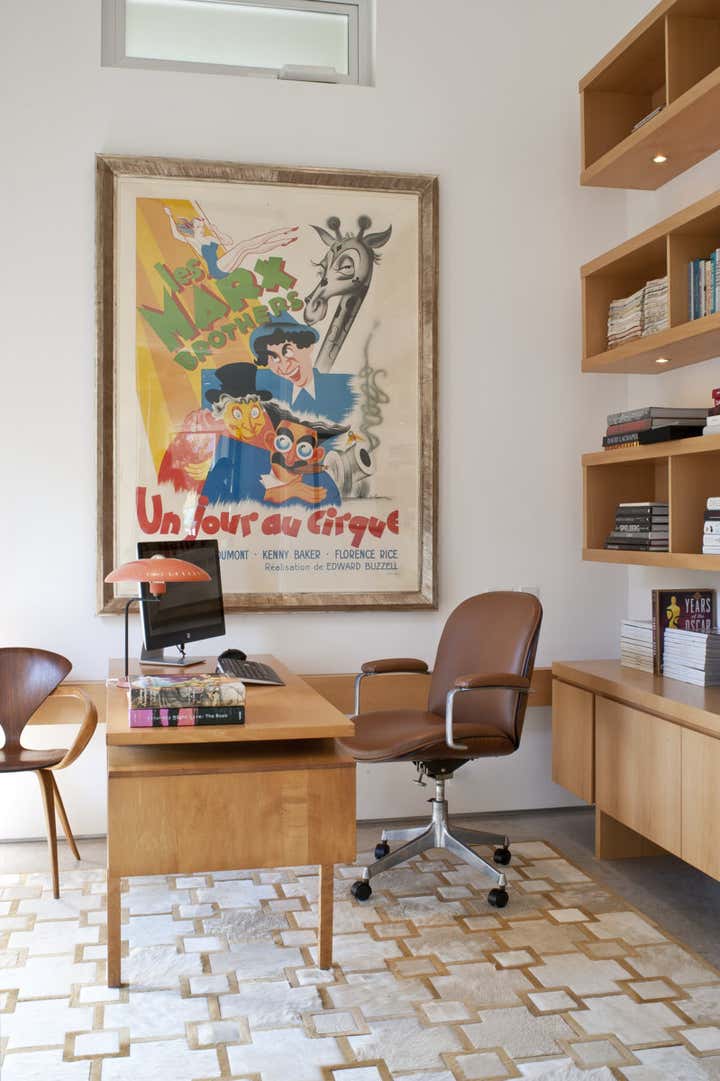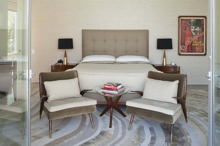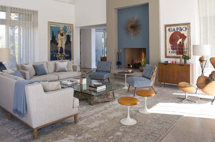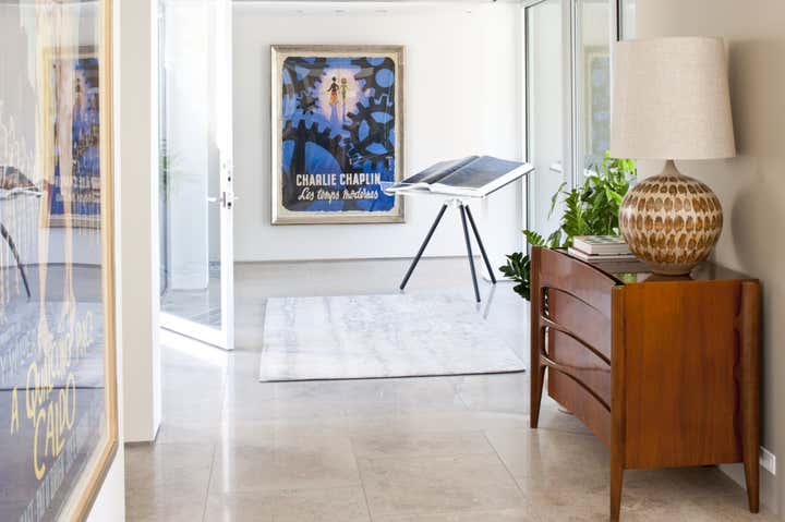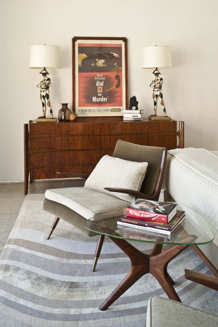This mid century project features a blend of vintage and contemporary furnishings and showcases the owner s collection of vintage movie posters. Interior design by Michael Ostrow of Grace Home Furnishings.