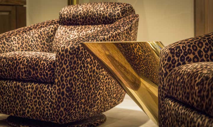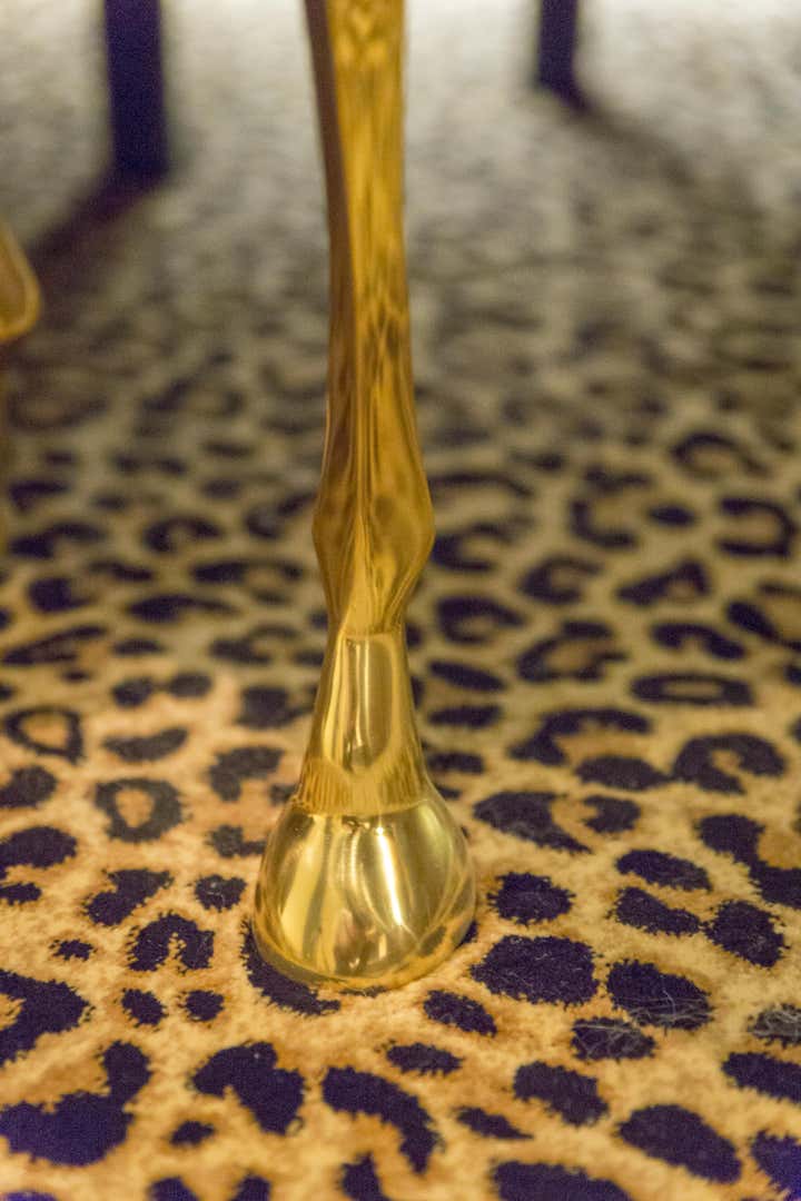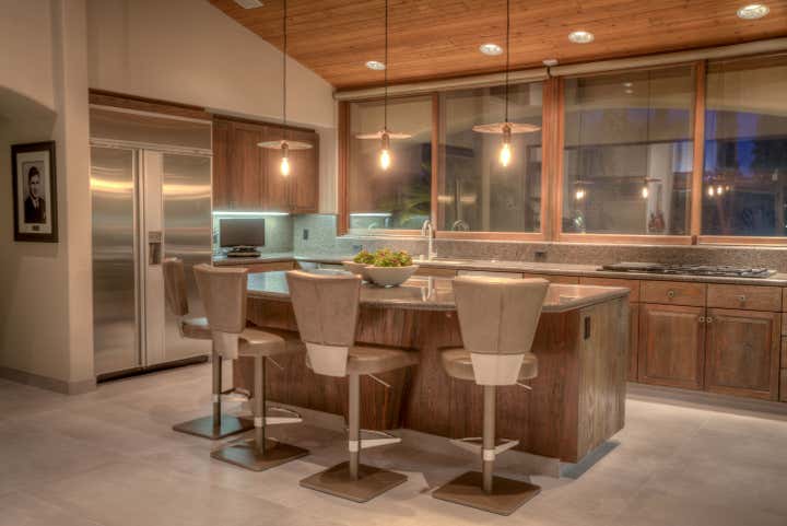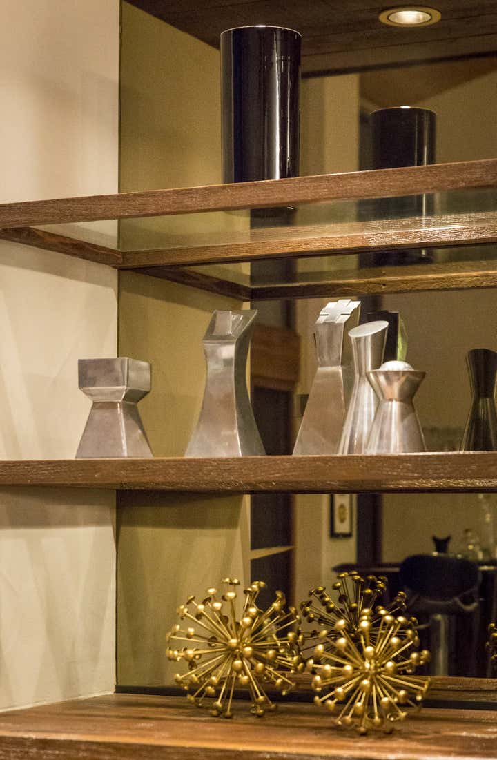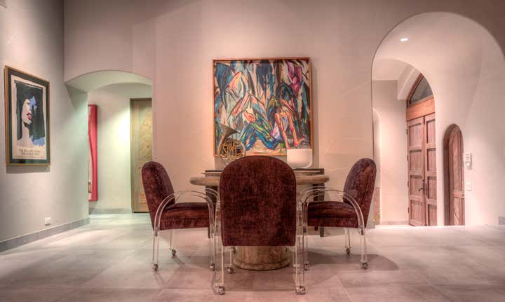 This project was a renovation of renowned drummer/percussionist Richard Grea’s Palm Springs Spanish Villa of 3,500 square feet. The base for the project was leopard carpeting and charcoal walls in the master bedroom, from that King, took inspiration and utilized Vintage Designer furnishings with brass details, pieces by Milo Baughman, Breuton and Steve Chase and mixed them with custom pieces by Natuzzi, along with luxurious finishes such as shagreen leather. Brazilian tigerwood and amethyst stone were also used throughout the home. The project tied together with very unique art, a large scale graffiti triptych a la Basquiat done by an unknown artist in Palm Springs in the early 1980s, a vintage pop-art Rolling Stones poster, and a unique 1950s fire engine red funhouse mirror from Asbury Park, that was notably on stage with the late Jimi Hendrix.