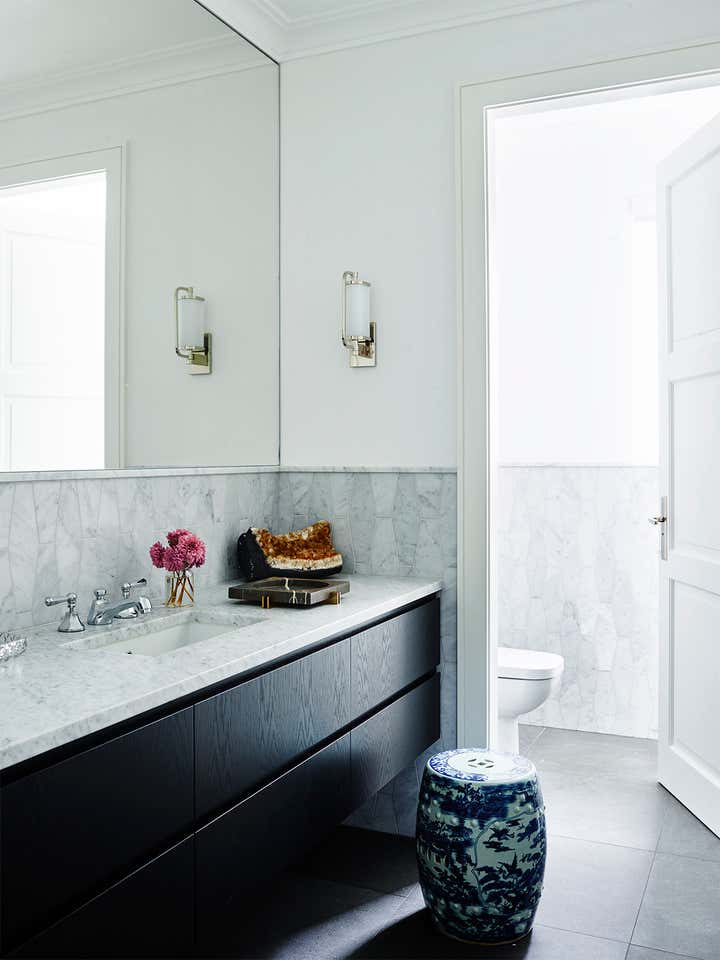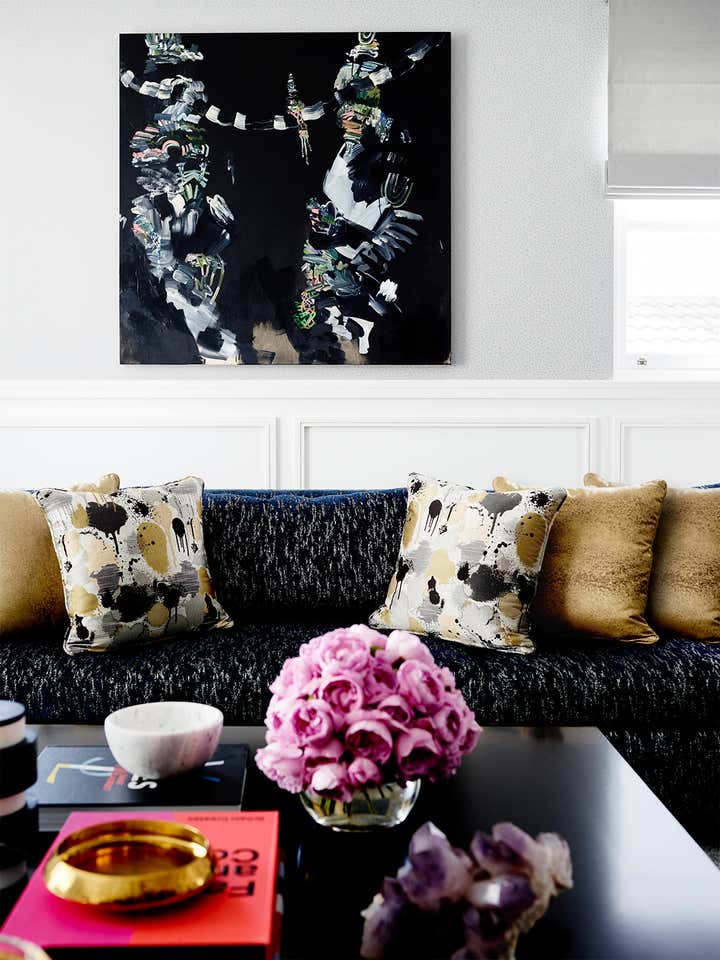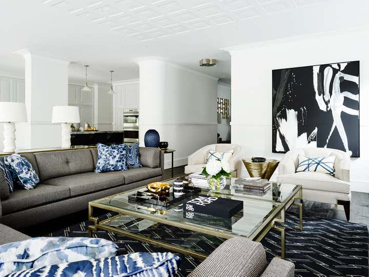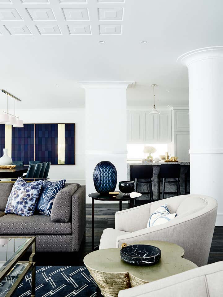 Internally, blue and grey are employed to cooly break up the white. Though impactful in creating a sense of arrival, the brilliant blue double-door entry is the sole, bold, design statement in the home. For the most part, introductions of colour and pattern are more delicately explored in the living and sleeping areas.