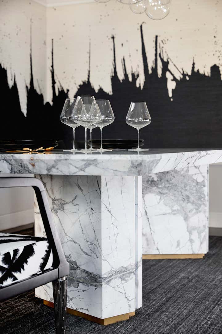 This 5-story family home is a study in black and white contrasted with interesting shapes, pops of color and haute couture finishes.