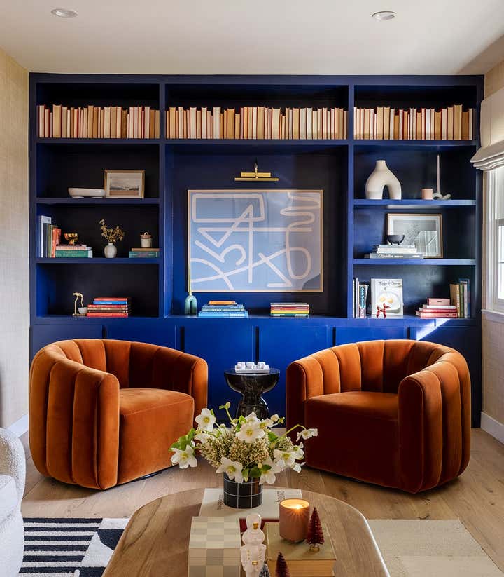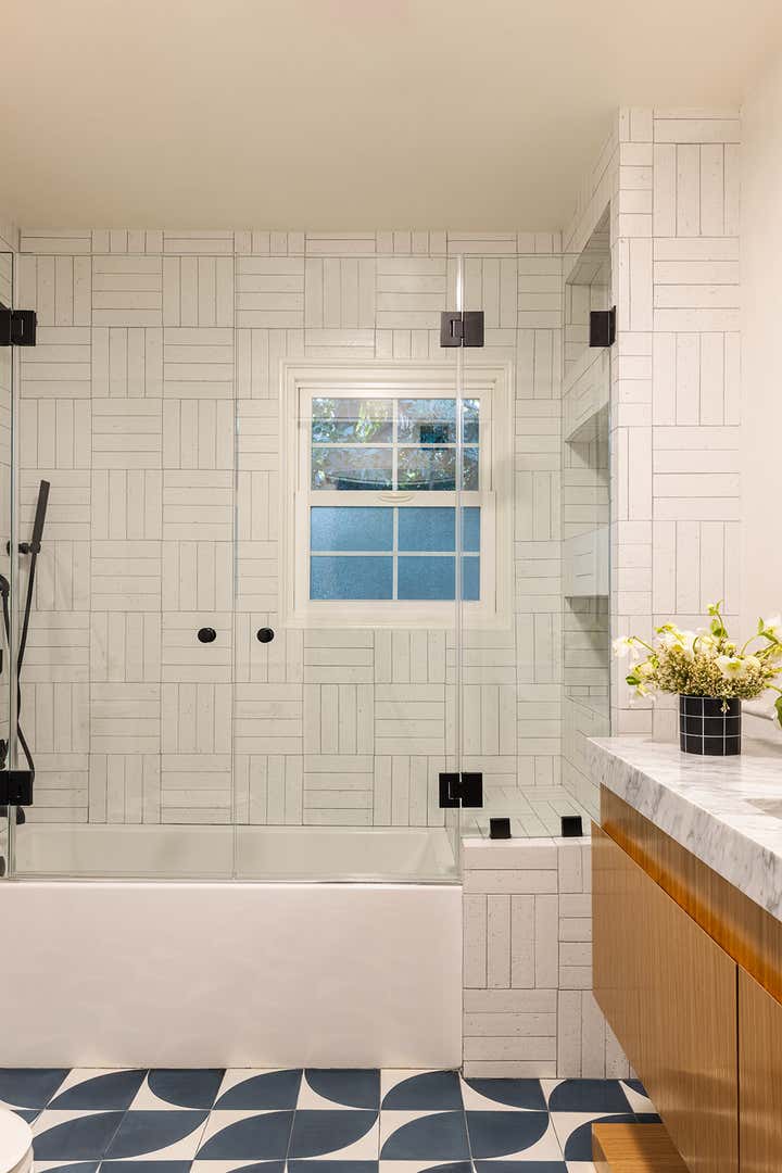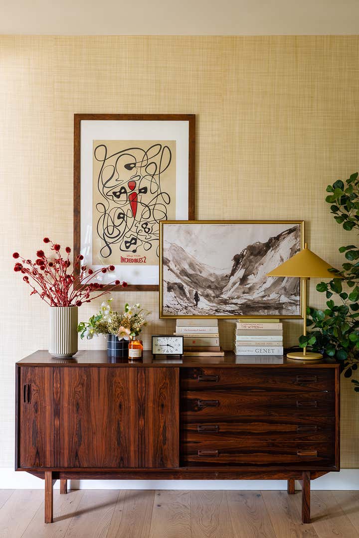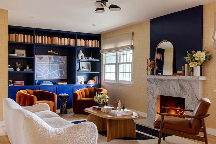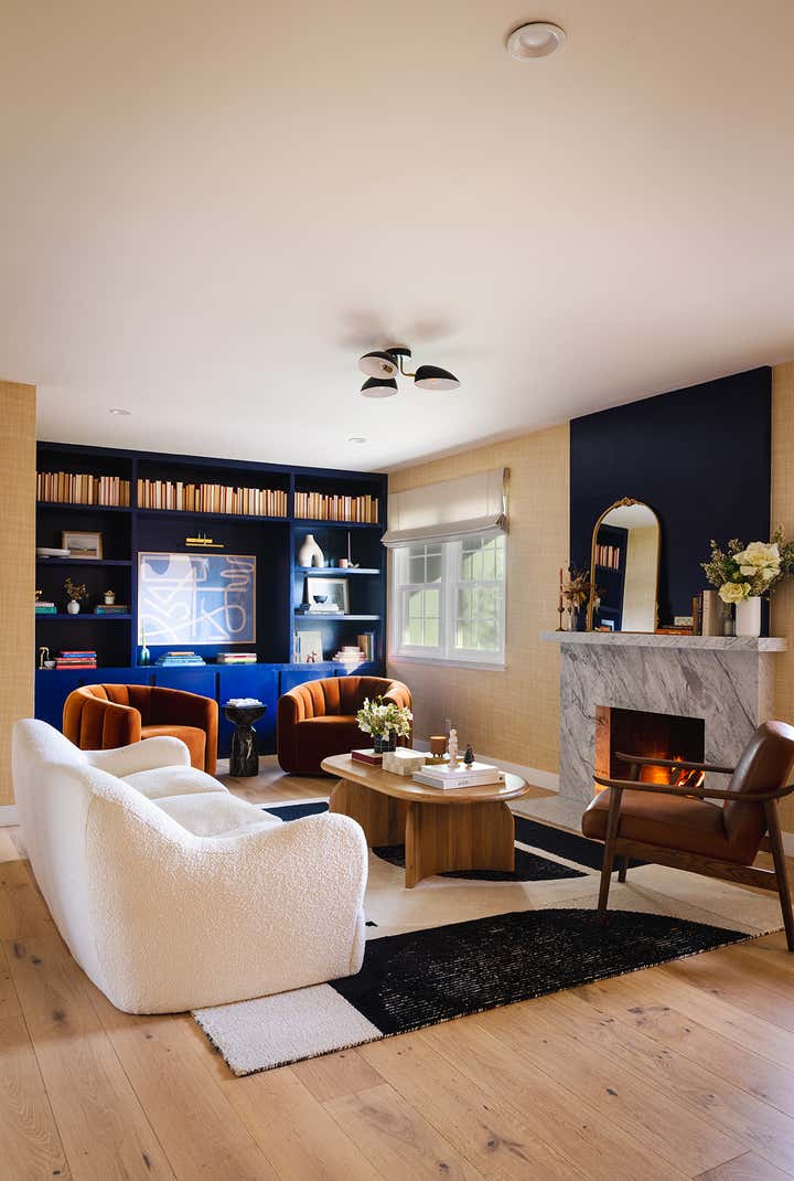 Rattan wallpaper brightens up the entry walls accompanied by bold accents that carry into the kitchen and living room. Natural stone and tile can be found in all three bathrooms. Custom cabinetry and millwork give a unique, yet modest, luxury throughout the house and the built-in bookshelves are a perfect place to showcase their book collection, art, and family memories.