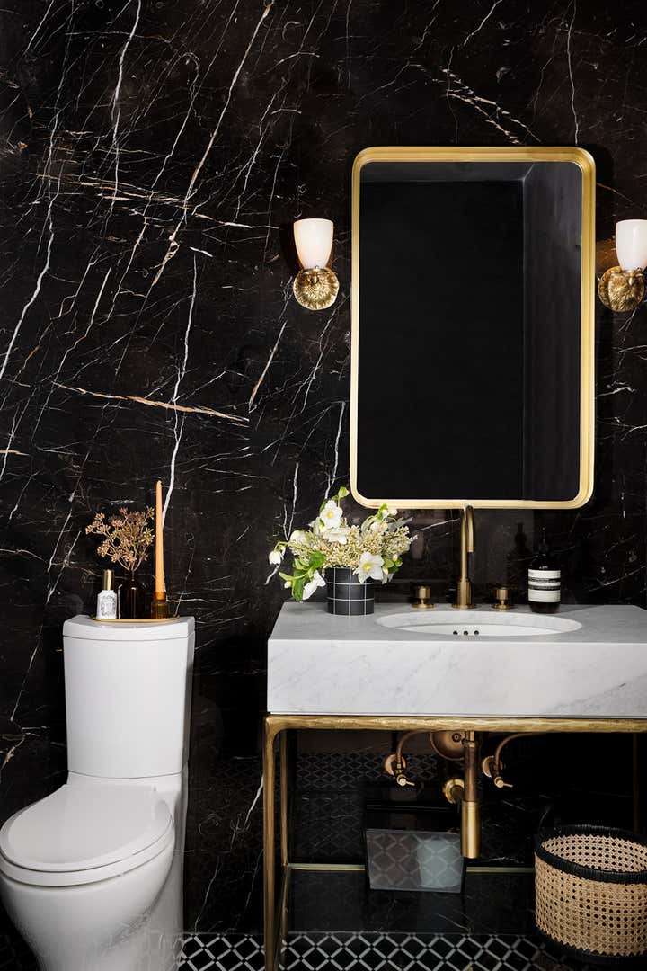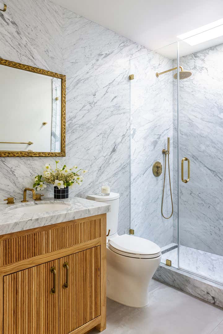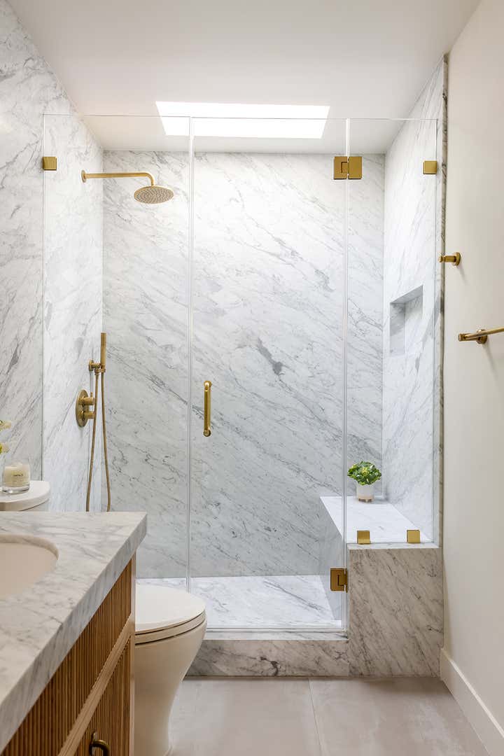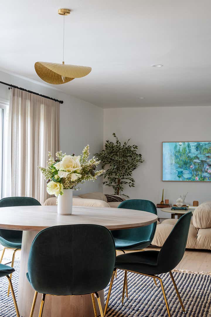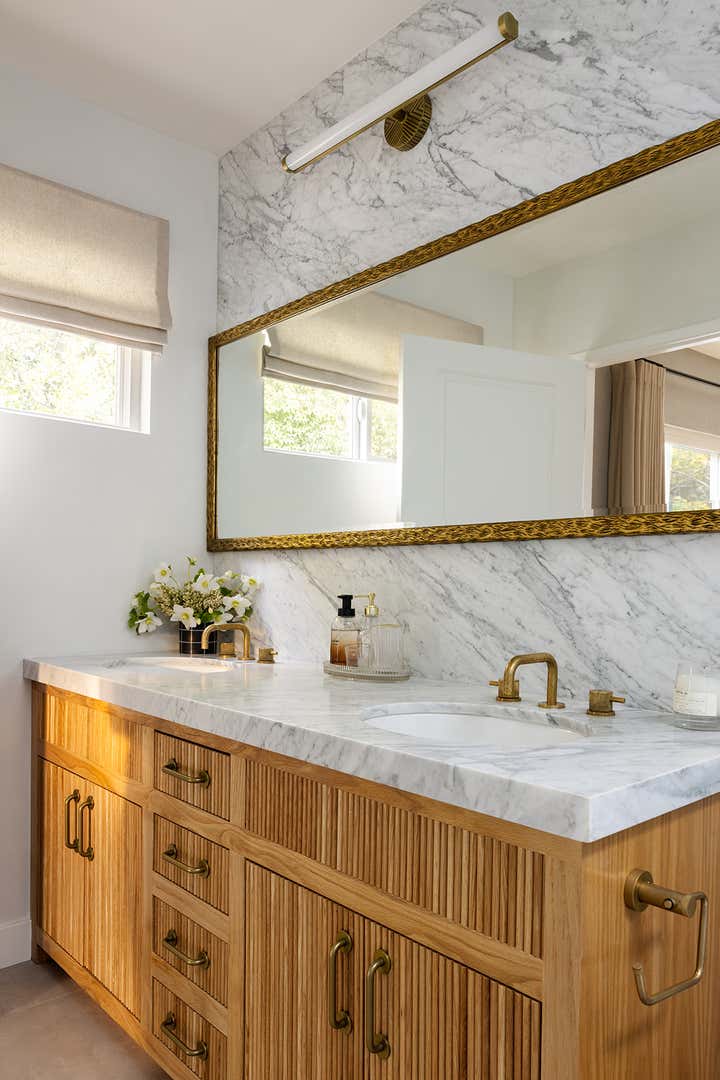 Rattan wallpaper brightens up the entry walls accompanied by bold accents that carry into the kitchen and living room. Natural stone and tile can be found in all three bathrooms. Custom cabinetry and millwork give a unique, yet modest, luxury throughout the house and the built-in bookshelves are a perfect place to showcase their book collection, art, and family memories.