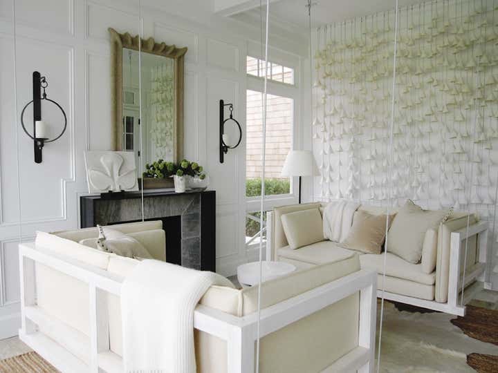 Once we laid eyes on the home s screened-in porch we knew instantly we had to design this charming space. When thinking about what to do with the room, our first thought was to take classic pieces associated with a screened-in porch and take them to another level. Hence the idea of "upholstered" porch swings and a wind chime art installation. We were really pleased with the way the room turned out and have many people to thank for helping us pull it together and have listed the resources below.