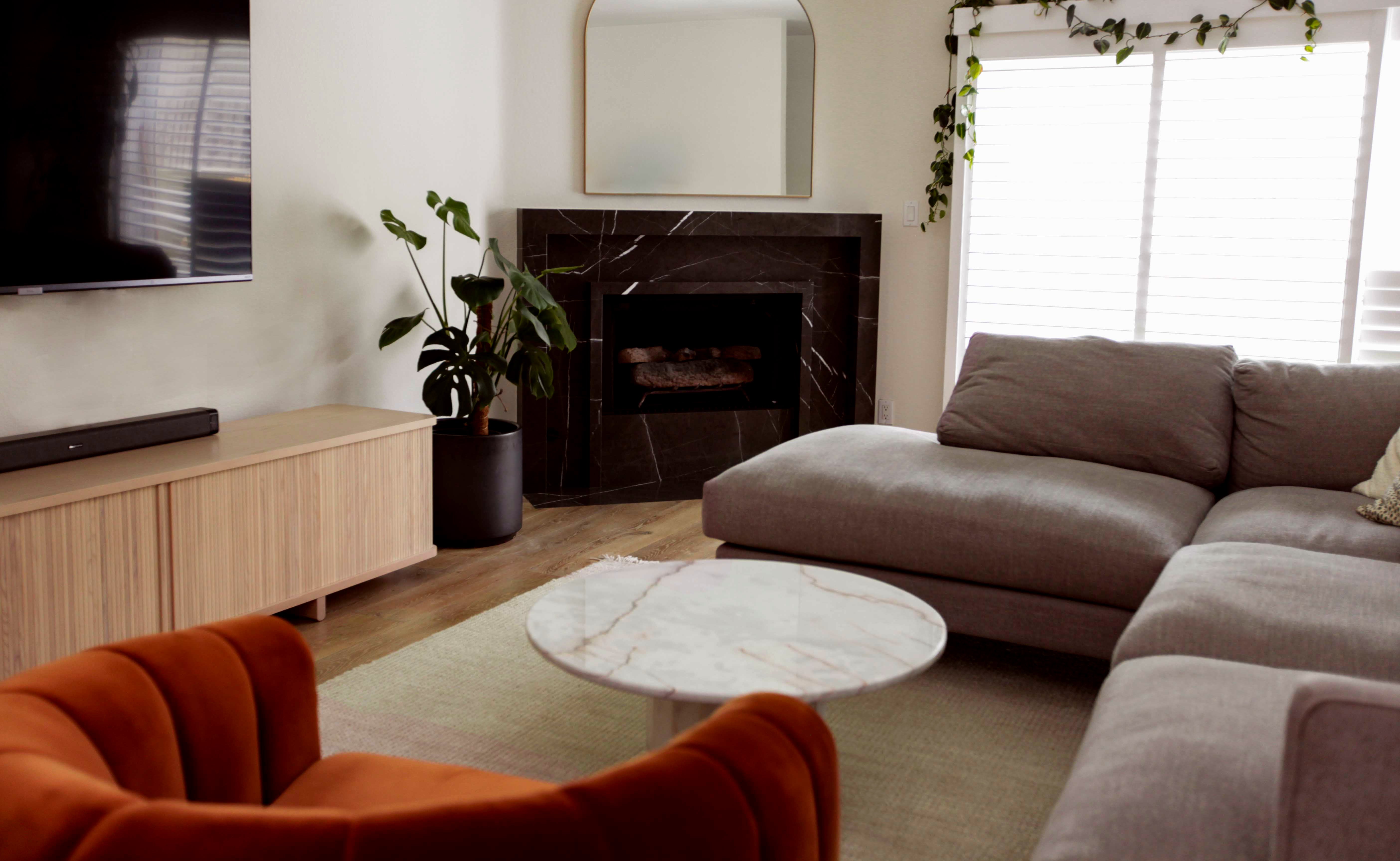 Living room design features custom marble fireplace design and fabrication + new living room furniture scheme inclusive of CB2, EQ3 and a custom stone coffee table.