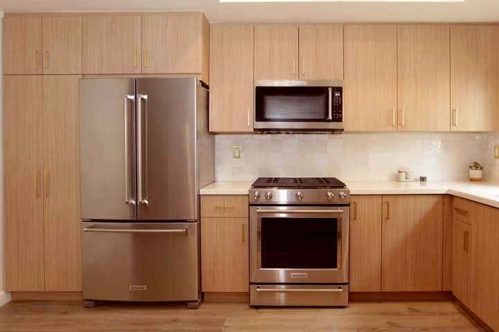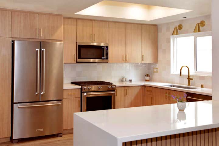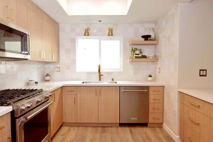 Kitchen features custom design inclusive of new laminate cabinets, flooring, handmade ceramic backsplash, quartz stone counters, Kohler fittings, Cedar and Moss lighting and KitchenAid appliances.