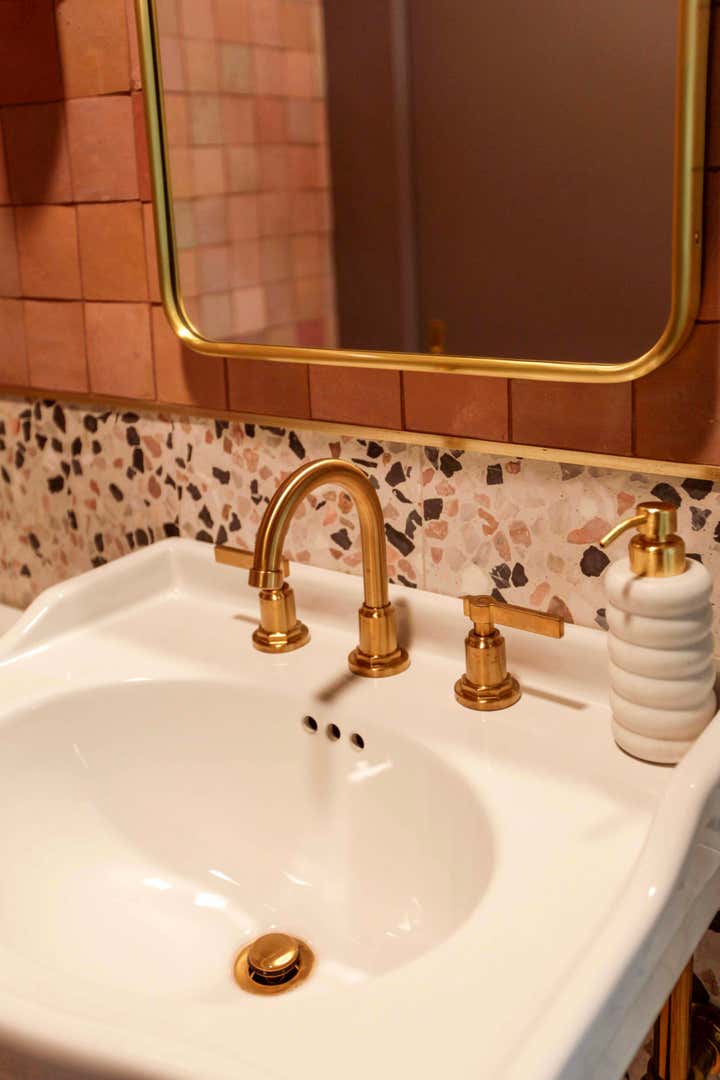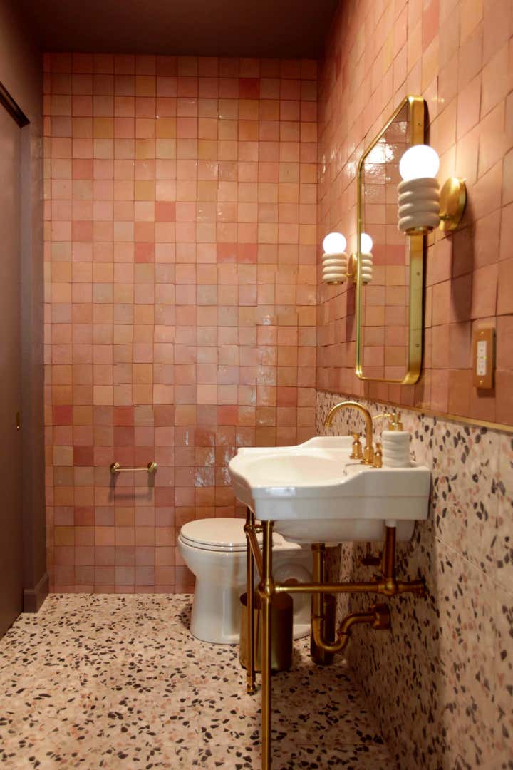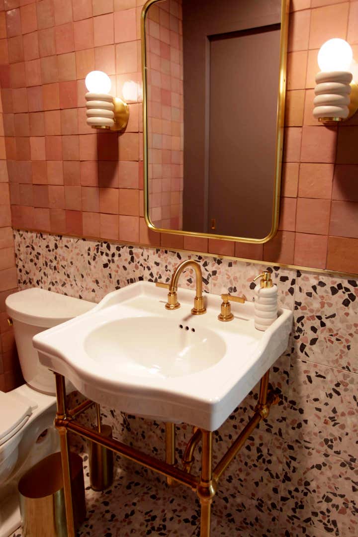 Powder room custom design features Zia zellige tile, Concrete Collaborative terrazzo tile, Signature Hardware sink + fittings, Kohler toilet, Mitzi lighting, Rejuvenation mirror and Sydney Harbour Paint.