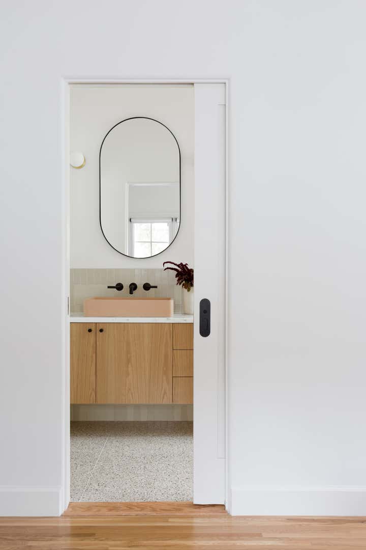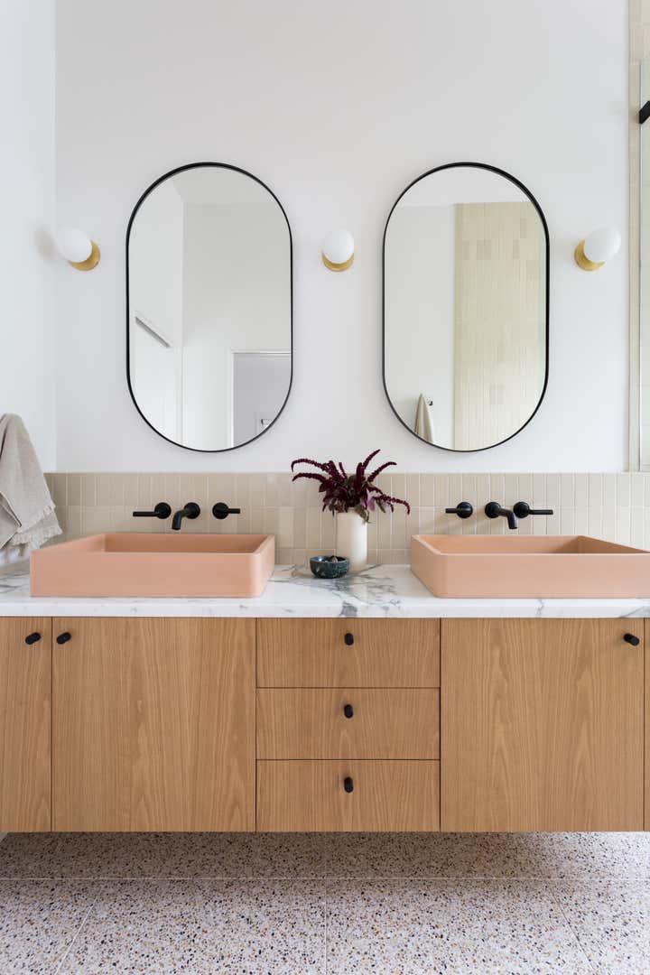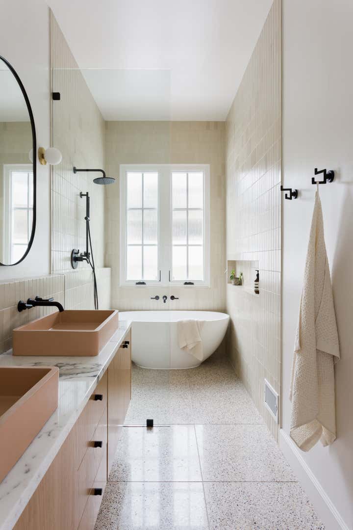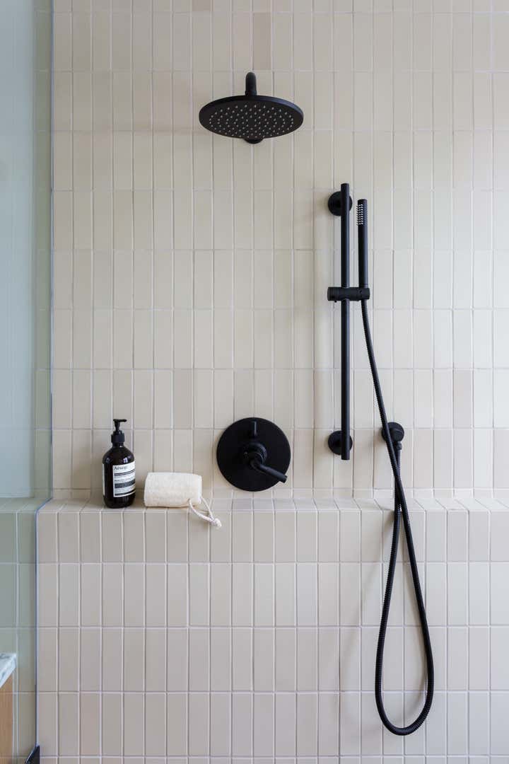 Hive LA Home helped our clients design their Master Bath as part of a larger addition to their Spanish home in Eagle Rock, Los Angeles. Sticking with a neutral palette we were able to give them the bright modern bathroom they envisioned, while keeping it grounded with rich textures: concrete terrazzo floors, masculine matte black fixtures, concrete sinks and, of course, Heath tile. They have plenty of storage with an oversized niche, ledge, and custom vanity.