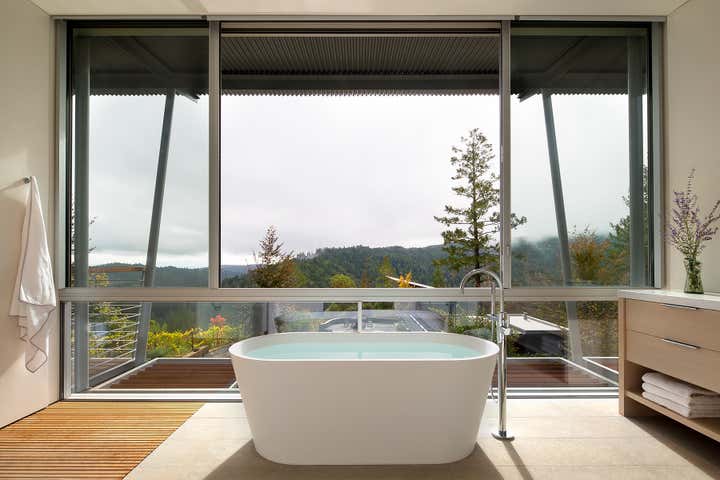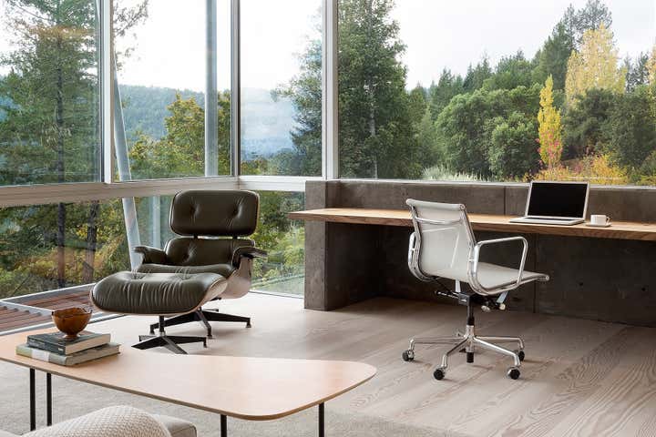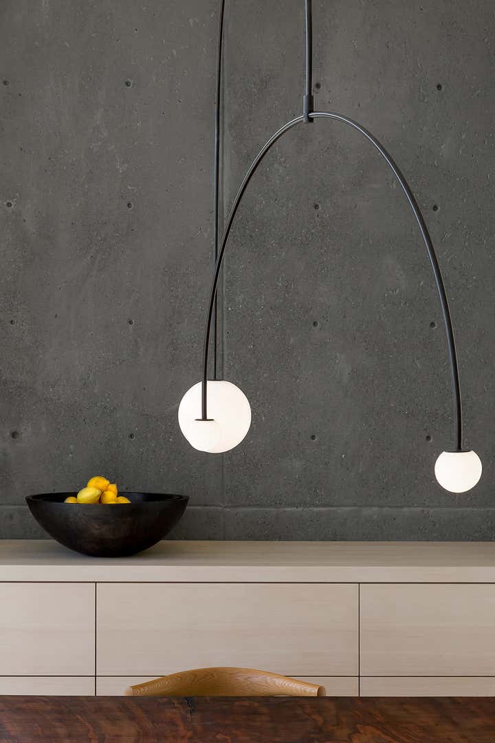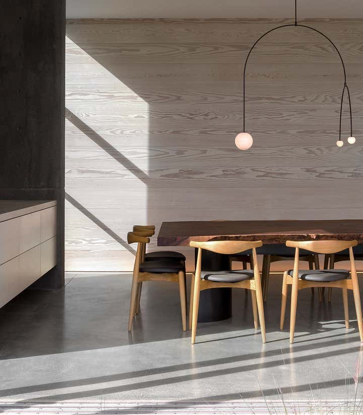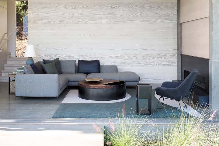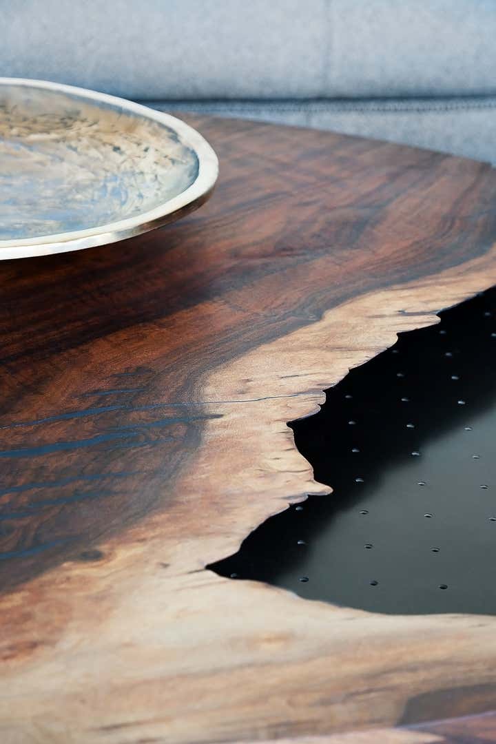 Anchoring the main entertaining space are two tables fabricated from blackened steel with both tops being carved from a single monumental slab of reclaimed Claro walnut salvaged from Vacaville, California.