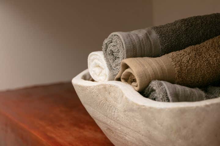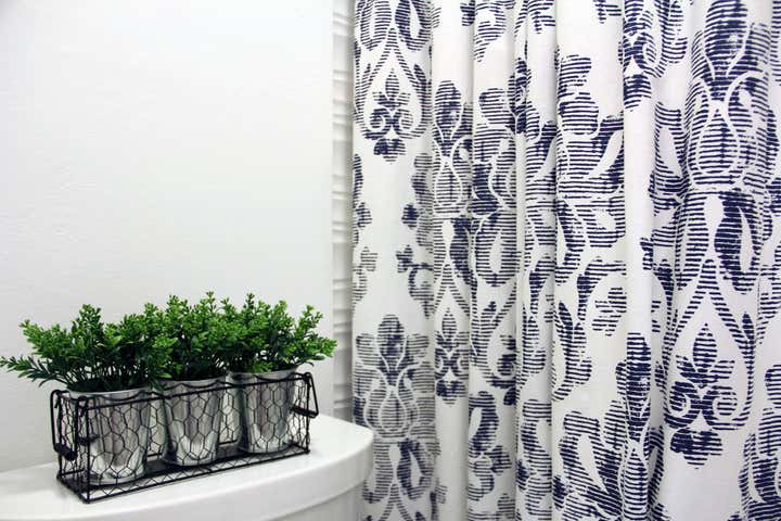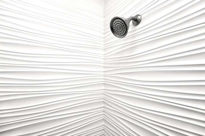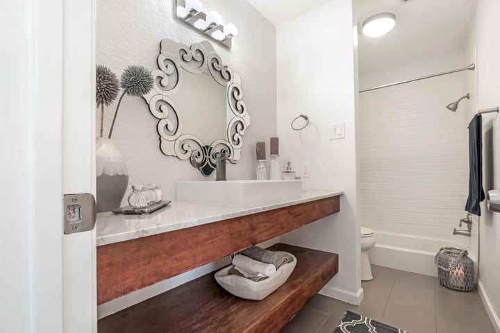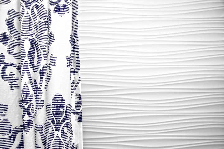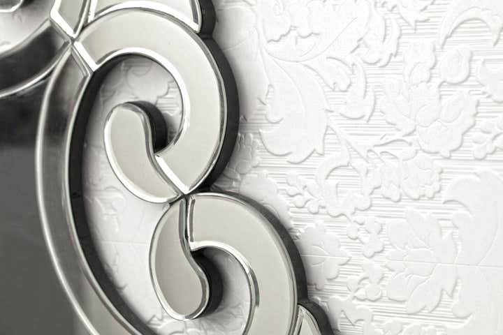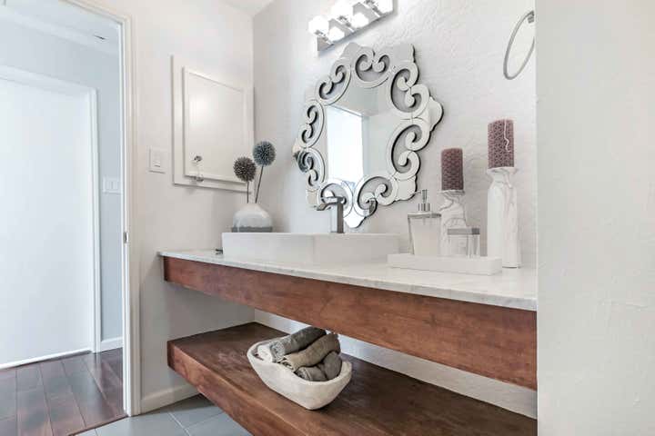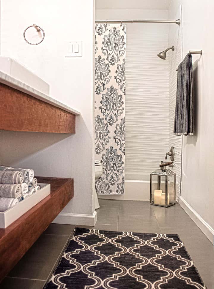 This bathroom entrance is an absolute showstopper. White seamless pattern wall tile imitates carved marble matched with same shape mirror and underscored by two large sturdy floating vanity shelves. Embossed textured walls with statement tiles, stone counter, vessel sink, stained wood vanity, Venetian inspired scintillating silhouette mirror, work with the accents of Mediterranean blue to supply the ambiance of an opulent old-world Mediterranean bath in a contemporary setup. Bathroom accessories in ceramic, marble, and wood emphasize on the character of the bath with blue rug and curtain lining.