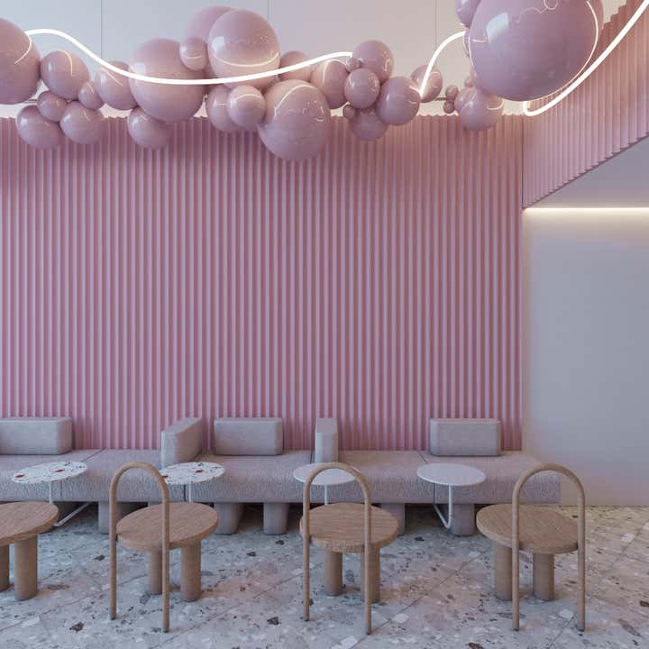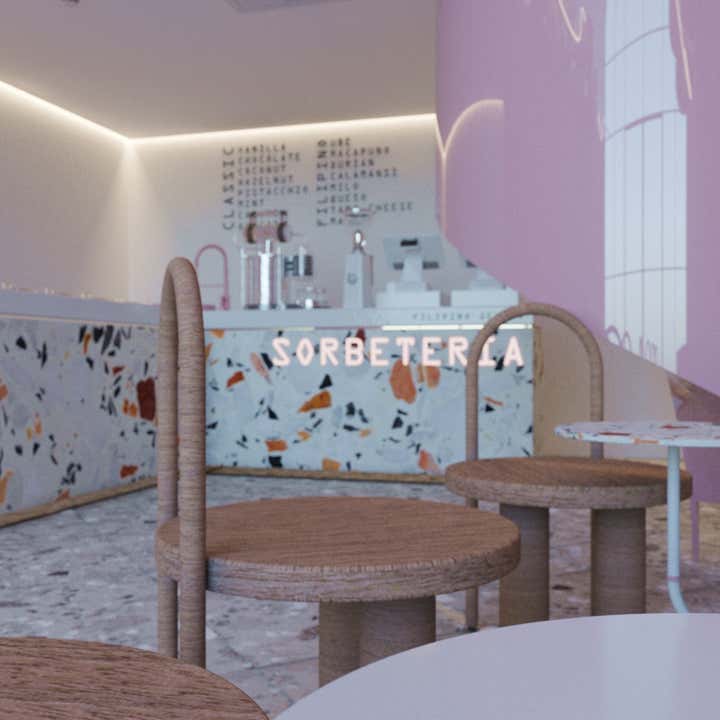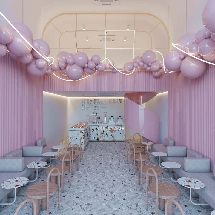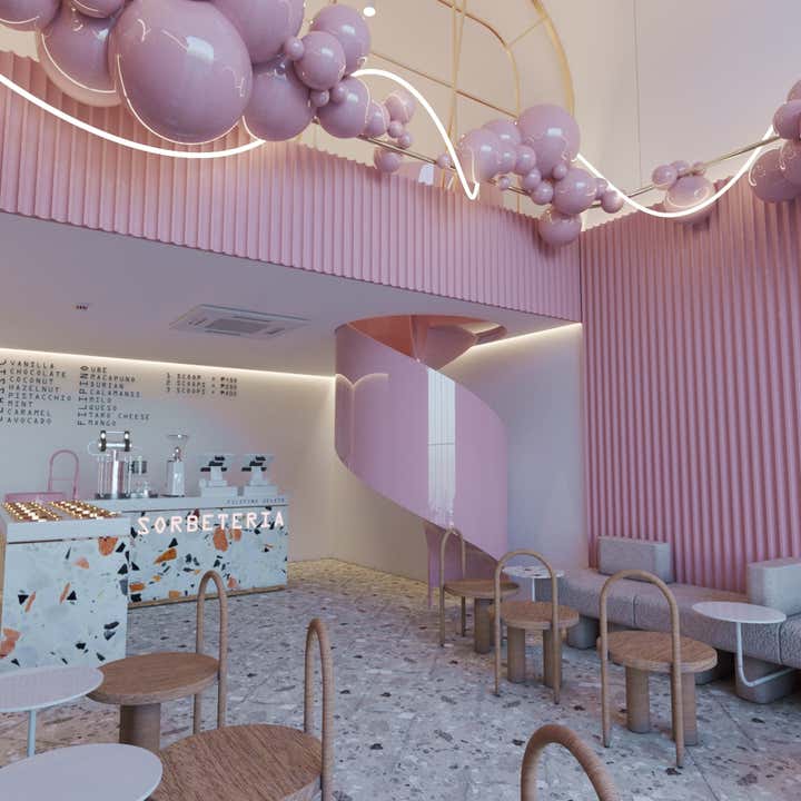 A playful stage to showcase the fusion of a two different yet similar methods of creating ice cream - blending Italian gelato traditions to the other side of the world, Philippines sorbetes or colloquially called dirty ice-cream . The scope required a whimsical and youthful design concept that expresses the sweet and piquant taste of the dessert. The use of colourful terrazzo on the countertops with the grey terrazzo tiles on the floor complements each other, toning down the vividness of the glossy pink elements. The striking bubble elements of the décor mimic the flavourful ice-cream scoops, along with the twisting LED strip which is a simulation of a syrup drizzle - enough to make the customers and passer-bys mouths to water. This typology of interior design is achieved when we are allowed to go for it entirely!