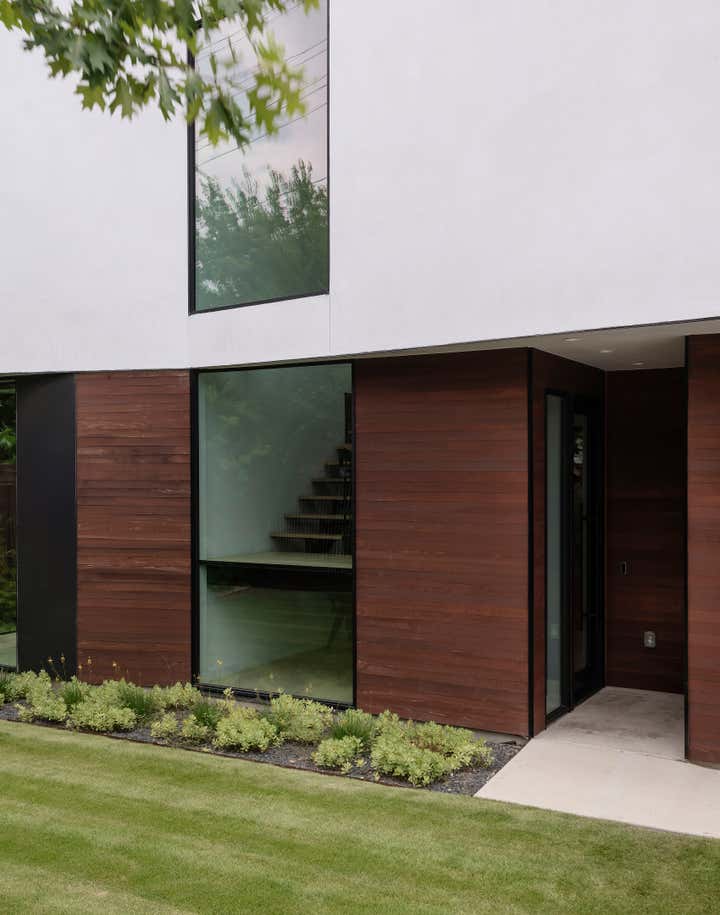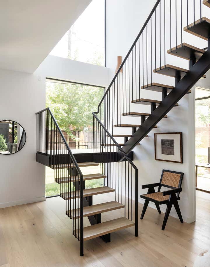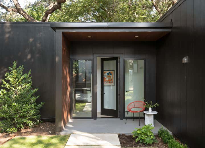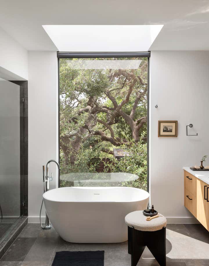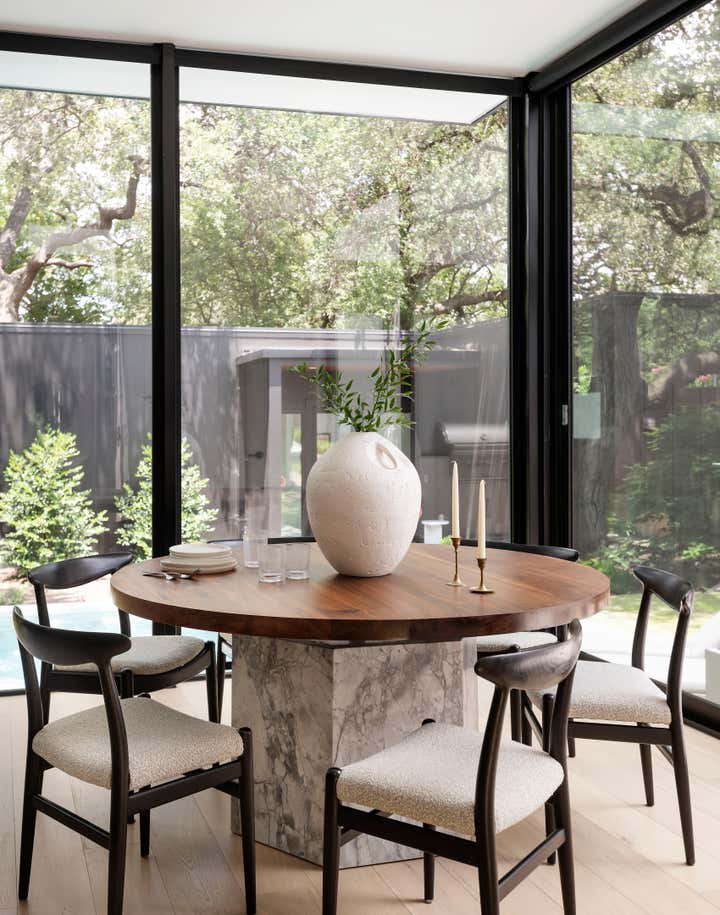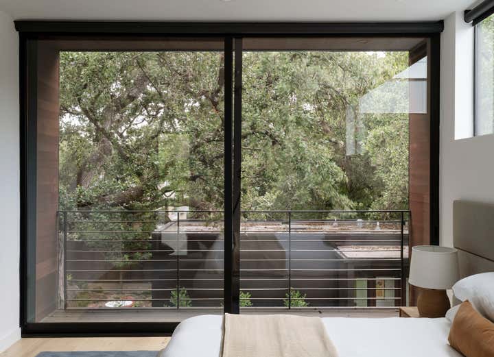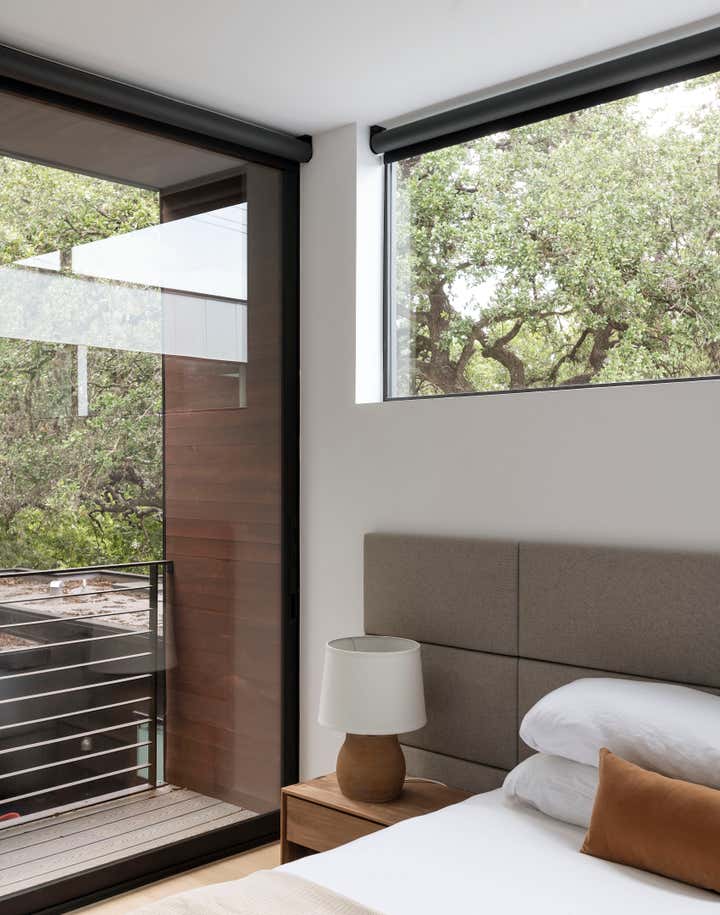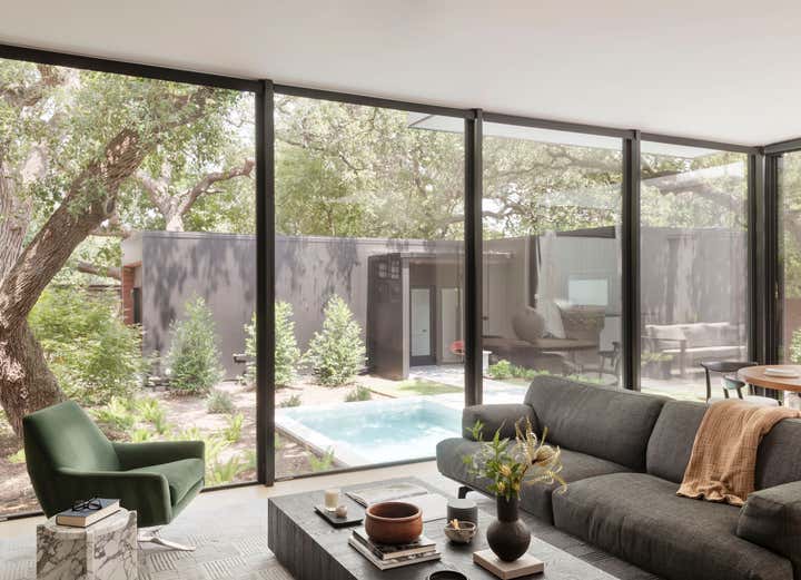 Designed by principal Sara Cukerbaum of SLIC Design, this tranquil three-bedroom home offers a respite from the bustle of downtown Austin. The surrounding trees engulf and shade the property, allowing for privacy and soft light to steep through the expansive glass windows in the home and guest house.