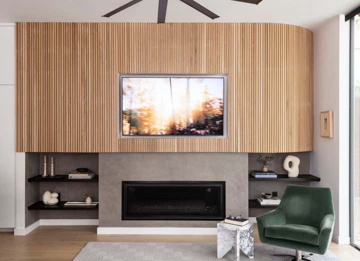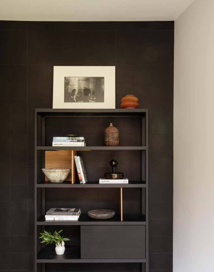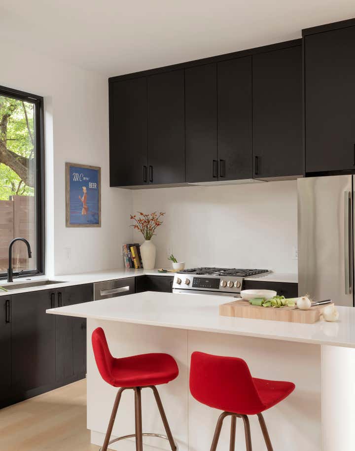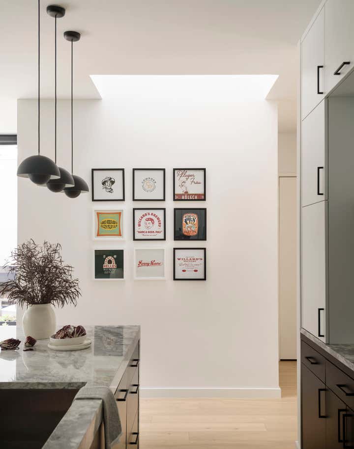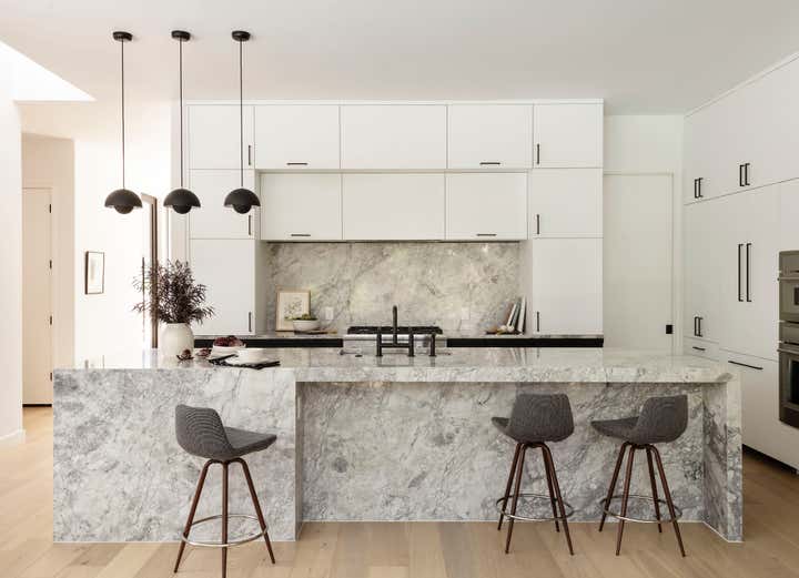 The home is light and airy throughout with a neutral color scheme, yet features masculine touches. Stand out furnishings include a sofa from Poliform, kitchen pendants from Gubi, wallpaper from Arte and more. The backyard maintains privacy through the property’s landscaping and features a pool and ADU with one bedroom, bathroom, living room and full kitchen decorated with fun elements such as cherry red bar chairs, patterned rugs and bold prints.