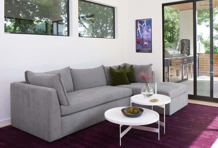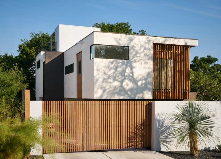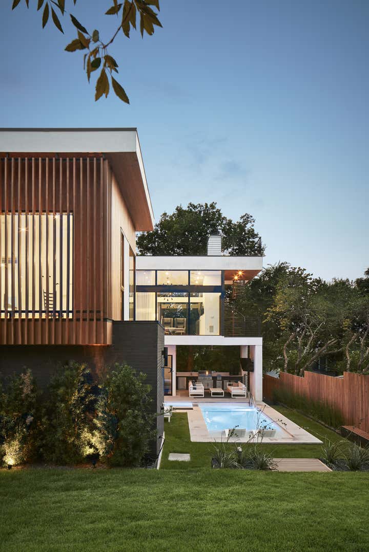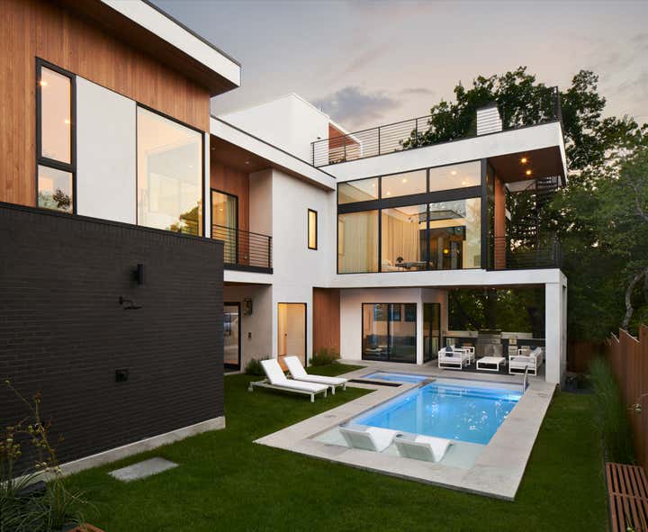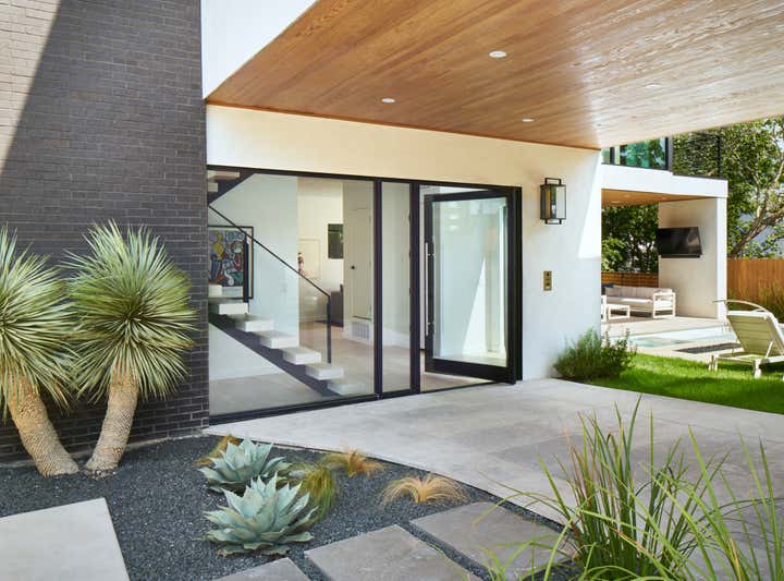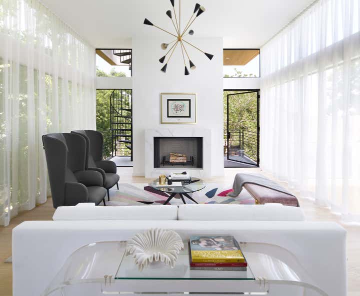 Designed by principal designer Sara Cukerbaum of SLIC Design, this modern glass house in South Austin, Texas, is tucked away in a nest of greenery with an incredible view of downtown. The home features a second floor living space, 12-feet-tall ceilings, oversized glass pocket doors and custom steel stairs. It is a true urban sanctuary with unique architectural and design features as well as a beautiful curation of art.