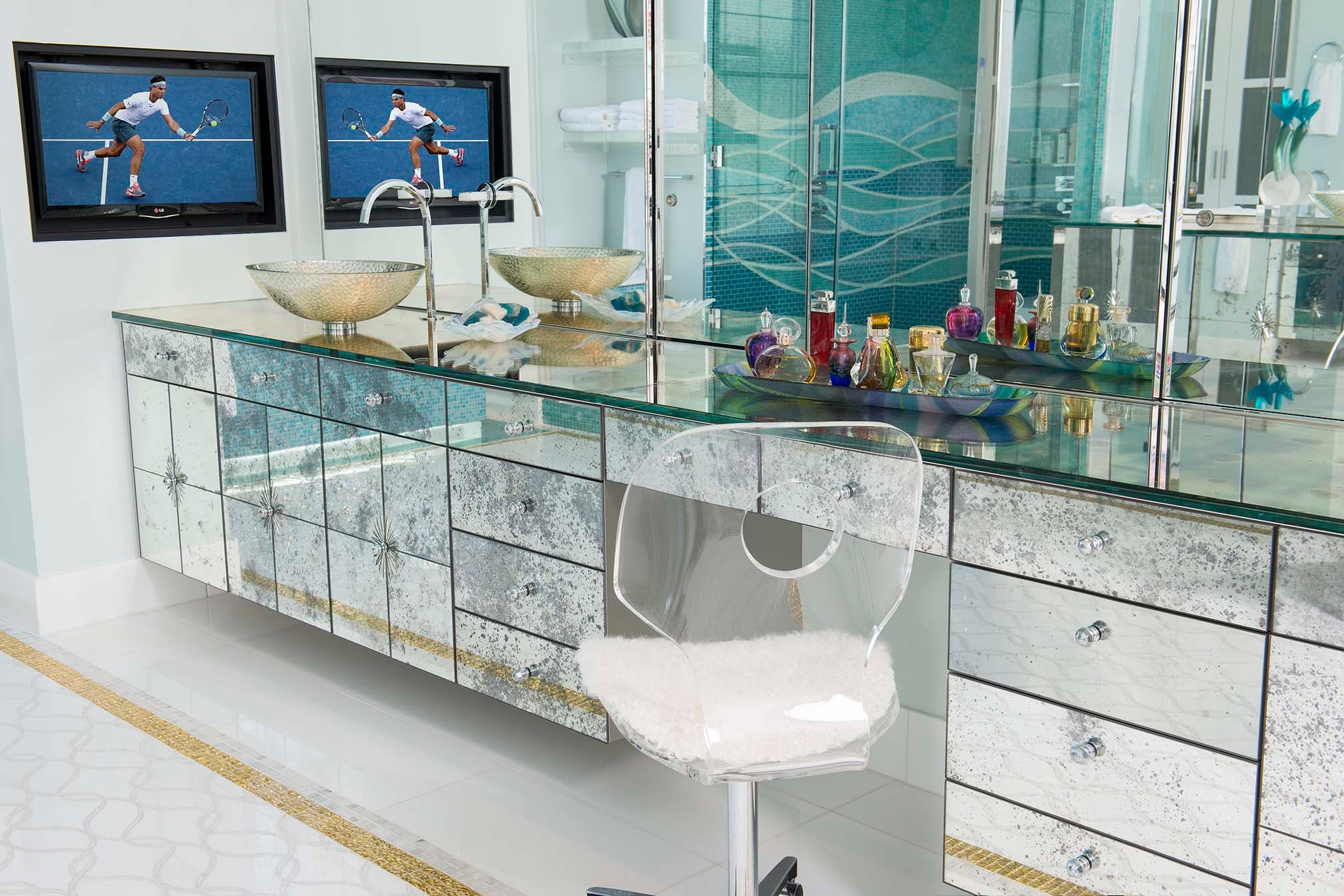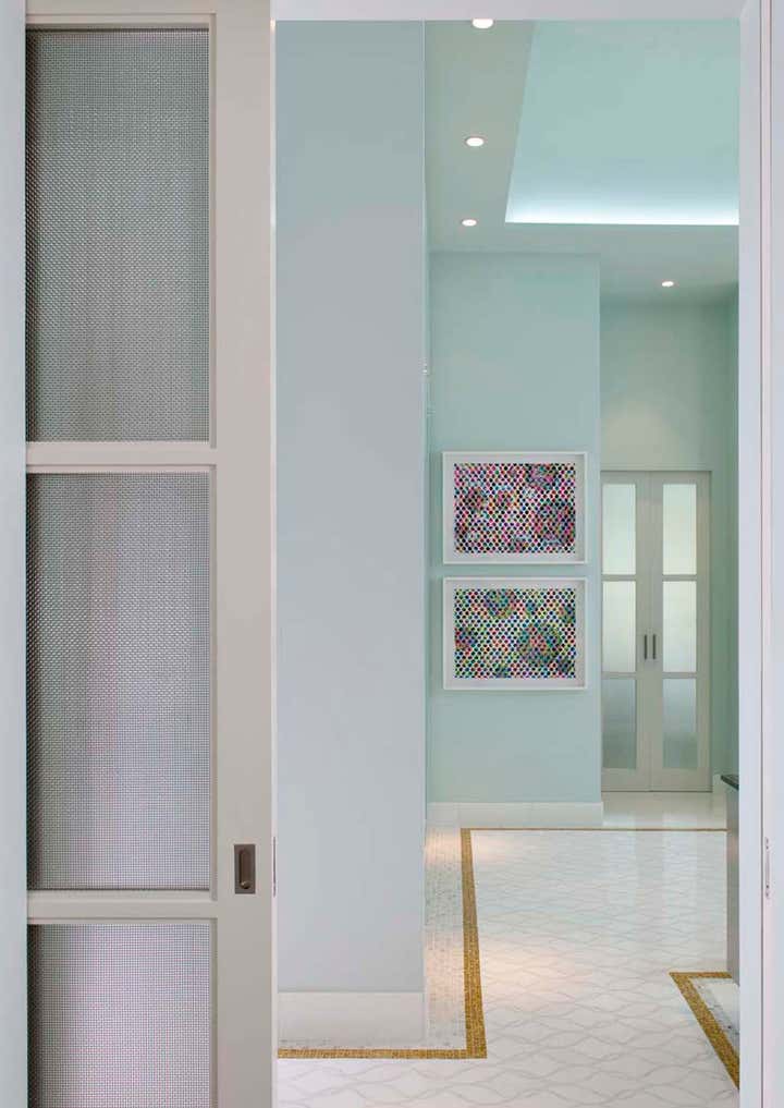 This project perfectly melds two widely divergent collections: Western and Contemporary. To help with that, a foundation is laid by using soothing colors, immaculately finished wall surfaces, an blend of metal, minerals, acrylic, and gold leaf.