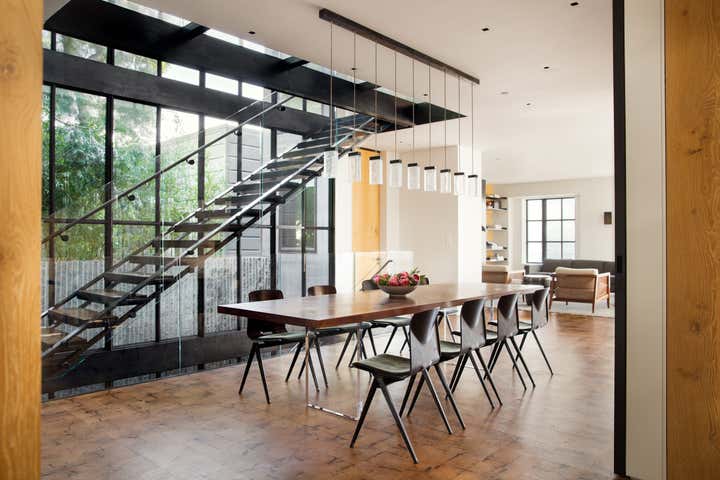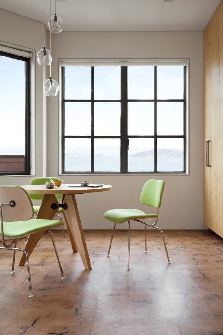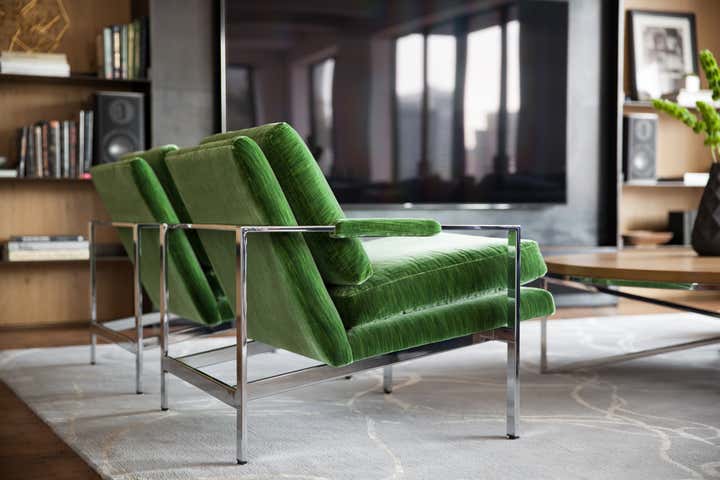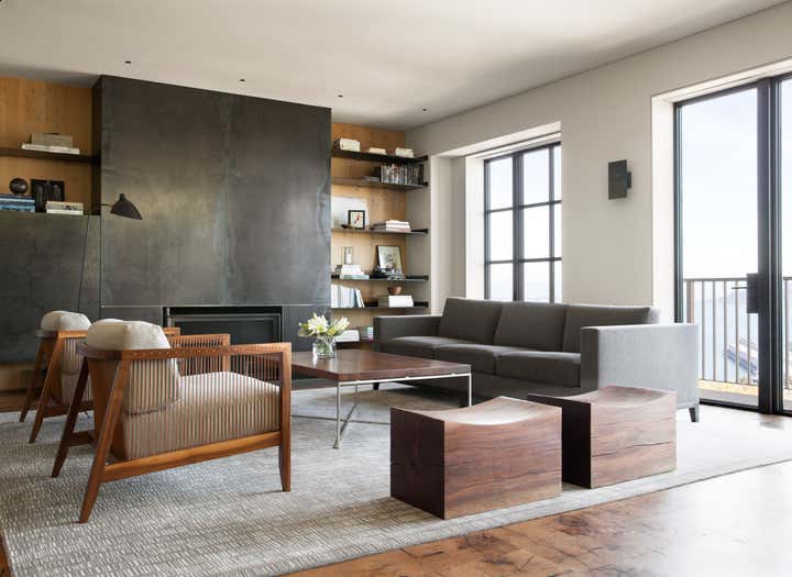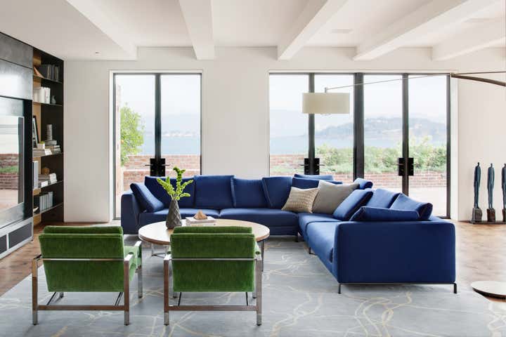 Niche Interiors was enlisted to furnish the interior of this newly constructed 8,000 square foot home with expansive views of the San Francisco Bay. We worked closely with the architects at Lundberg Design to ensure that the furnishings blended seamlessly with the modern architecture and restrained materials. The media room features a wool sectional and a pair of vintage Milo Baughman armchairs reupholstered in a green velvet. All upholstered items were made with natural latex cushions wrapped in organic wool in order to eliminate harmful chemicals for our eco-conscious clients. Vintage mid-century dining chairs are paired with a custom walnut table in the dining room. Steel and glass LED pendants lead your eye into the formal living room which features a Christian Liaigre mohair sofa and Italian armchairs. Niche Interiors designed a cantilevered seat in the living room bay window that maintains the modern and airy feel of the home and takes advantage of the stunning views.