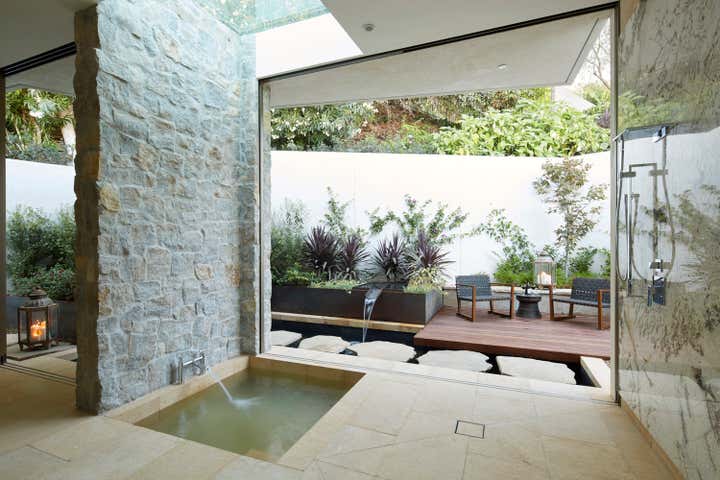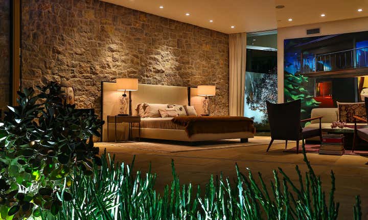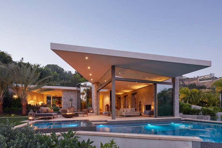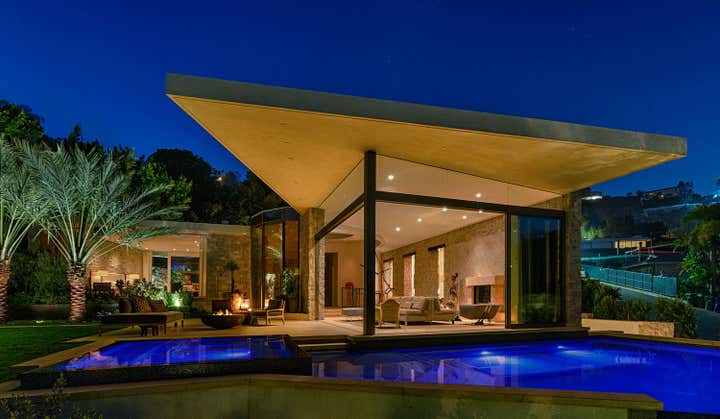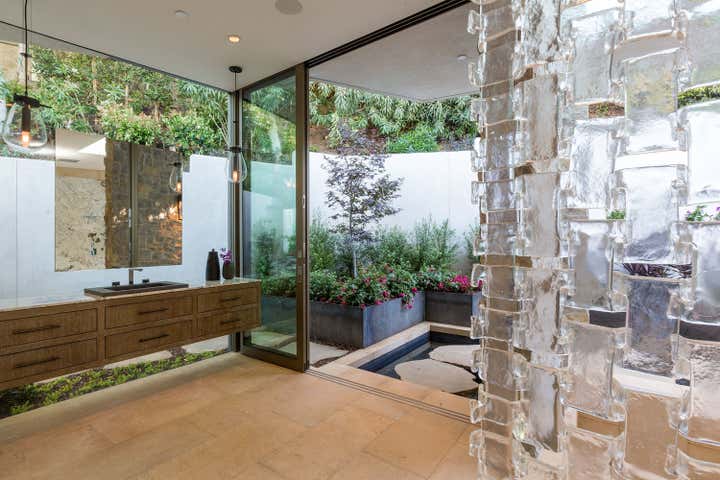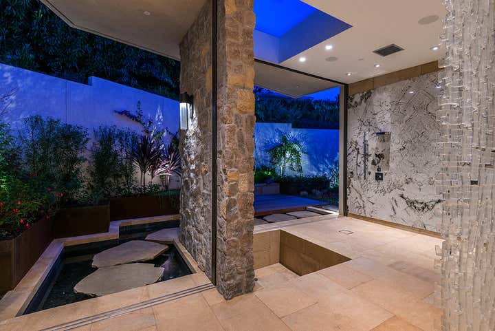 The Bayou House is a single family residence situated in the “Bird Streets” of Los Angeles, CA. In this ground-up construction, every detail was created using Bradley’s World Modern aesthetic, sophisticated materials, and unparalleled craftsmanship. The indoor/outdoor living space is optimized with retractable glass walls, an infinity pool with spa, and private entertaining areas. The sunken living room, dining room, and expansive chef’s kitchen look out to city views. The master suite features a fireplace, spa bath with a custom sunken tub, heated floors, glass walls that open onto a koi pond, and a private garden with yoga deck. The house boasts five ensuite bedrooms and two powder rooms. The lower level includes an office, lounge, and bar area that leads to a luxurious screening room/theater.