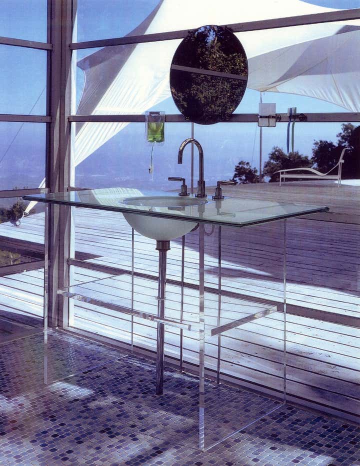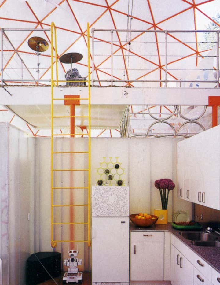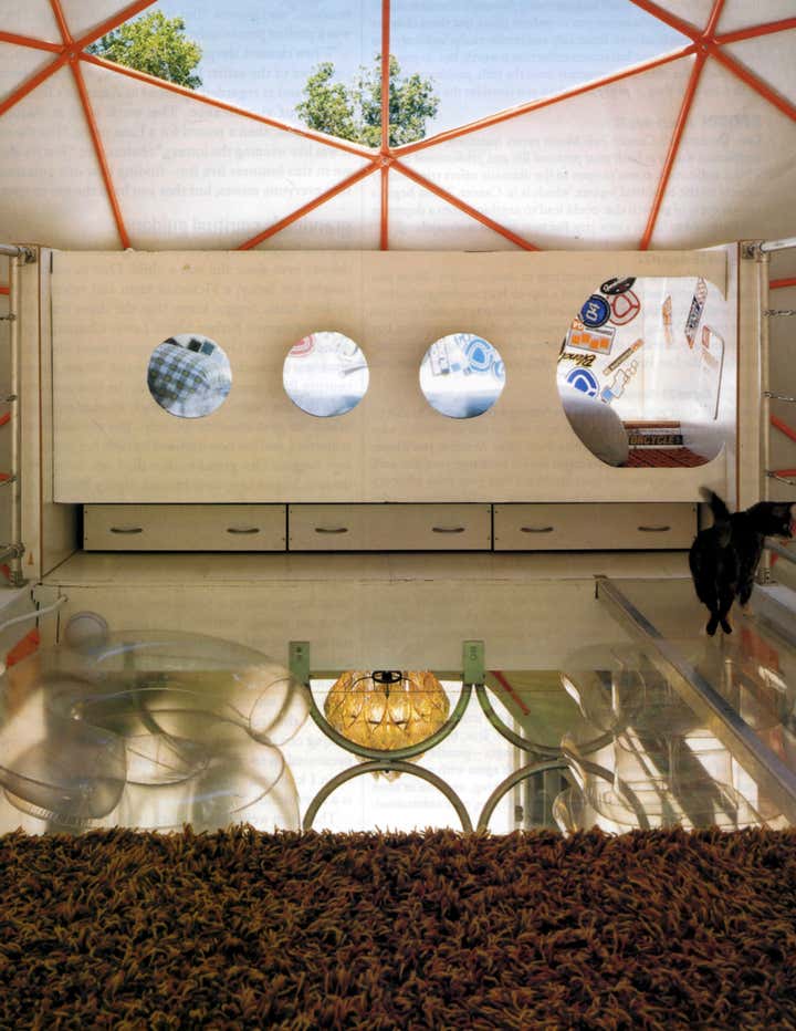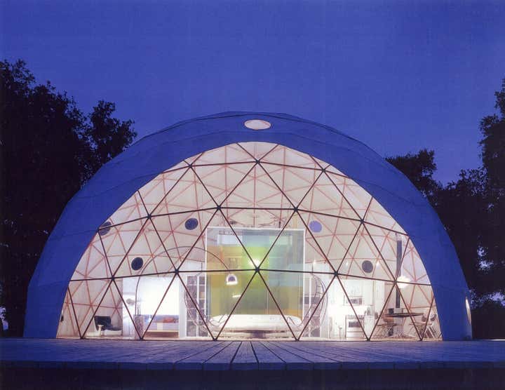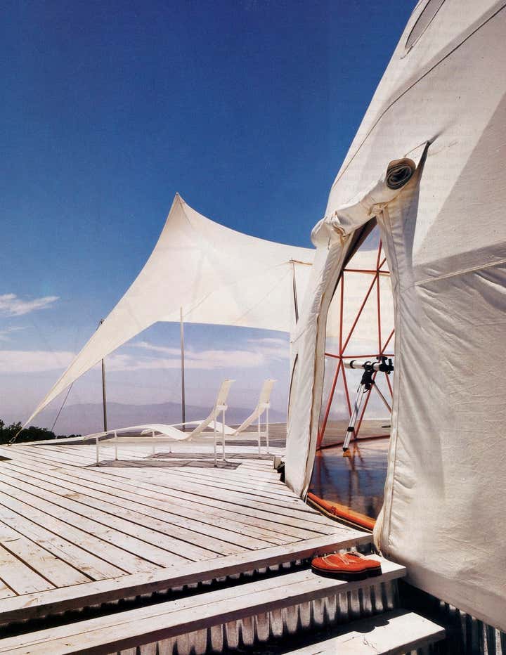 As a personal project, Shawn and Jessica looked to nature and geometry to create a geodisic dome on an undeveloped mountaintop site overlooking the Topa Topa Mountains. Derived from a kit by Pacific Domes, the dome was built from metal conduit, powder coated in safety orange, and covered in a treated canvas skin. The open-plan interior was furnished with mid-century pieces from Eames and Tobia Scarpa.