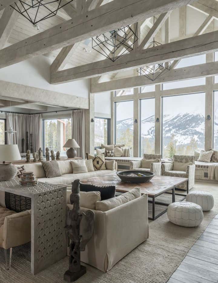 Located in the Rocky Mountains of Montana, this house took on the challenge of being a rustic mountain home while using tones of white as the backdrop. The design team at Cashmere carefully selected a white wash formula for all the wood work, timbers and cabinetry that read as modern with depth and warmth at the same time. The result was a feeling of Zen!