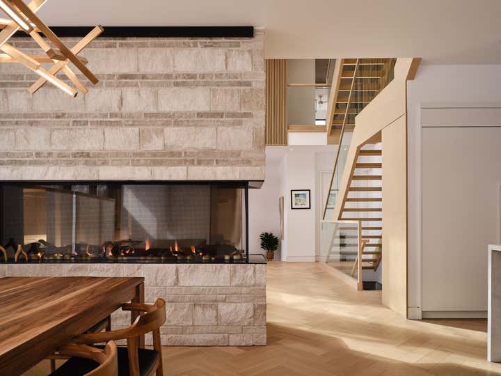 The aptly named Swansea Hilltop Lookout is positioned at the top of a hill in Swansea, and has direct views of the CN Tower and Lake Ontario. To better proportion the width and height of the home, and to better fit within the streetscape, this design integrates the third floor into the roofiline. The dramatically steep mansard roof is designed to allow maximum natural light into the backyard in the late afternoon hours, and the thick gauge standing seam metal acts as a contrasting cap to the to the bright and refined Indiana limestone that clads the walls.
