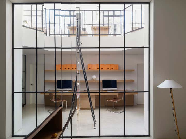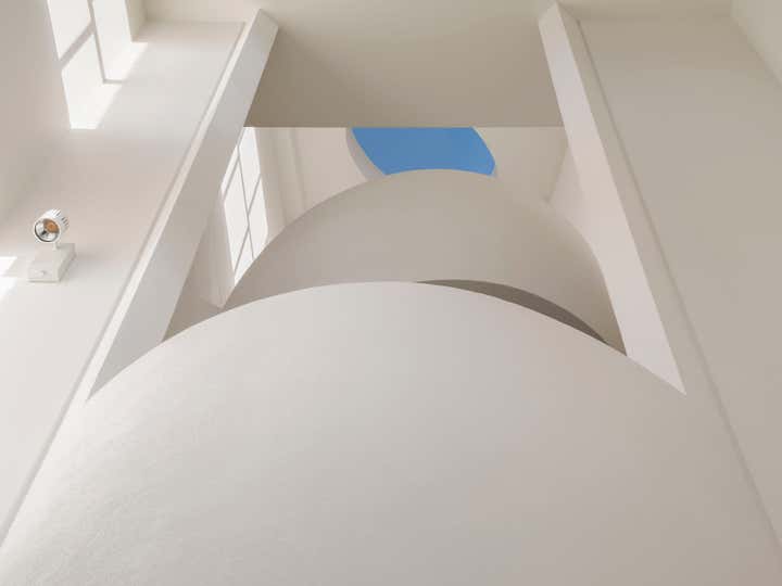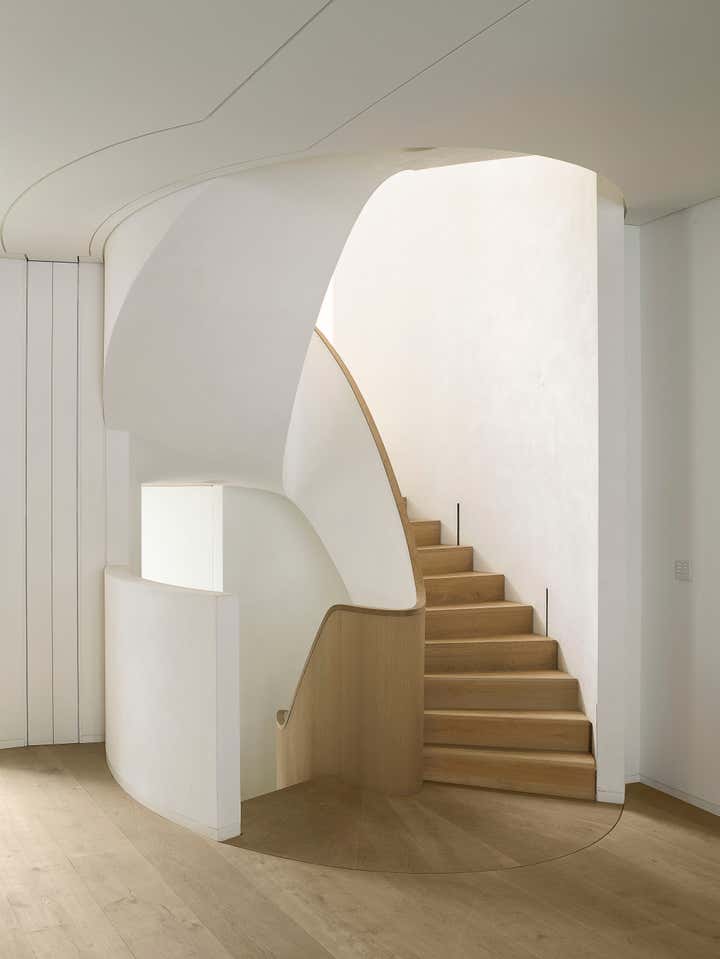 Designed for a film director and her husband, this elegant family home in a handsome, half-moon terrace of stucco-fronted houses was built by William Chadwick in the late 1850s. Central within the house – and echoing all its external shapes and materials – spirals a staircase exclusively designed by the studio and inspired by the work of Barbara Hepworth: the concept which won the commission. This staircase – its silhouette a constantly-moving horizon which appears and disappears as it turns through space – passes from room to room, shifting in shape, texture and colour as absence gently makes way for presence. With each of these intervolutions, contours are defined and clarity given to all the materials in play. Every sculptural element – surface, edge, scale, texture, colour – was painstakingly considered by the studio as the design determinedly carved new shape into existing space. The point where smooth wood interior and rough stucco exterior meet; the clarity of the resulting white and wooden elliptical volumes gives the design its lyrical quality – a visual exchange between flowing surfaces and clearly defined edges.