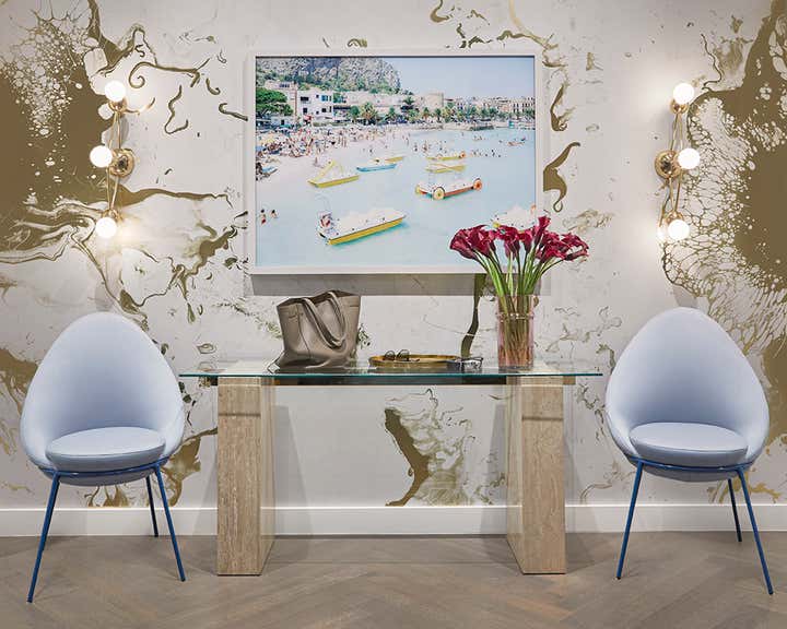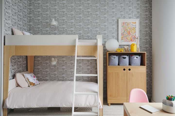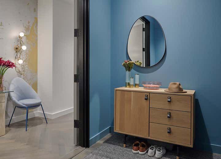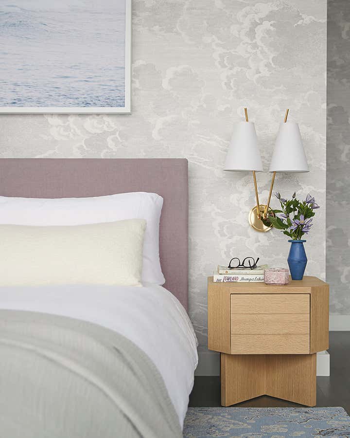 Lucy decided that they could have both and set to work developing a palette that incorporated tones of pink, blue and grey that captured the serene feeling she wanted while giving him the color that he craved.