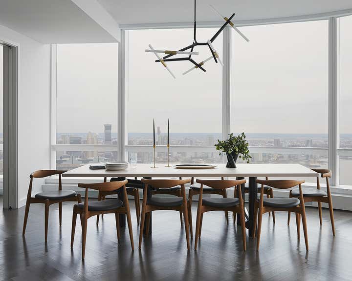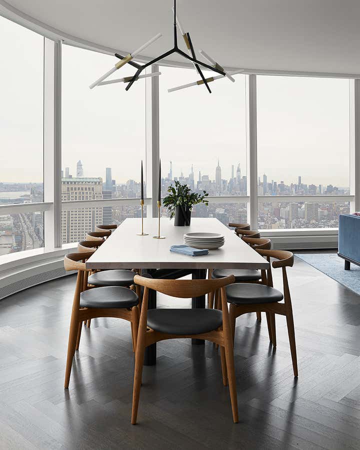 Aiming for an elegant, Italian Modernist-inspired family home Lucy and her team hunted for original pieces that would harmonize well with the modern architecture and spectacular view: Hans Wegner dining chairs, a few vintage travertine pieces, a pair of lyrical Marco Zanuso Lady chairs and a Henry dining table from Egg Collective.