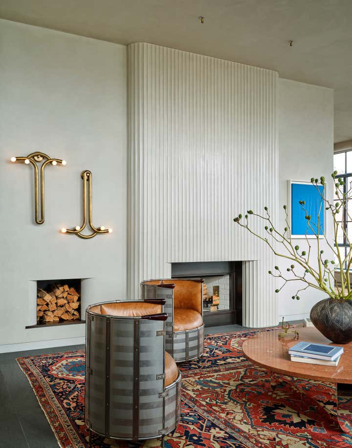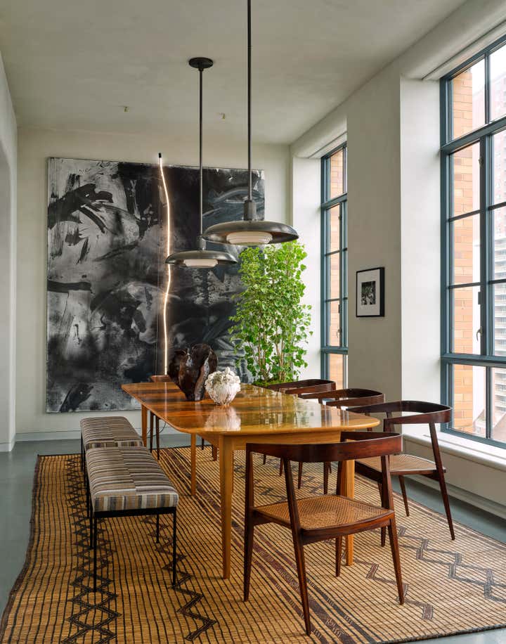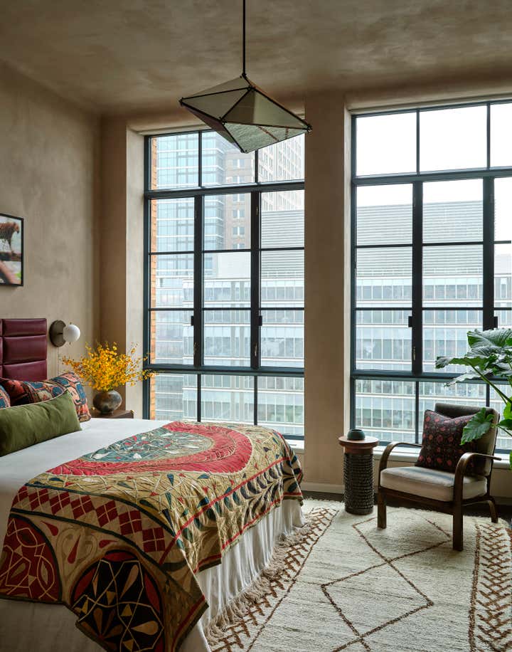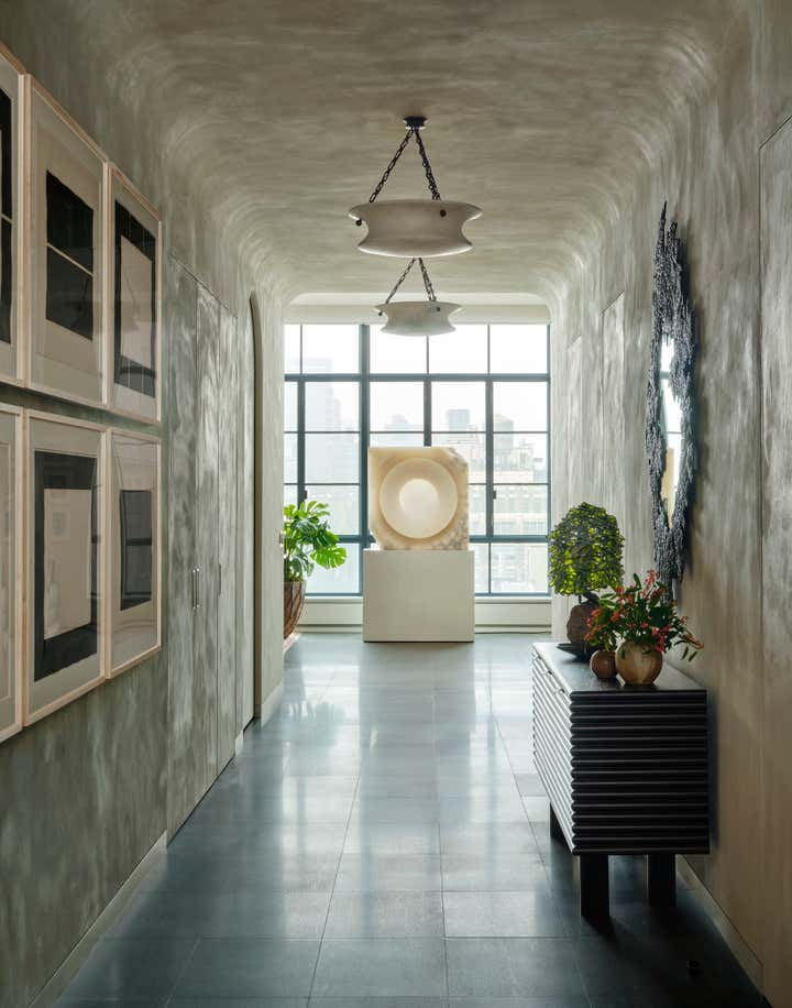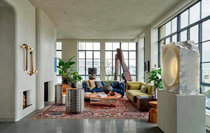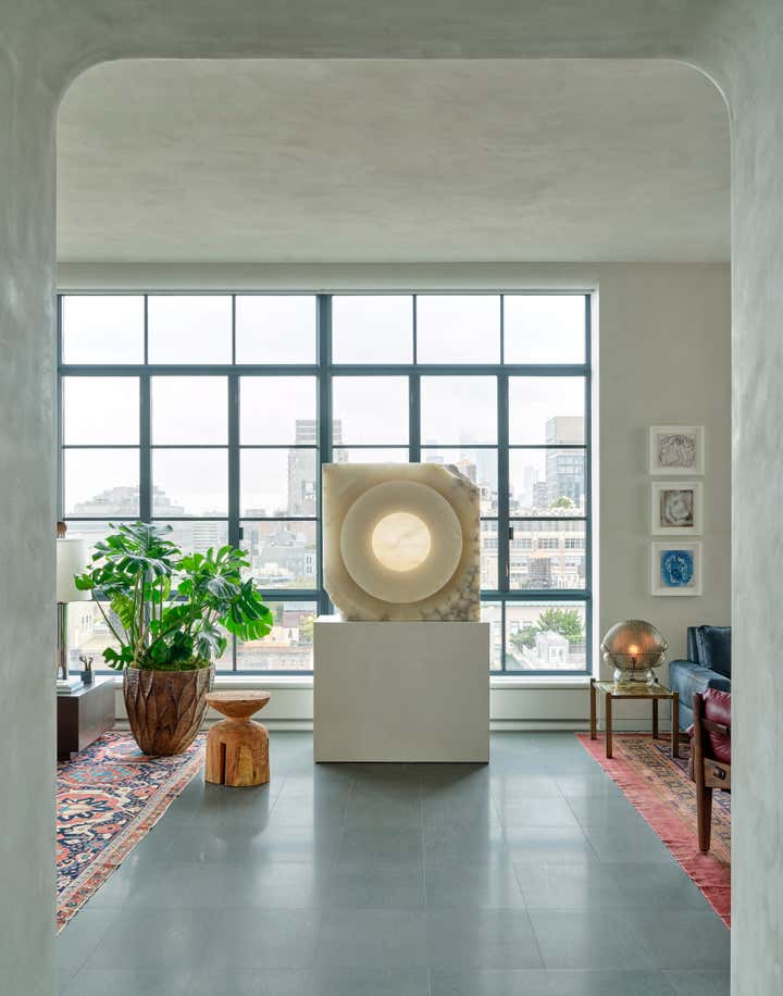 This art-filled penthouse loft, perched above the streets of Manhattan, offers breathtaking city views. The design team softened and enhanced the contemporary architecture by introducing curved details, plastered walls and ceilings, and layered, globally-acquired textiles. The result is a space where architecture, art, and furnishings seamlessly converge, crafting a truly harmonious environment.