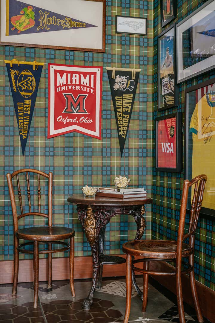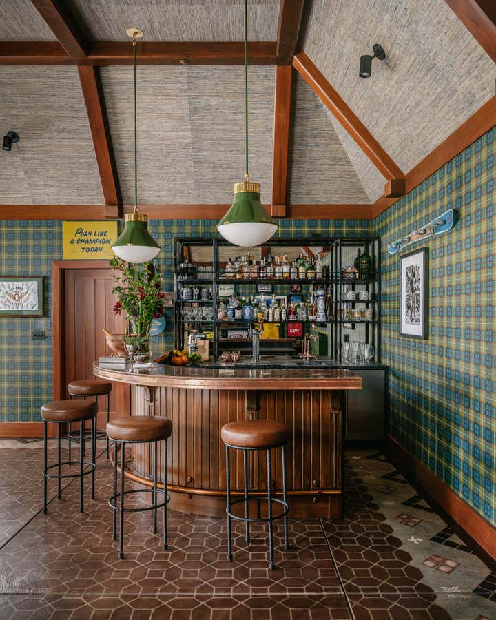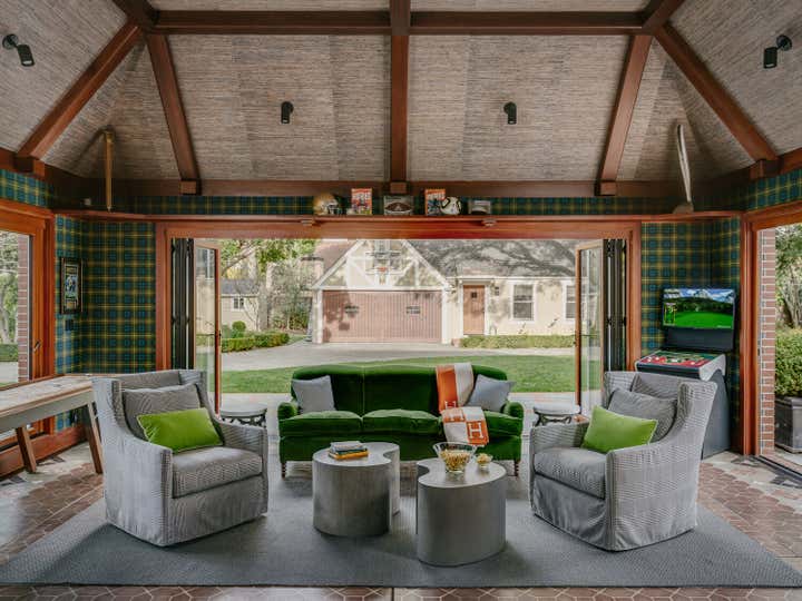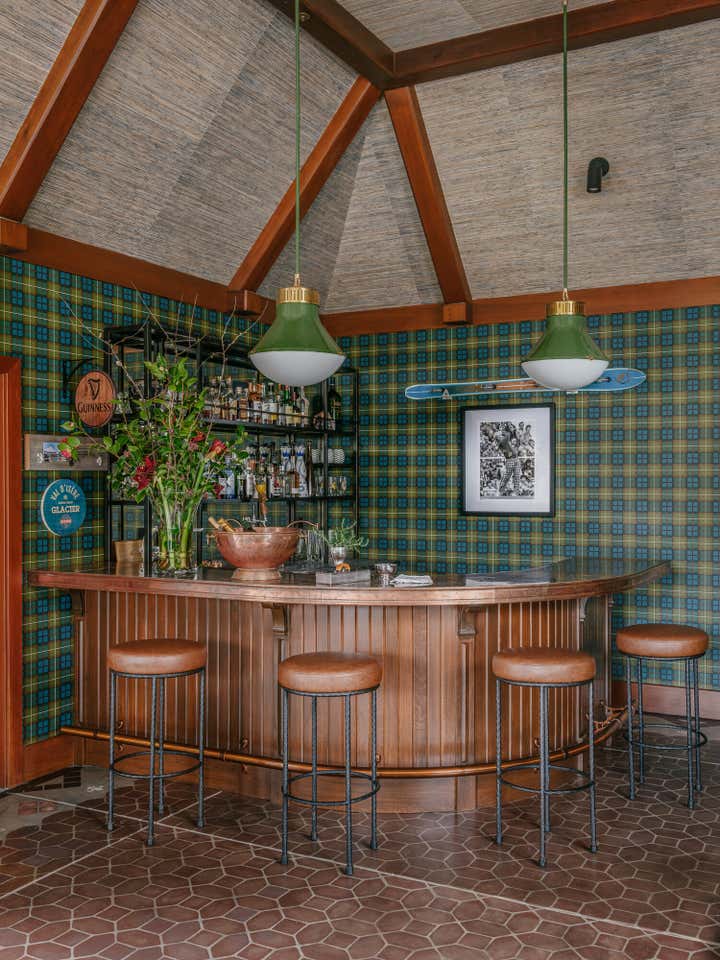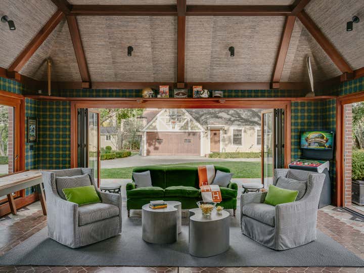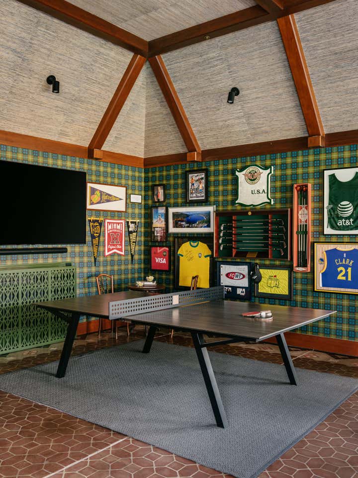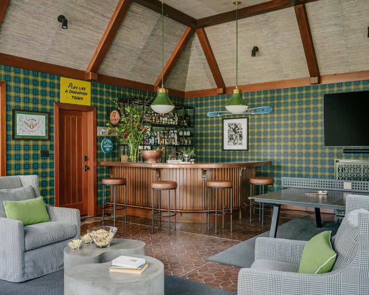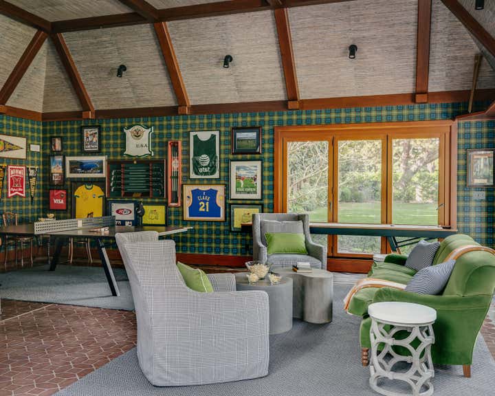 What started as a solution to an ordinary pool house’s heating and acoustical dilemmas turned into a bespoke entertaining space for a family of five who love sports, travel, and enjoy a variety of experiences. The clients were inspired by a trip to Dublin (specifically by the floors of St Patrick Cathedral in Dublin) and requested the room felt like what they saw on their travels through Ireland. KMD worked with local artisans and craftspeople to transform this refuge to a vibrant, comfortable, and warm recreational space.
