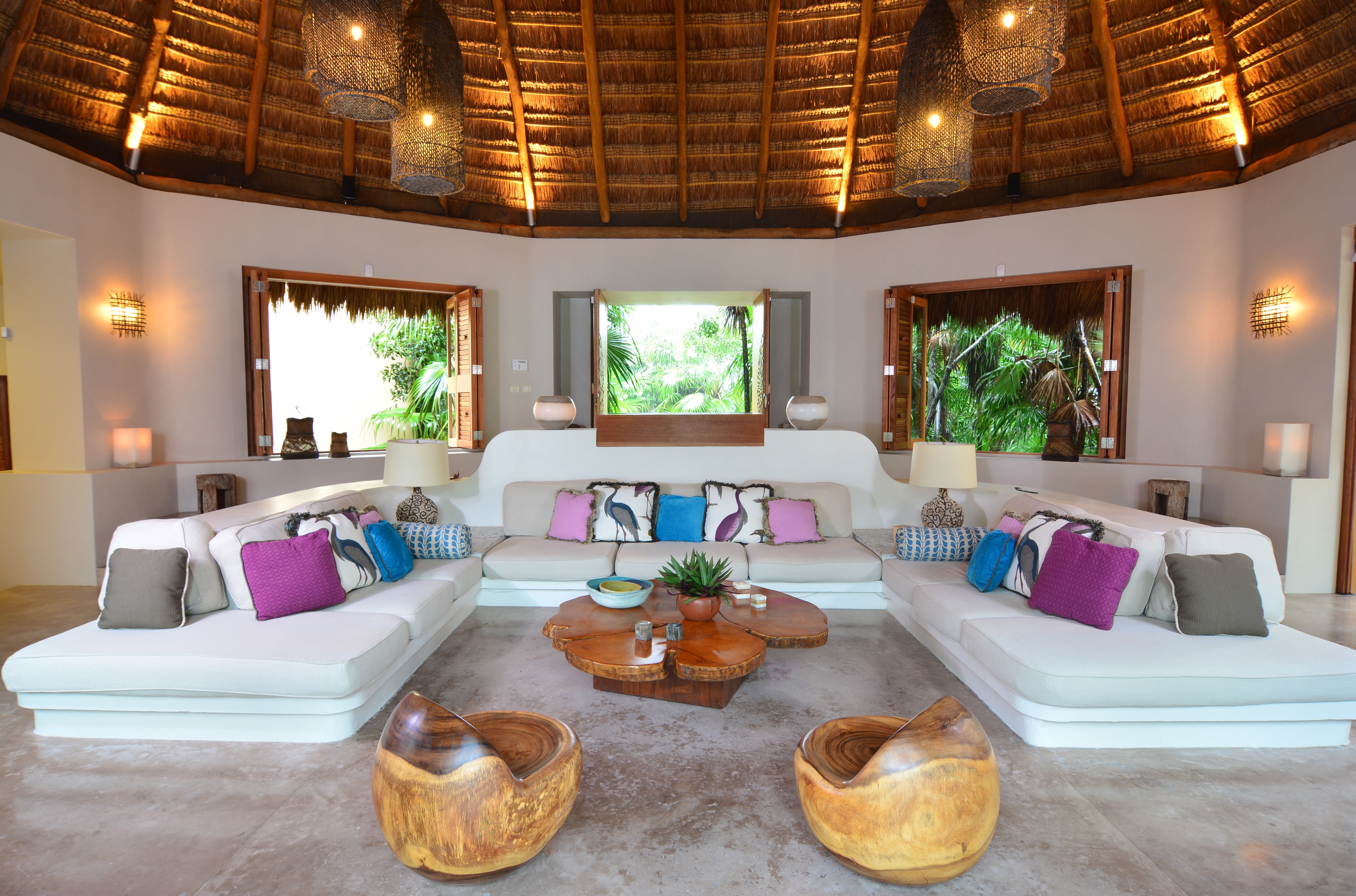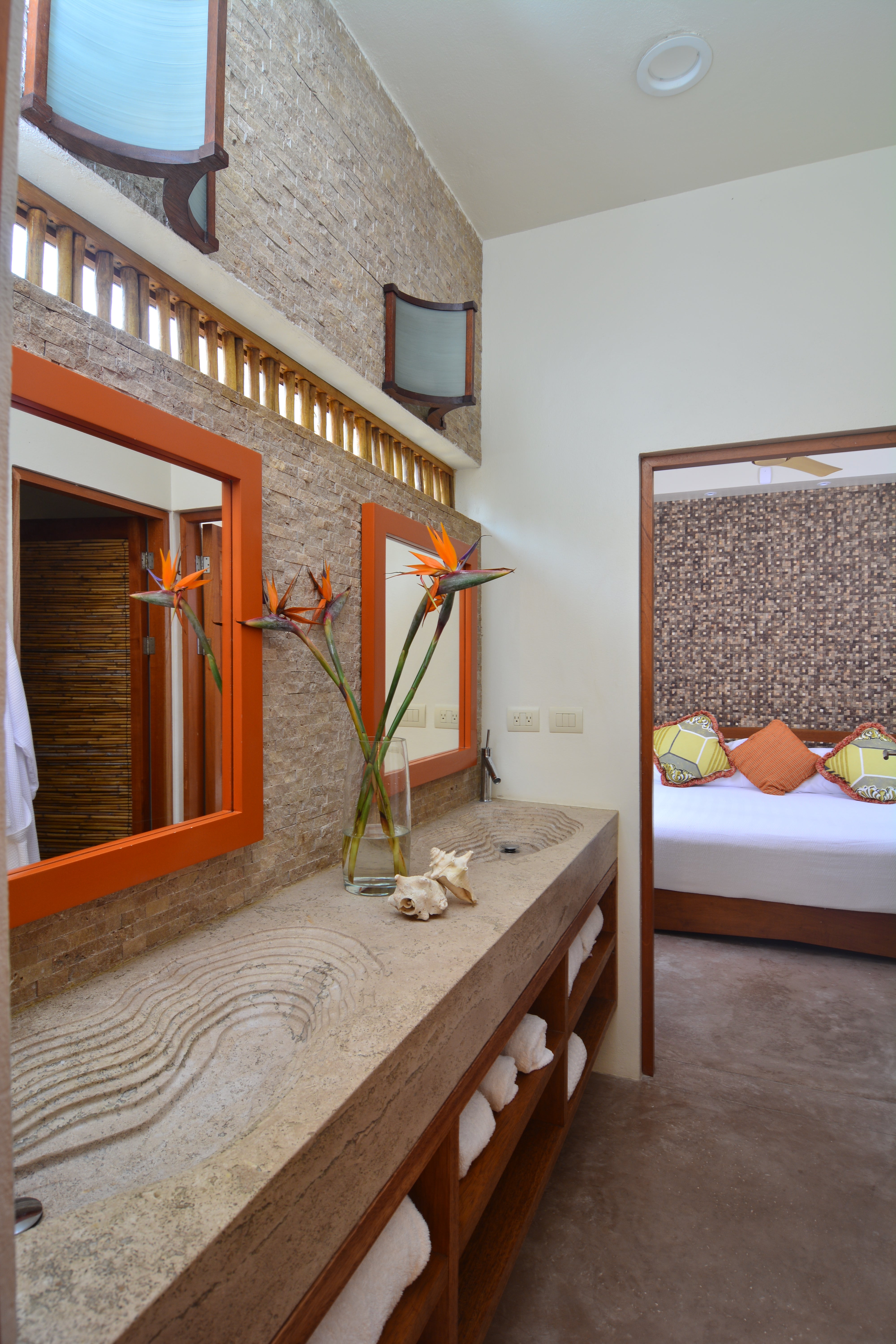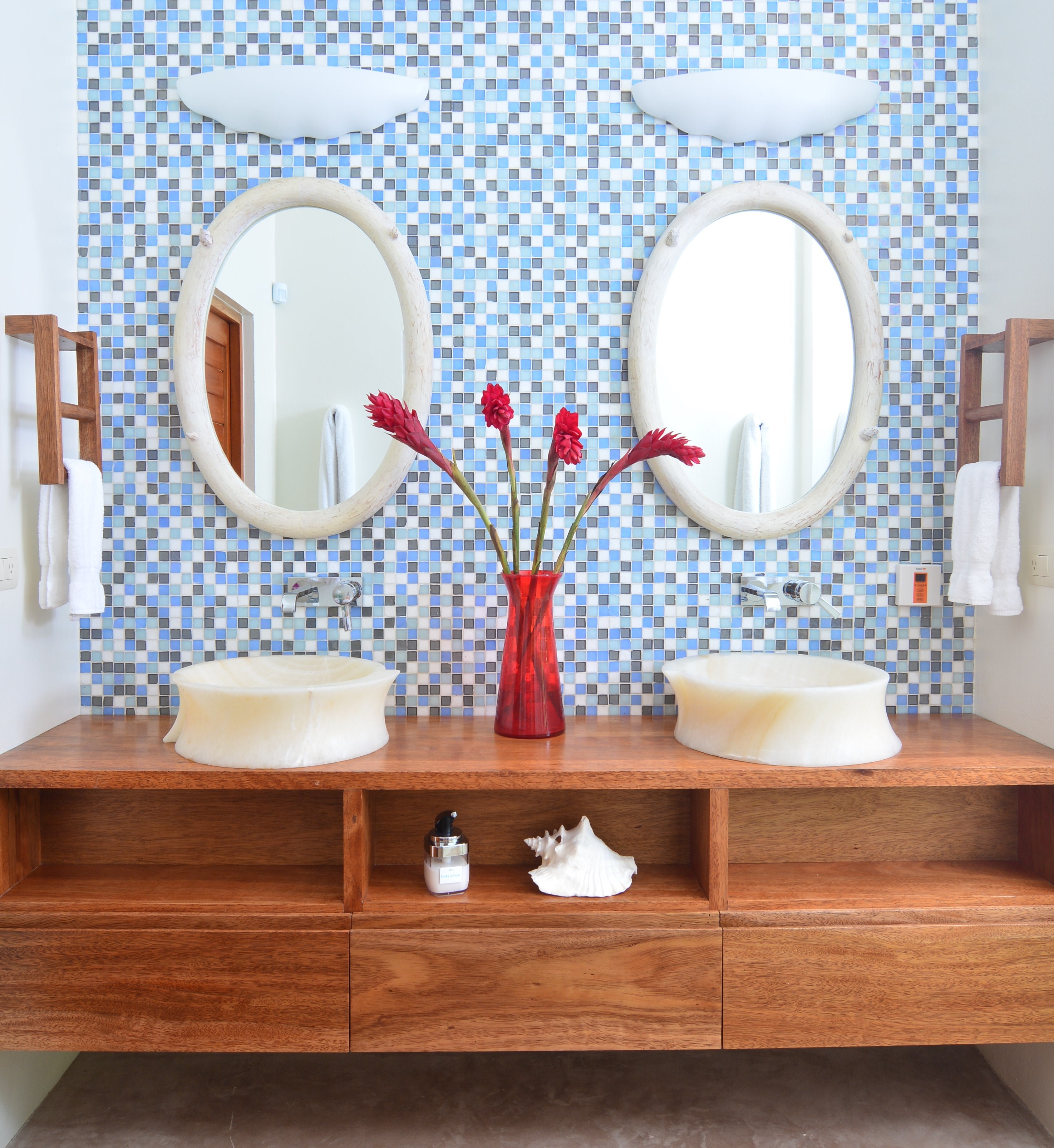 Susan Jamieson collaborated with the architect to design this four bedroom, open-concept villa resort as to minimally impact its surrounding biosphre reserve. Working with local craftspeople and using sustainable materials, Jamieson designed custom furnishings and architectural elements to mimic the tropical milieu including a handcarved mahogony tub, coconut shell headboard, concrete waves sinks and authentic palapa roofs. Overlooking the Caribbean Sea.