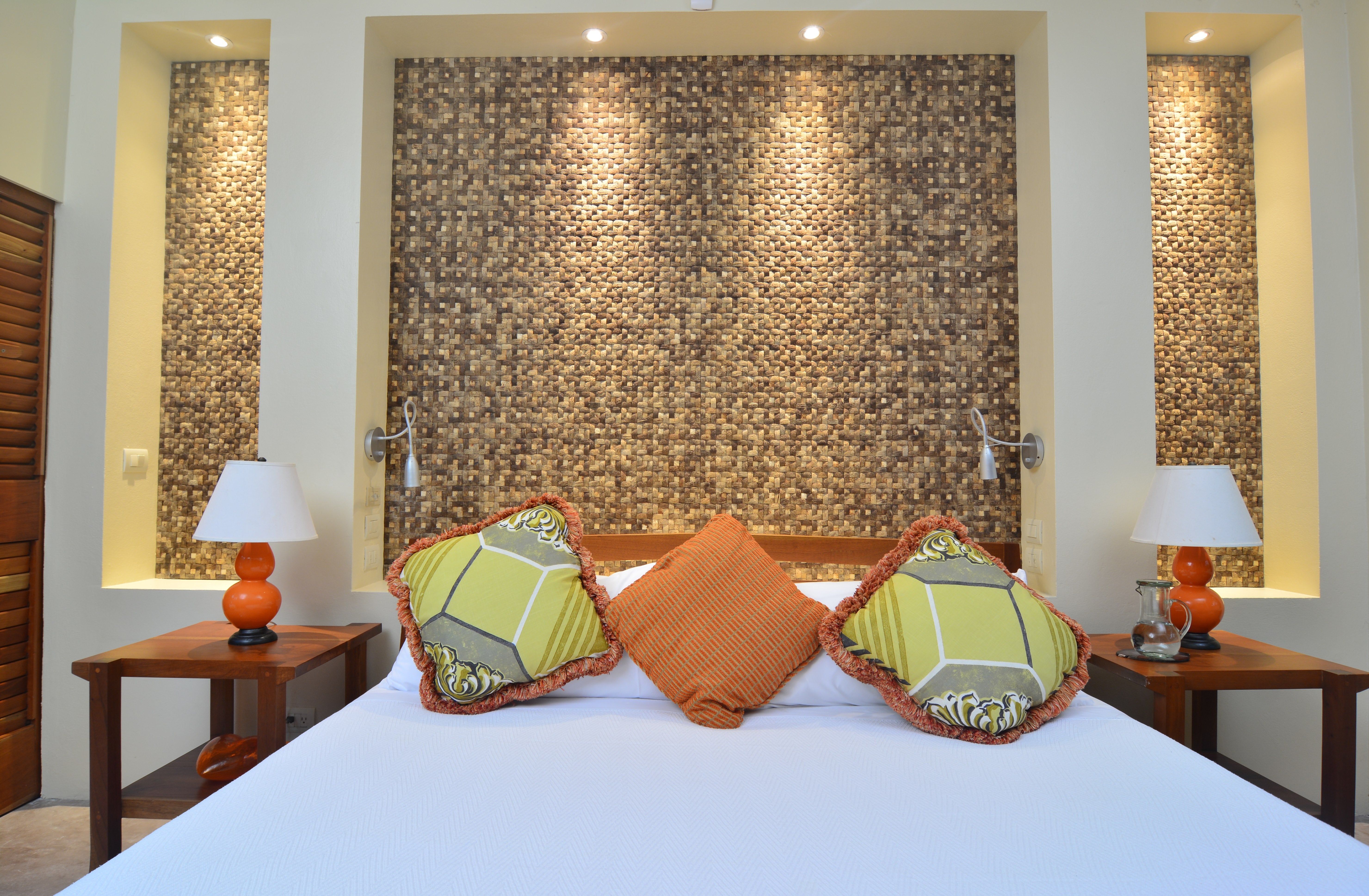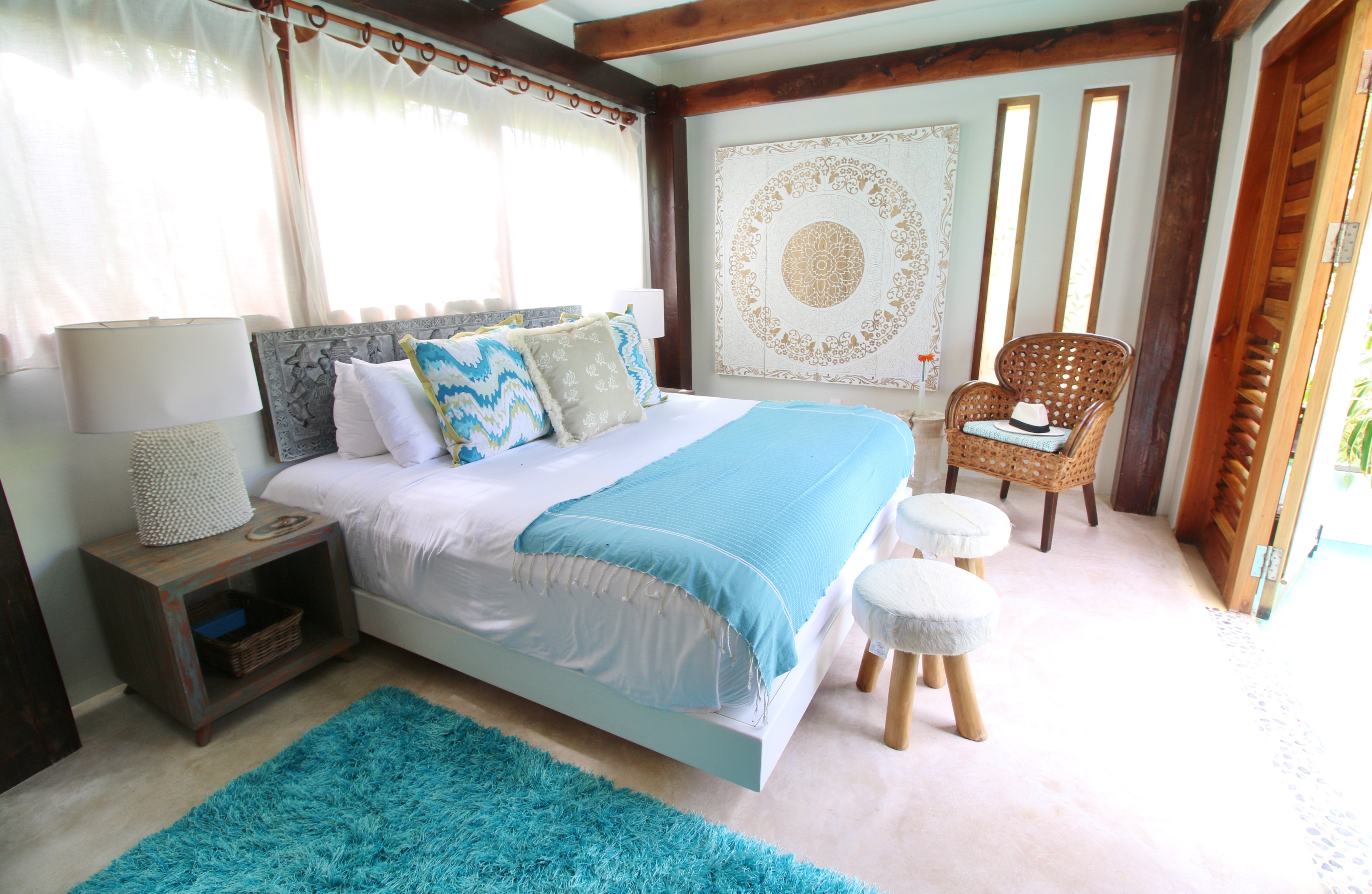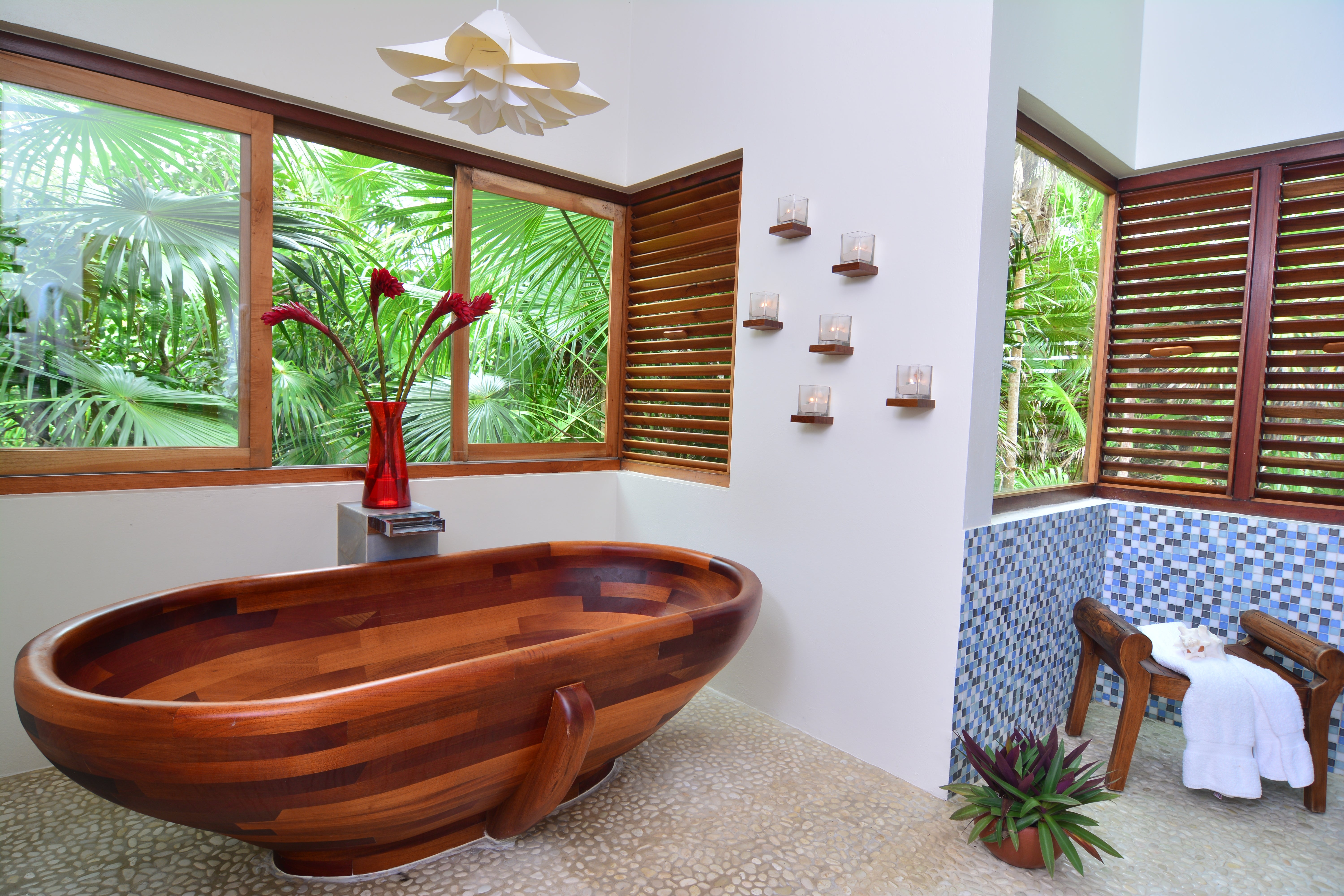 Susan Jamieson collaborated with the architect to design this four bedroom, open-concept villa resort as to minimally impact its surrounding biosphre reserve. Working with local craftspeople and using sustainable materials, Jamieson designed custom furnishings and architectural elements to mimic the tropical milieu including a handcarved mahogony tub, coconut shell headboard, concrete waves sinks and authentic palapa roofs. Overlooking the Caribbean Sea.