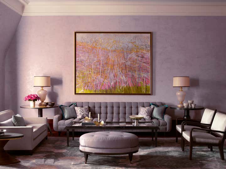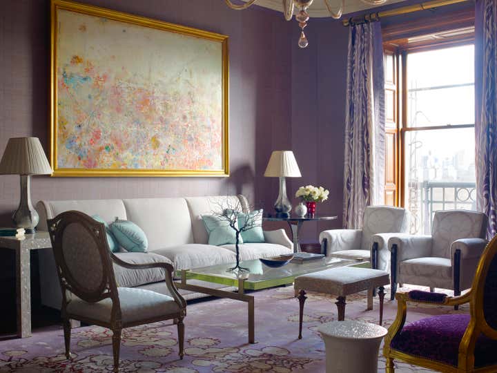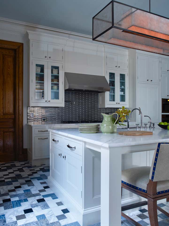 Rigorous building regulations and a complex client program posed a challenge in this in a storied late 19th century apartment overlooking Central Park. The architectural details were all maintained and gently restored, while the decorative scheme incorporates Art Deco, 1950’s and contemporary furnishings. The color palette of the en suite entertaining rooms hearkens to the 1890’s. The completely new bathrooms and kitchen also embody inspirations from the period through characteristics such as the glass mosaic in the baths, complex patterned marble and mica in the kitchen, stained oak in both.