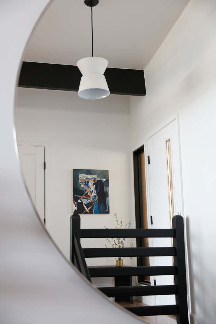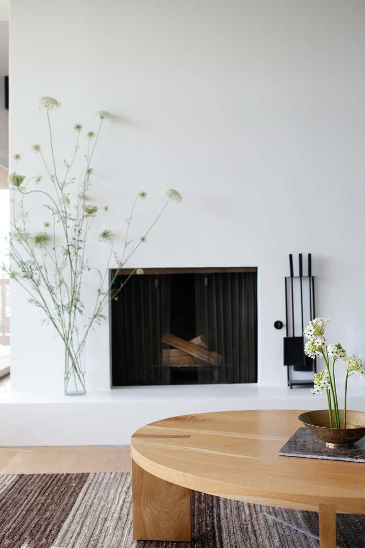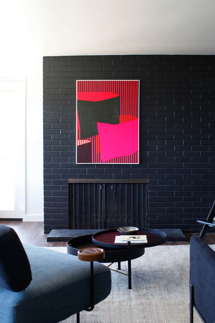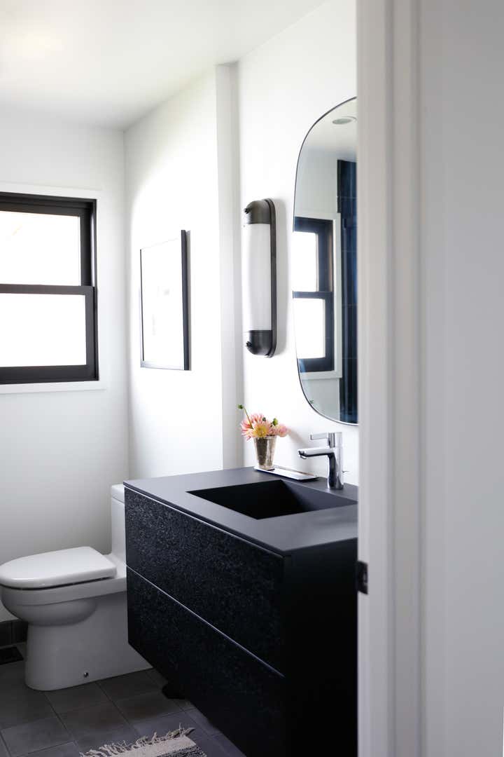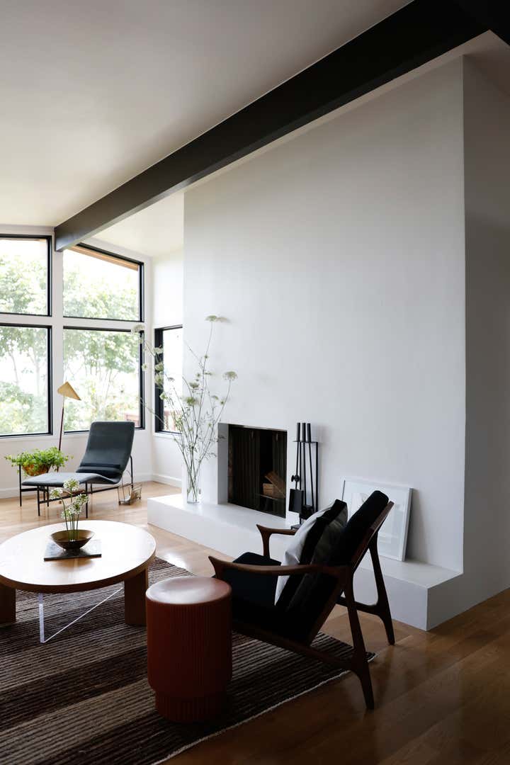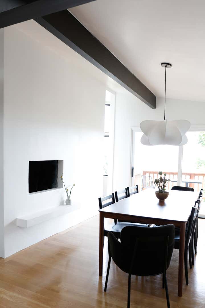A monochromatic material palette was then applied to highlight specific design details; the fireplace was stripped and became a focal point with access from both the living and dining rooms; and the kitchen was altered to face the dining room and mountain view, with all custom casework in a mid-century modern oiled walnut. The property’s upstairs took on a light and bright tone, and its downstairs a distinctly moodier palette, lending to a more navigable, livable, and overall homier experience.