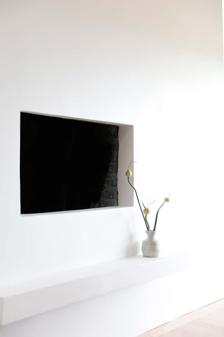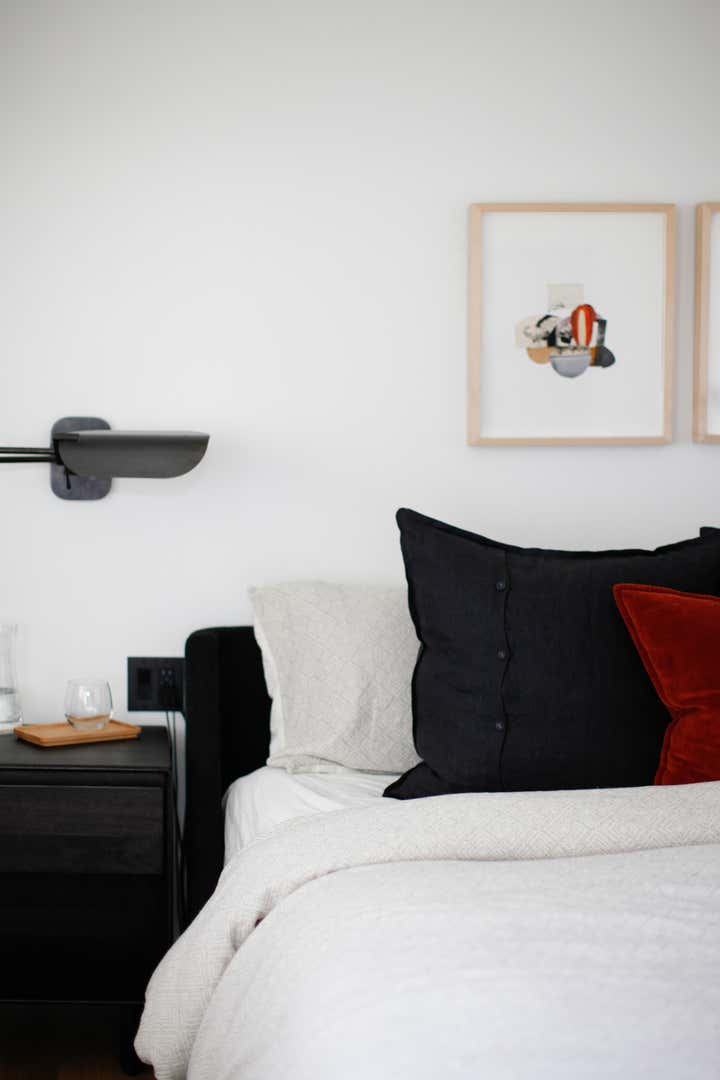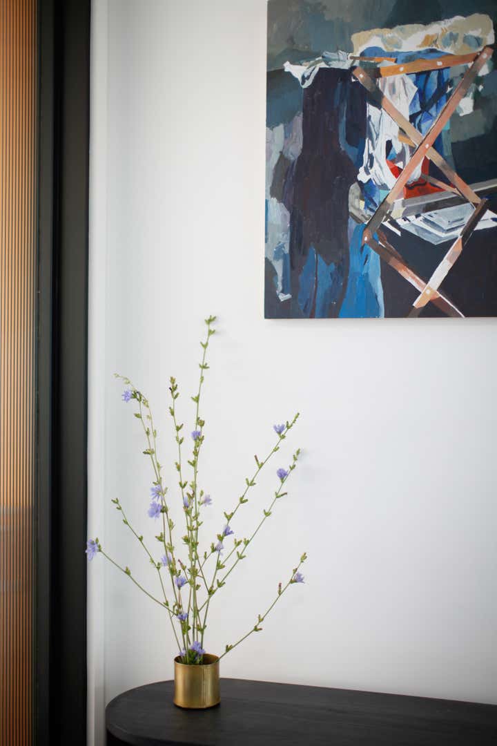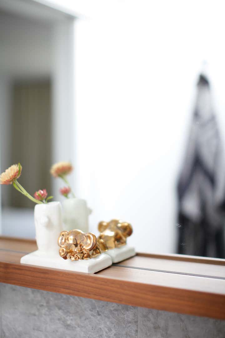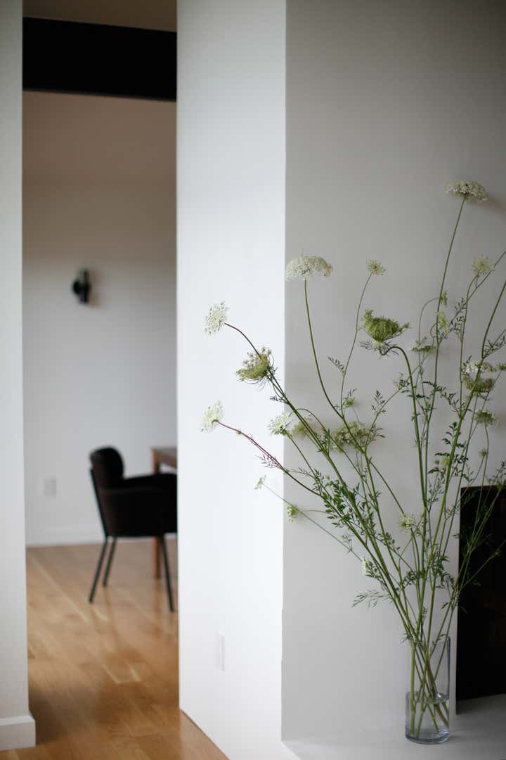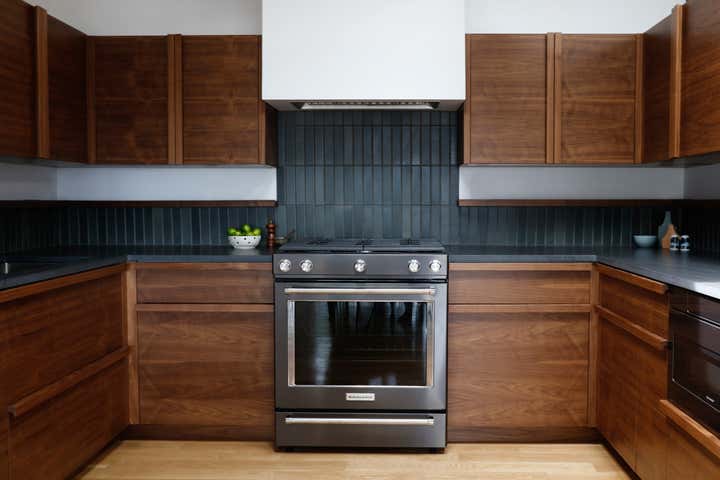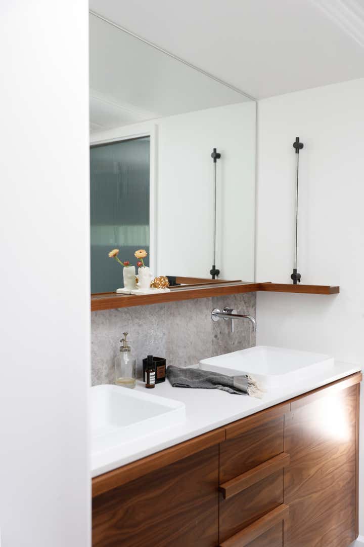 A monochromatic material palette was then applied to highlight specific design details; the fireplace was stripped and became a focal point with access from both the living and dining rooms; and the kitchen was altered to face the dining room and mountain view, with all custom casework in a mid-century modern oiled walnut. The property’s upstairs took on a light and bright tone, and its downstairs a distinctly moodier palette, lending to a more navigable, livable, and overall homier experience.