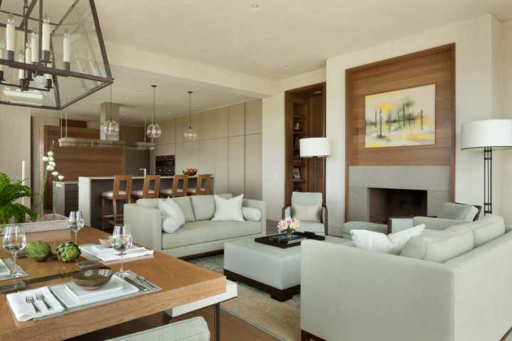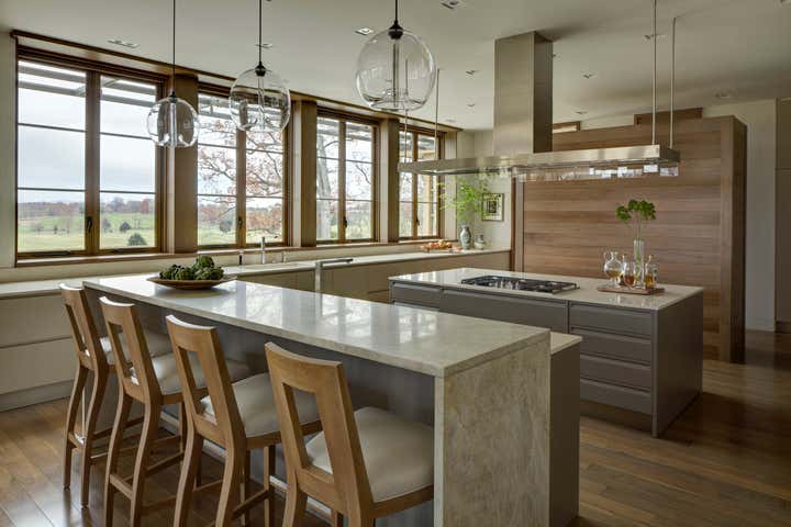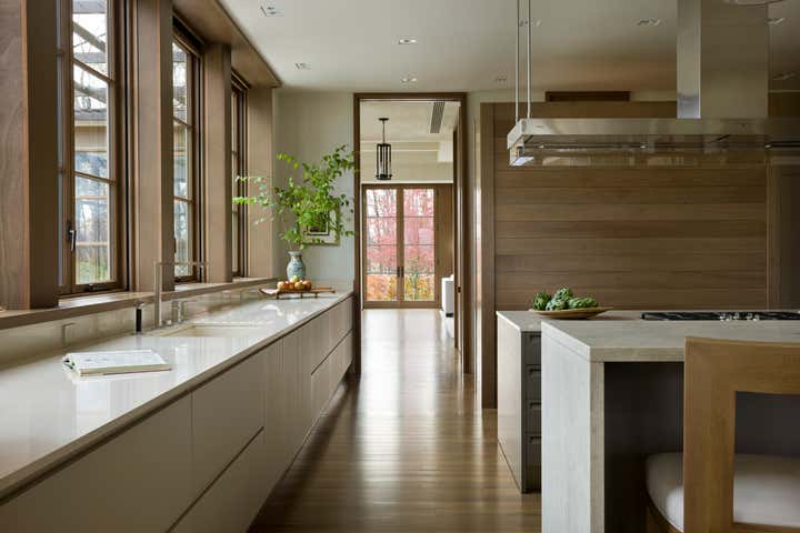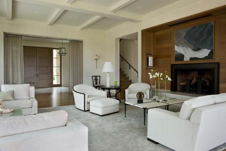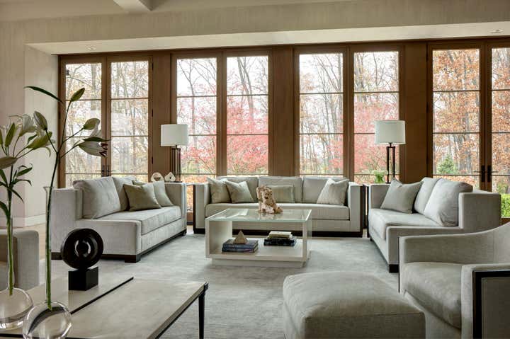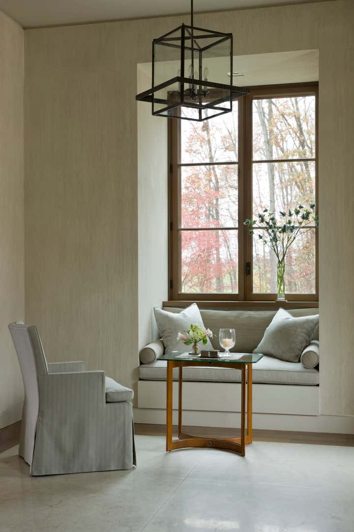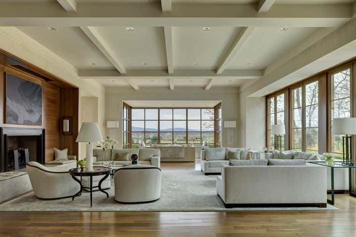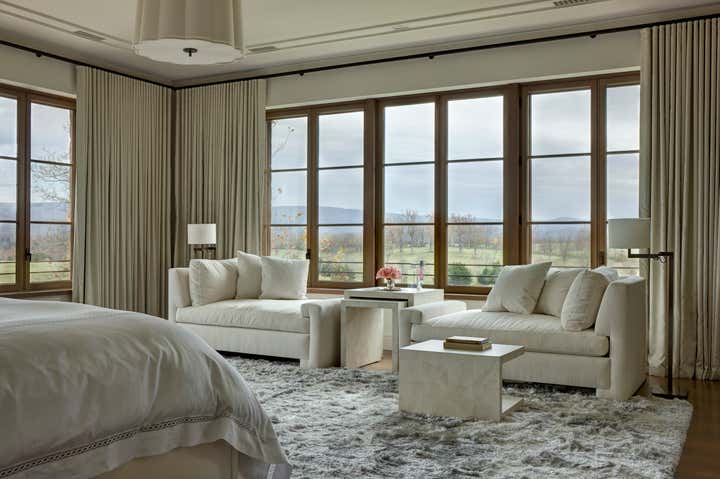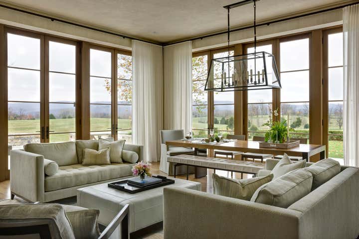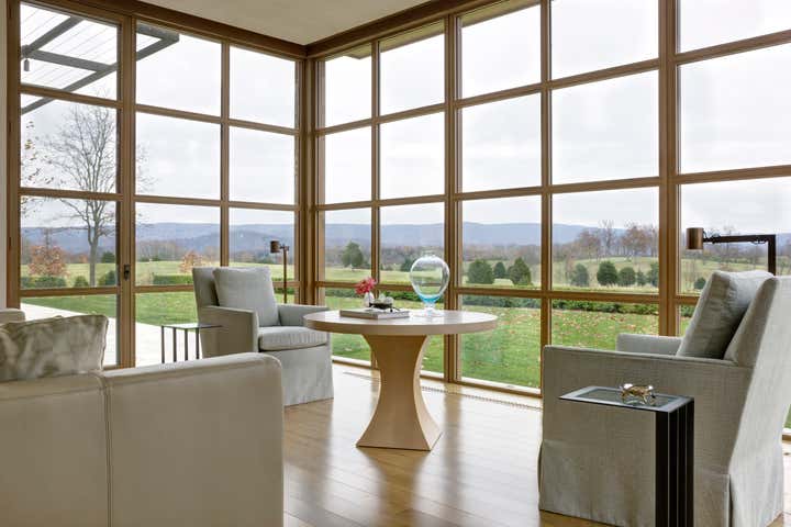 The goal was for the interiors not to compete with the gorgeous views of the Shenandoah Mountains. We chose low profile furnishings and richly textured monochromatic textiles for a serene look. Architecture by Carter Burton Architecture. Landscape Architecture by Arentz Landscape Architecture.