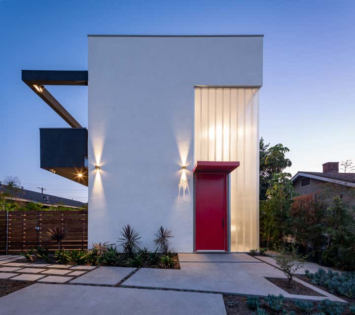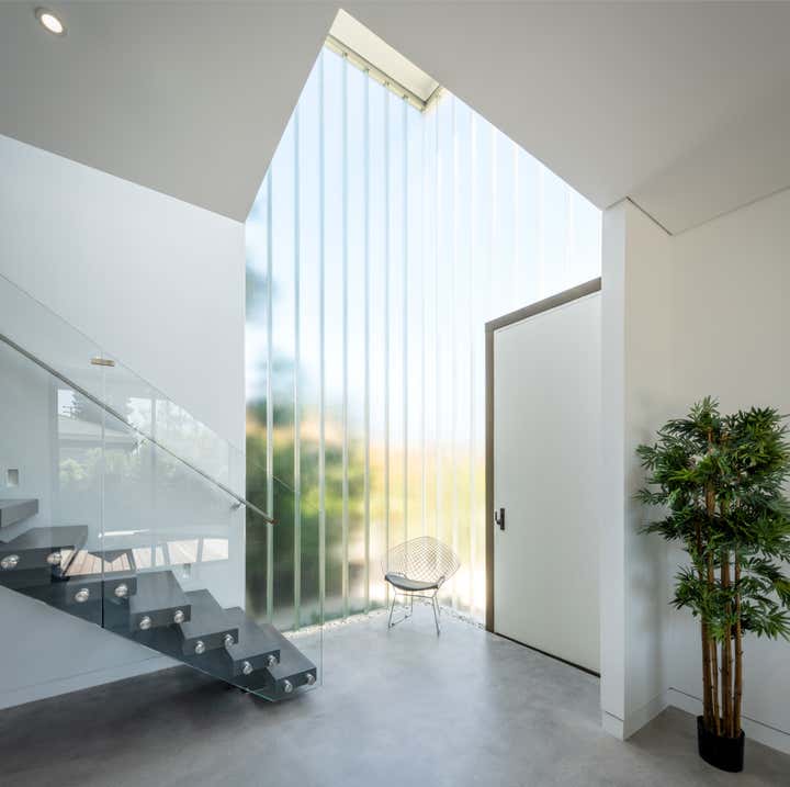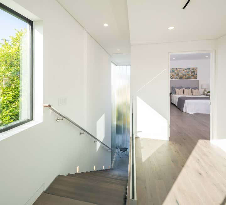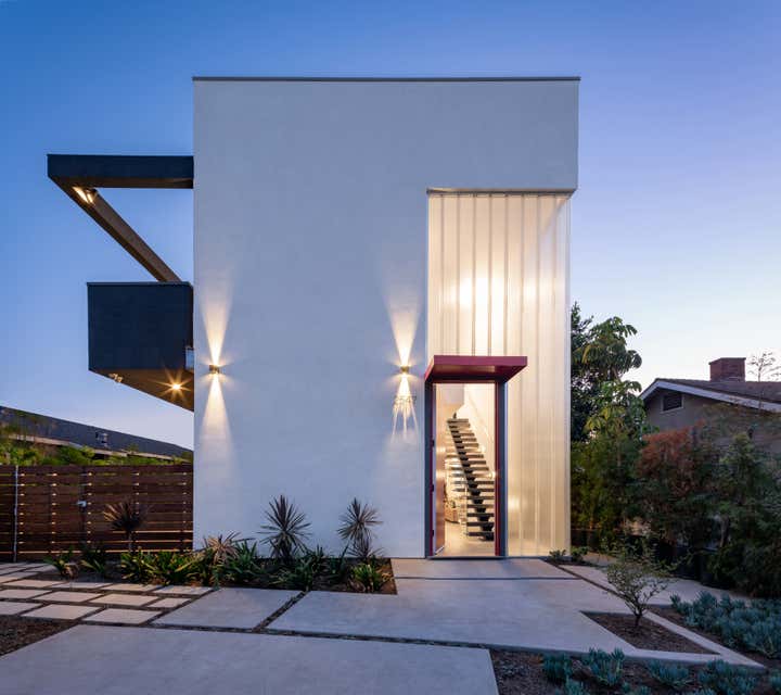 Contrary to the common trend, the main entrance street view of this Venice Beach house is closed off with a tall white two-story (28- foot high by 20-foot wide) wall. This was designed to avoid the visual blight and noise of adjacent regional commercials and to serve as a barrier. This wall closure has turned the weakest point of the site into an opportunity by making a tabula rasa statement from the existing norm. While still allowing sunlight to shine through via the channel glass at the corner, lighting the entry space.