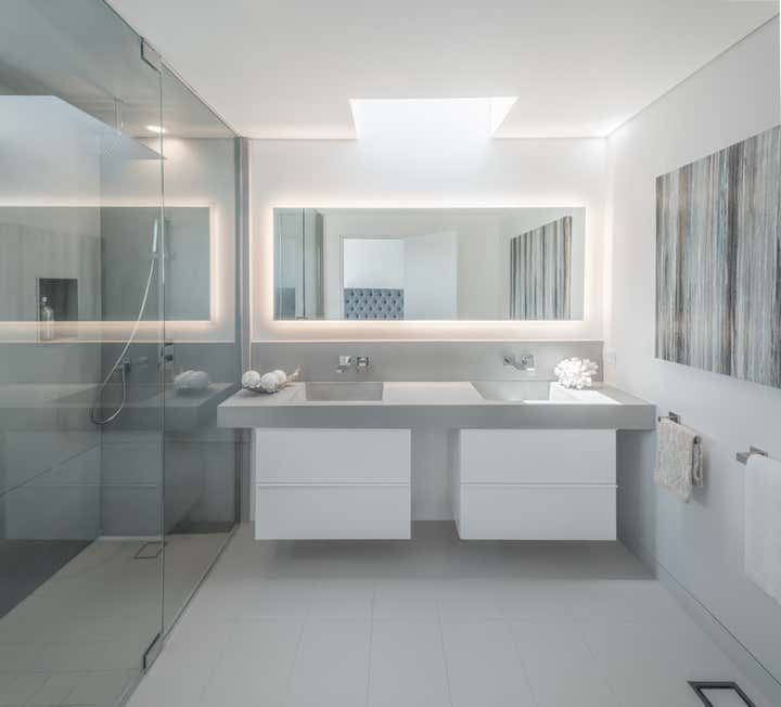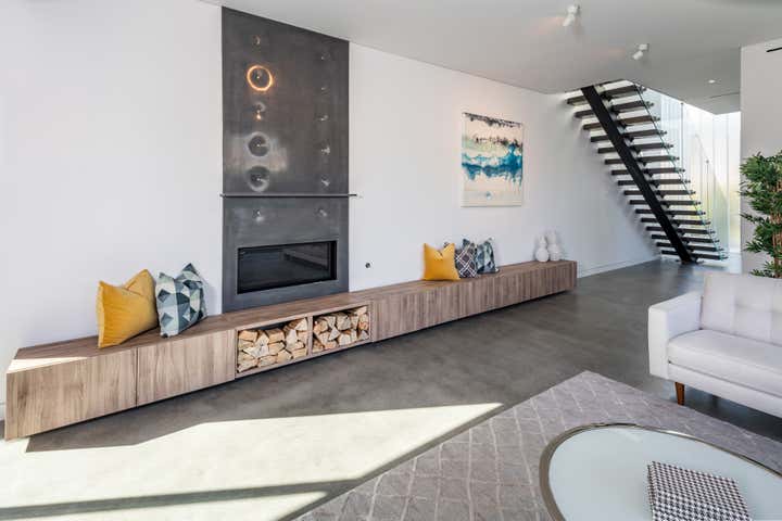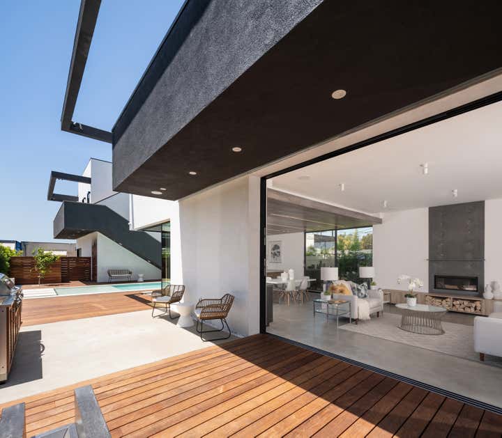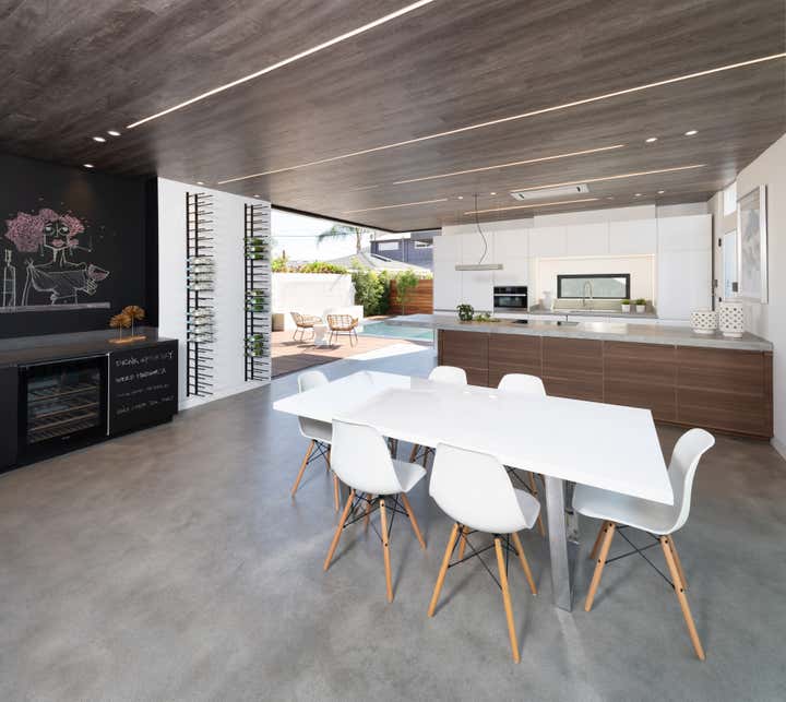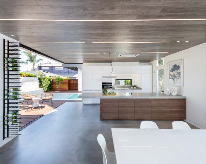 With plenty of excess setbacks provided, the interior courtyard and surrounding yards are forming an extravagant and unified open space enjoying the beach weather, sun, and water elements. Rationally, providing a 15-foot side yard when only 5-foot is required, leaves the interior space in deficit. Not in this house though! The full-height 10-feet pocket doors connect indoors to an exterior deck, allowing plenty of space for the interiors to surf into the exterior and integrate with the pool and landscaping. The use of natural materials such as wood, glass, concrete, and local landscaping emphasizes the beachy tune of the location.