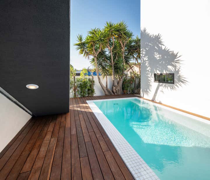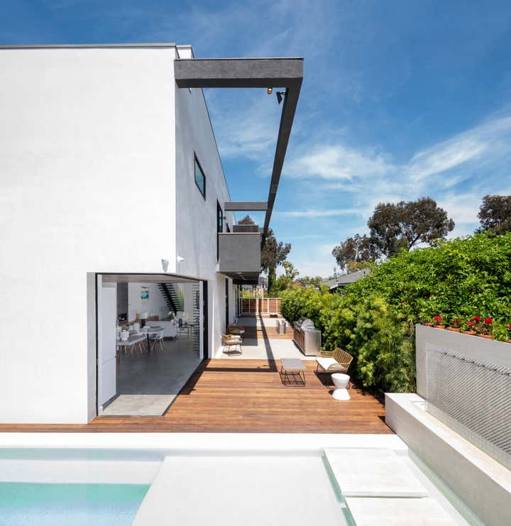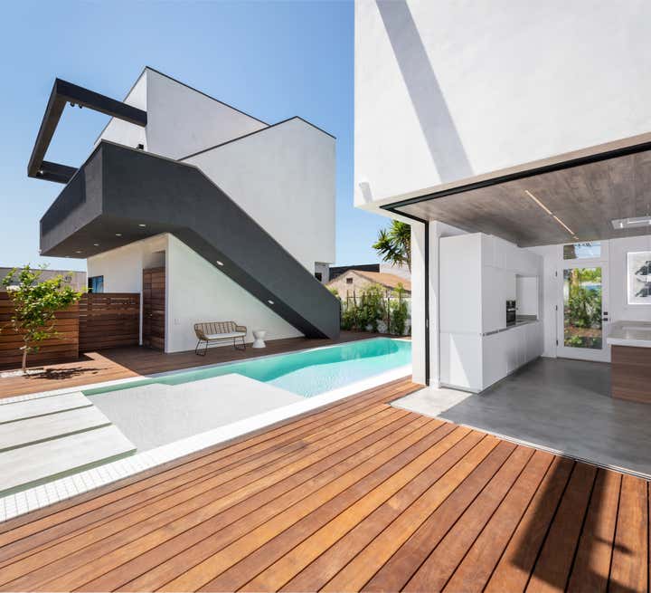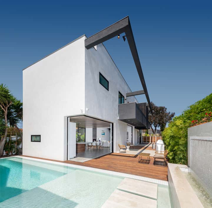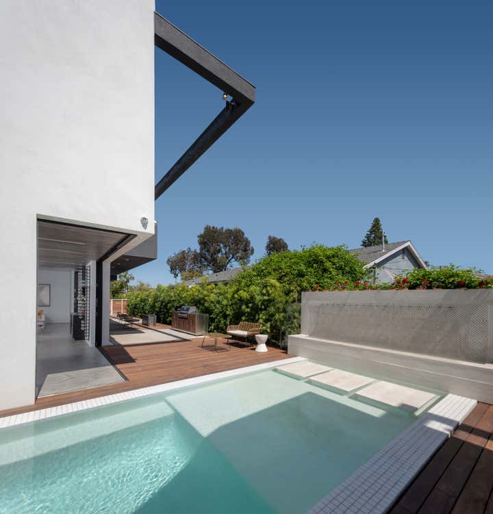 Squashed between regional and neighborhood commercial, on a 140-foot long single-family sliver; the beach house is standing as an inspiration among a single row of one-story 20s and 30s single-family houses. The first work-of-art in its neighborhood, the project elevated a dusky 1918 Venice house into a delight of beachy air, sunshine and splashing water.