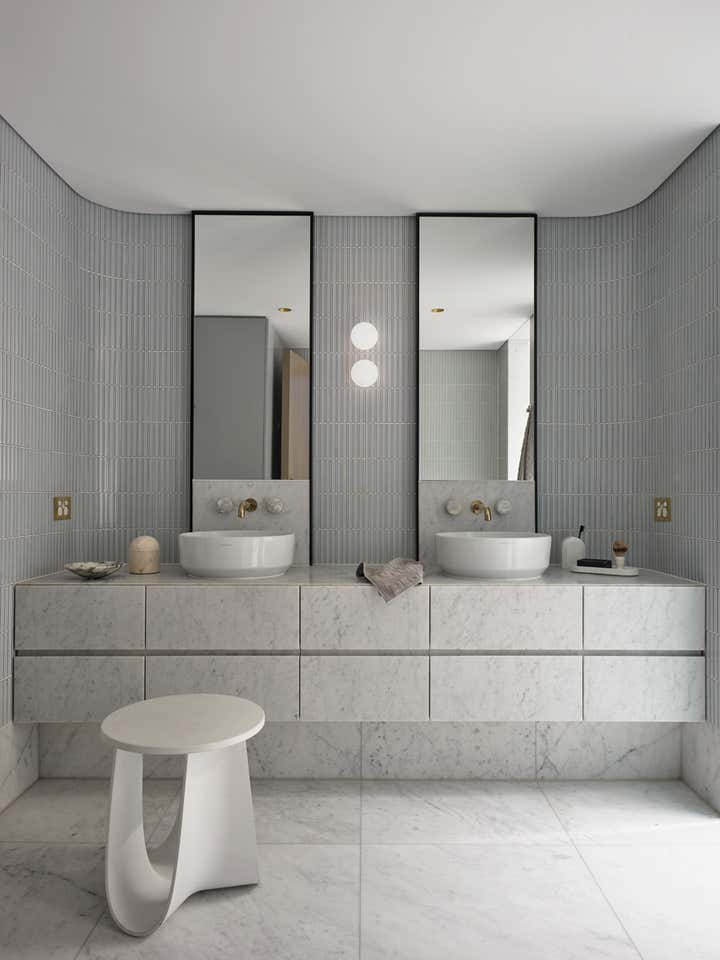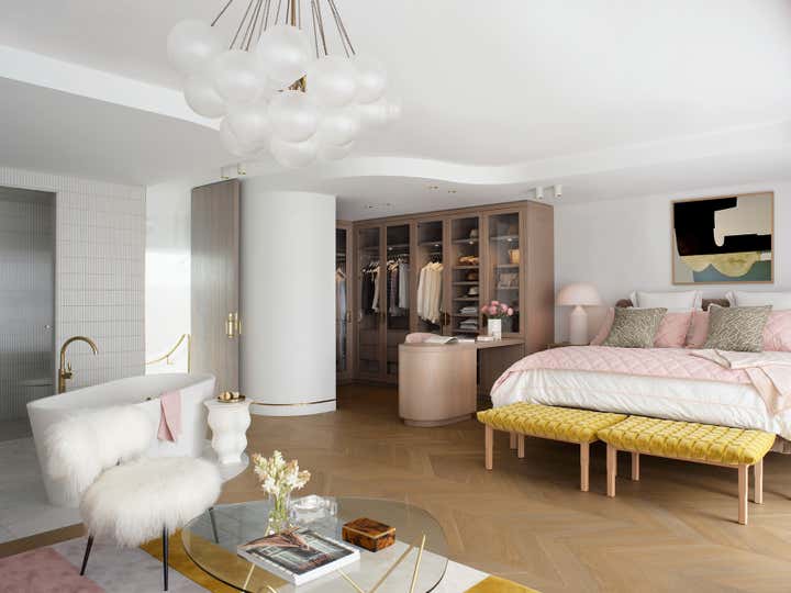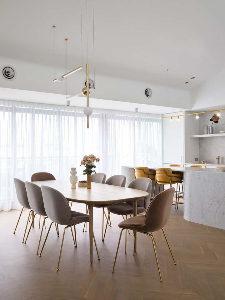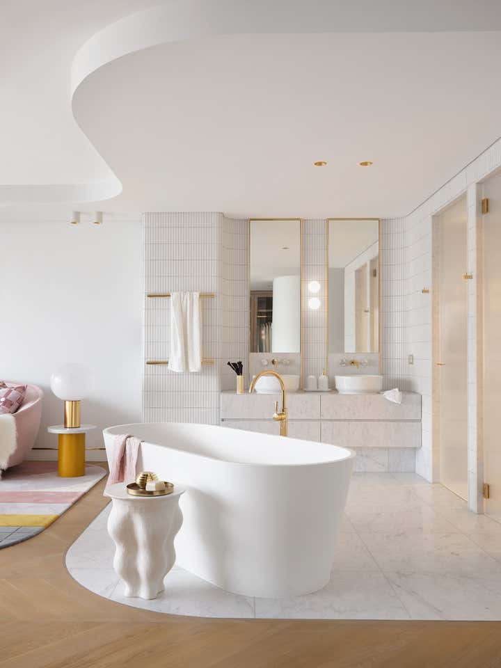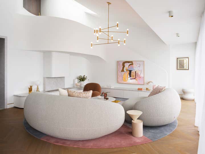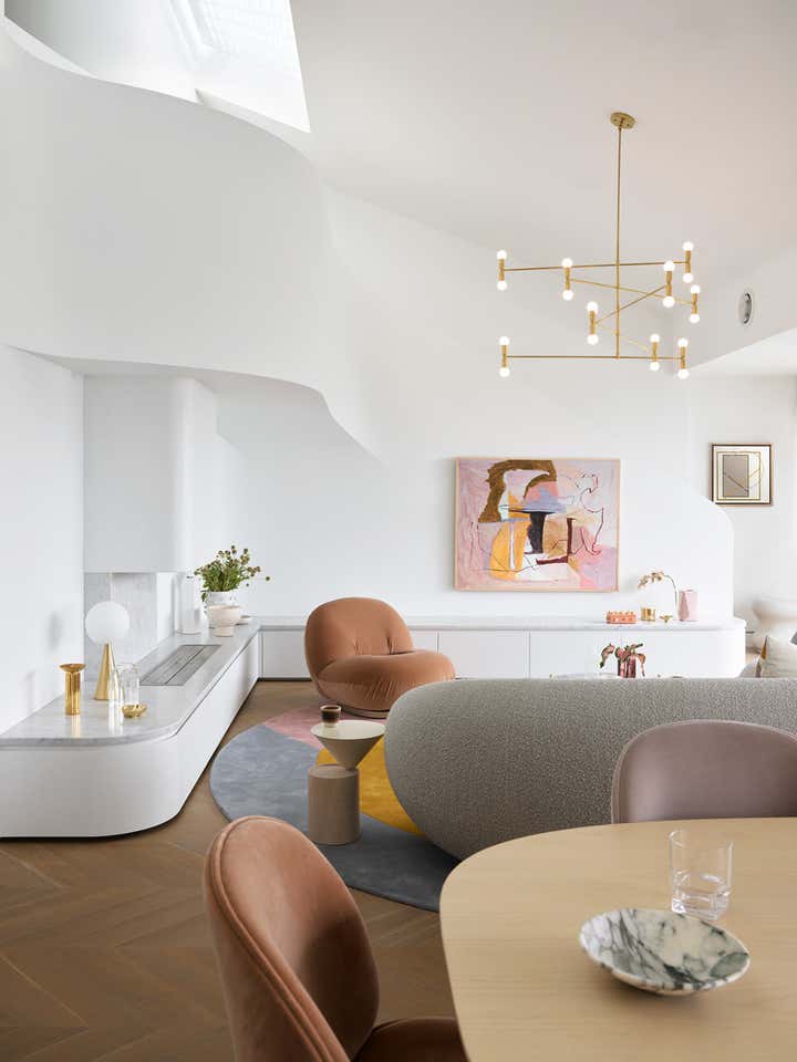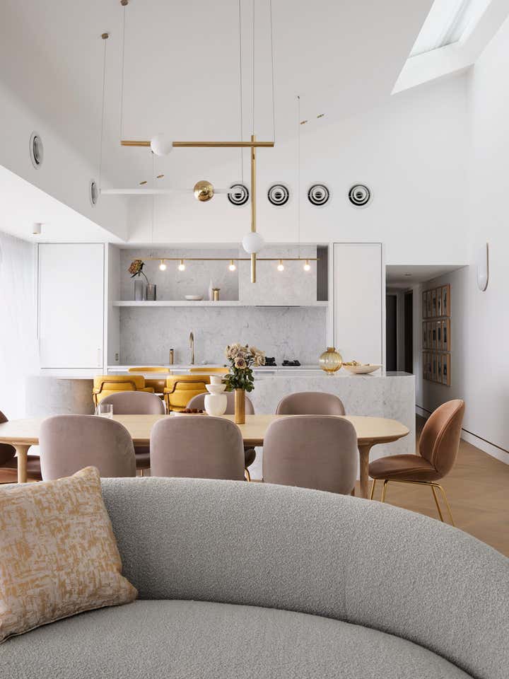 Winner of Room of the Year 2021 in House Garden’s Top 50 Rooms awards, this two-storey, three-bedroom apartment showcases the creative use of curves in a palette that merges soft pink and yellow with elegant white and grey.